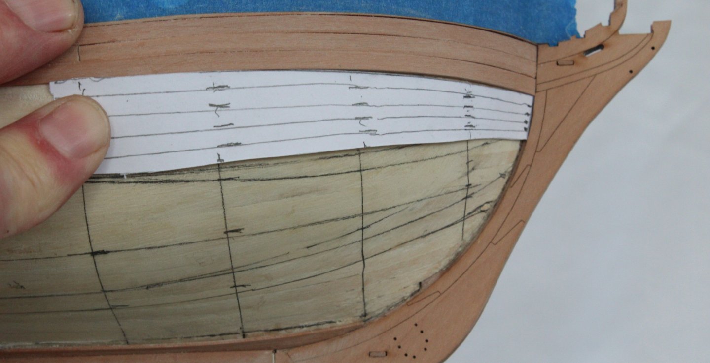 1. Build Log - Day 13 (19th Nov 2025) Task 35 – Banding Preparation After fitting the first 3 full width planks and the garboard plank I was left with a gap of 80mm to fill at the midships, which would require 20 x 4mm planks to fill. I think it will be a good idea to split the infill area into 4 bands, with each band comprising 5 planks. I took some measurements and then calculated the planking requirements. as follows: Stem Post BK 1 BK 2 BK 3 BK 4 BK 5 BK 6 BK 7 BK 8 BK 9 BK 10 BK 11 BK 12 Length To Fill 40mm 48mm 65mm 74mm 80mm 80mm 80mm 80mm 80mm 76mm 74mm 74mm 74mm Band Width 10mm 12mm 16.5mm 18.5mm 20mm 20mm 20mm 20mm 20mm 19mm 18.5mm 18.5mm 18.5mm Plank width 2mm 2.4mm 3.3mm 3.7mm 4mm 4mm 4mm 4mm 4mm 3.8mm 3.7mm 3.7mm 3.7mm I made a couple of paper templates, one for the bow area and one for the stern area. I added the required curve to the bow section template which will help with the lateral bend. Using a spare piece of 4mm planking material I made a bow plank (from bulkhead 4 to stem post) and a stern plank (from bulkhead 8 to stern post) using the above table measurements and templates as guides. I was happy with how they both looked when test fitted. The test planks, when held against the hull, both appeared a good fit, therefore I can now proceed with planking the first banding section. Photos The paper template is being checked in the photo below. I took my time to get the right shape for the top edge. The bottom edge and drawn planks could have been neater. The stern template. I did make a hash of cutting the bottom edge. I also did a test the template around the stern counter as would like to fit two planks to the outer edge before the planking has to rotate so it terminates with the bottom edge. I did purchase a set of proportional dividers to help with tapering the planks. It has been correctly set in the photo below. Test lateral bending of tapered bow plank, using the template as a guide. Test fit of the test plank, looks OK, noting it was not colour matched.
