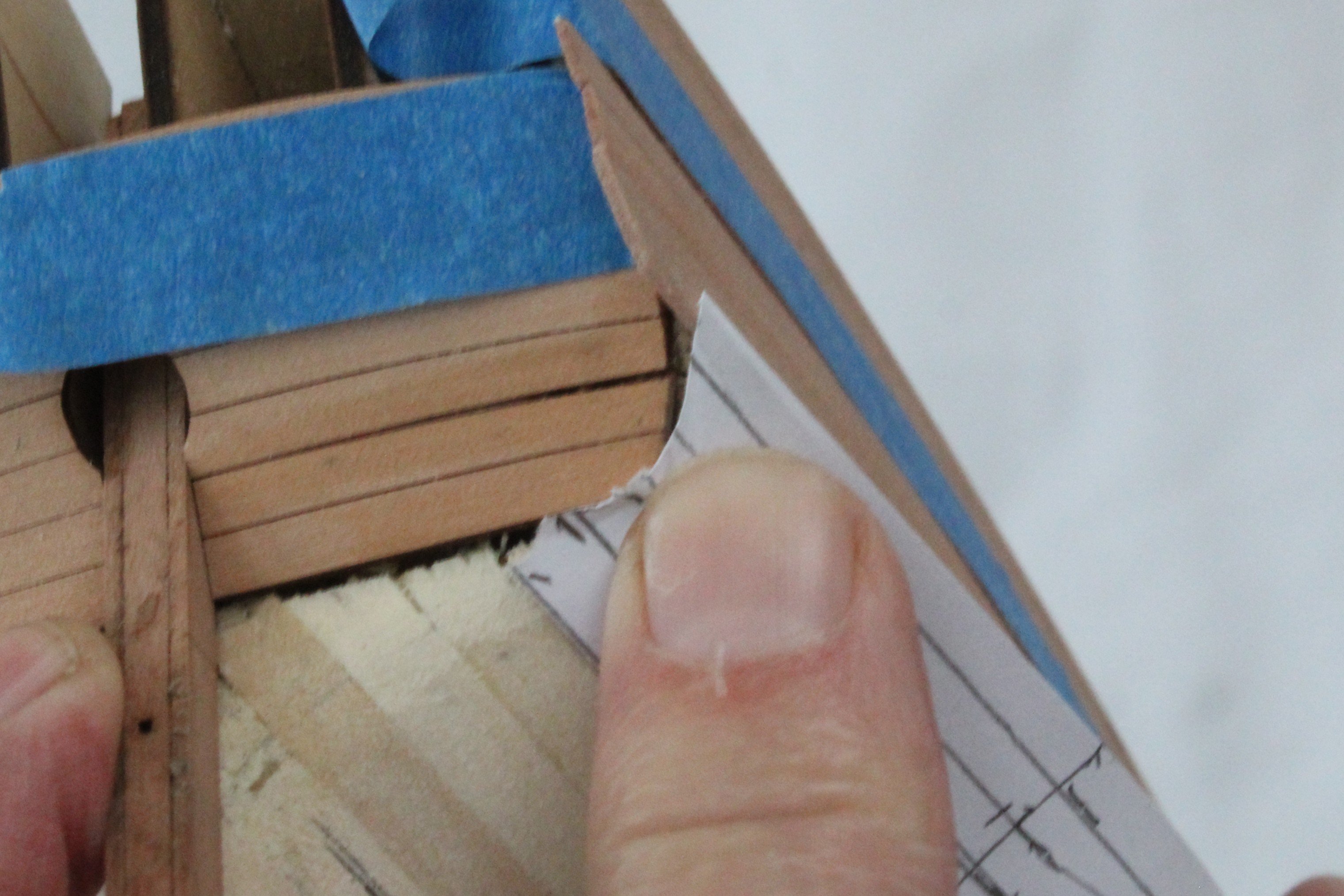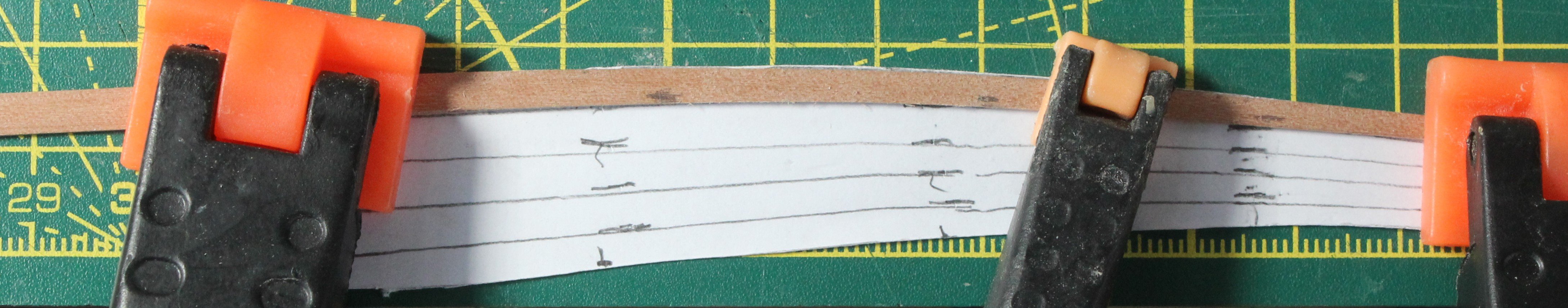 14. Build Log - Day 7 (2nd Nov 2025) Task 13 – Checking Fit of Bulwark Patterns With the bulwark patterns still pinned in place I brush some water on them and then applied heat using a hairdryer. This will, hopefully, ensure that these patterns will retain the lateral curves once the pins and bulkhead ears have been removed. After the pins were removed from the bulwark patterns, I checked the contact with the top and bottom of the various bulkheads. The lower section bulkheads 4 to 6 on the left had side were slightly raised and sat proud when a plank was laid adject to them. I brushed some glue under the bulkheads and then repined, checking the bulwarks were fully against the bulkheads. I did use a quick blast of hot air from a hairdryer to quicken the curing process. I also repeated the above process for the lower bulwark right hand pattern section from bulkhead 2 to stem post. When these pins were removed I was happy that the bulwarks were sitting tight against all the bulkheads. Task 14 – Preparation Work Prior to starting first planking Using some cardboard strips the various distances between the bulwark and keel were measured for the first 10 bulkheads. There will be 17 planking layers required, and the planks will be tapered toward the bow with the taper starting from bulkhead 4. I will taper and / or add stealers toward the stern as I go along which is my normal working process for the stern section. 1 2 3 4 5 6 7 8 9 10 51mm 71mm 81mm 85mm 85mm 85mm 85mm 85mm 85mm 80mm 17 17 17 17 17 17 17 17 17 17 3.0mm 4.2mm 4.8mm 5.0mm 5.0mm 5.0mm 5.0mm 5.0mm 5.0mm 4.7mm I then made a bow template plank (from spare planking material) which was tapered as per the above table. The tapered plank was a good fit around the bow section and could probably be glued in place without the need for the lateral (Chuck) bend. However I think the overall planking will look much better and should require less sanding / filling when complete if the planks are bent laterally. With a test plank in place the central point for the lateral bend is located, which was midway between bulkheads 2 and 3. A lateral bend was then added to the plank. I then had the idea to check the bend using the curve from the bulwark sheet cutout as an added guide and was pleased that my laterally bent plank was a good match. The laterally bent plank fitting is now so much easier. I will need to experiment with making the tight (almost 90 degree) bend for the planks which terminate with the transom before starting the planking in earnest. Photos Tapered test plank test fit, without a lateral bend, it is a good fit. Checking how the planks fit against the bulwark midships. With the tapered test plank in position the central point for the lateral bend is found. The test plan is clamped ready for the wetting and application of hot air from a hairdryer. Testing the laterally bent plank with the bulwark sheet curve, looks good.