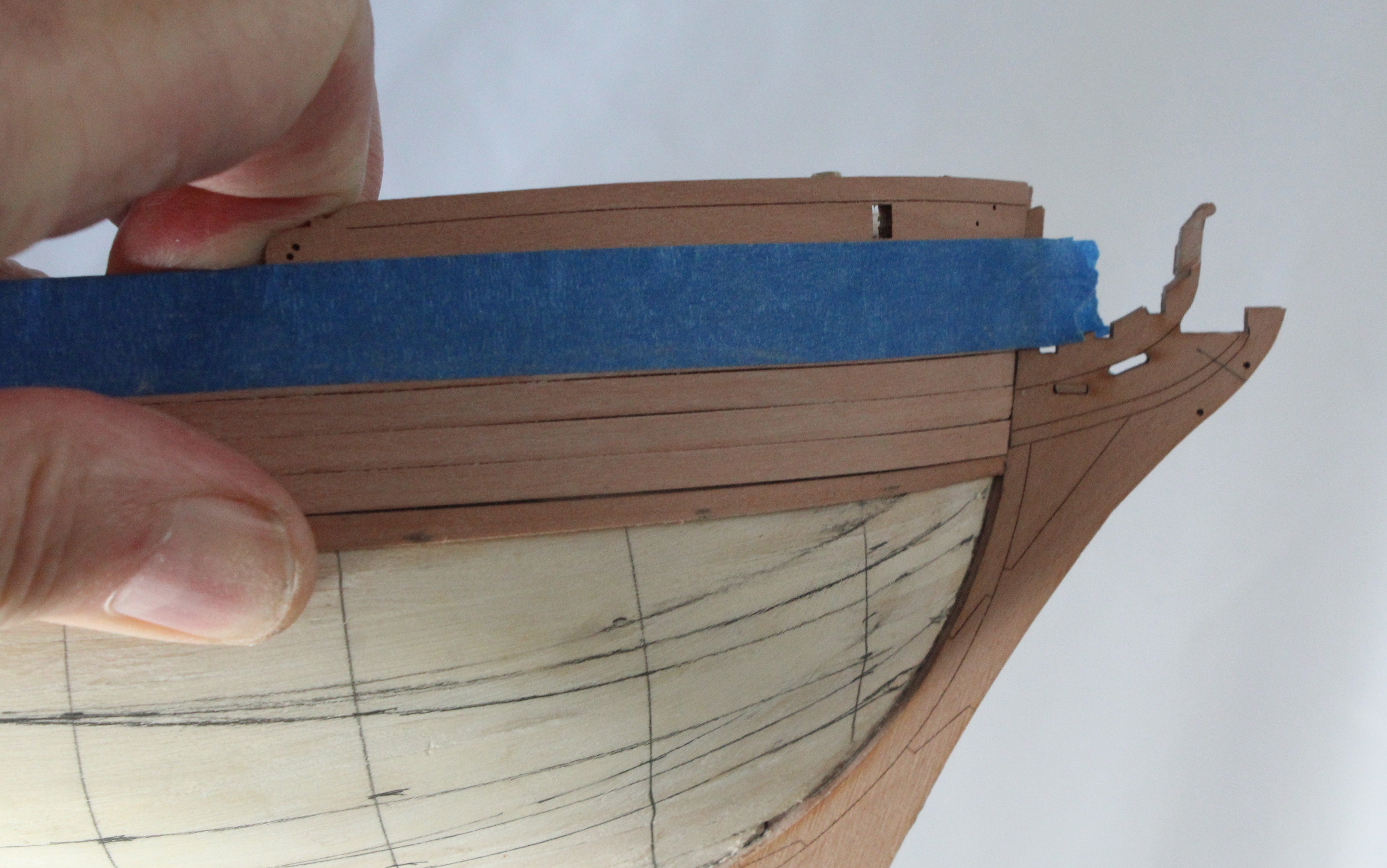 8. Build Log - Day 11 (8th- - 10th Nov 2025) Task 19 – Sanding and Filling The hull was sanded smooth, tapering the plank depth in the the dead area toward the stern post. I then brushed some water on the hull which helped to highlight gaps and depressions. Wood filler was applied and then, when set, the hull was sanded smooth again. Water was brushed on the hull once again which did show there were still some depressions. I highlighted these areas with a pencil and then filled them with wood filler. Once dried the hull was given another sand. It looked and felt smooth. It also looked Ok when water was brushed on. Task 20 – Lower Stern Counter The lower stern counter needs to be bent to follow the curve of the stern frames. The pattern was soaked in hot water for 45 minutes and then strapped to bottle. The bottle had a very similar shape to the stern frame. And just like @DelF the pattern cracked along one of the lasers etched lines. As this pattern will be painted it should not be a problem. Task 21 – Stern Post The three outer patterns were glued to the stern post and once set the stern post was glued to the hull. Task 22 – Keel and Stem Post Pattern Test Fit The outer keel and stem post outer patterns were test fitted so the rabbet could be checked. Using a test plank, I was happy with the rabbet. Task 23 – Test Fit Outer Bulwark Patterns The outer bulwark patterns were test fitted. They looked good and aligned perfectly with the gun ports and window openings. As they had not been bent around the bow it was not possible to check the alignment with the catheads and hawse holes. With the patterns slotted in the rabbet it did appear they were not aligned. However, when I made a cardboard template using everything did align up perfectly. As the template is not as thick as the actual pattern it might mean a simple bevel will be required. Most testing required to make sure I can make the right adjustment to the actual patterns. In the build manual it does state that: “Some adjustment at the bow may be needed as we’ve left a little extra material to allow for variations. Photos The first photo shows pencil marks where there are some depressions. The stern area. The completed hull after the first planking had been sanded smooth. Bending the lower stern counter pattern, the crack along one of the laser etched lines can be seen. The stern post has been glued in place. The keel outer pattern have been test fitted. The outer patterns have been test fitted to the stem post. The outer bulwark patterns test fitting The bow section of the outer pattern does not seem to align. Using a template of the outer bulwark pattern.