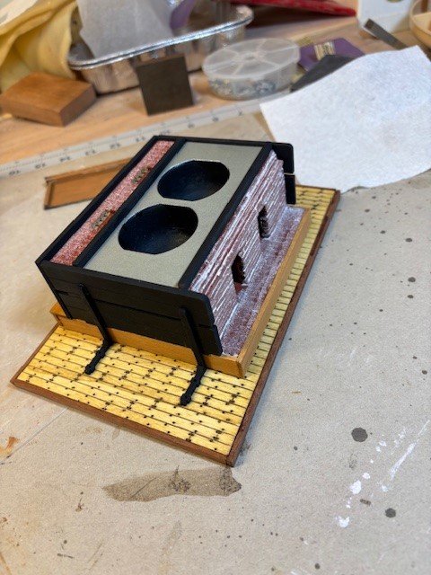 Finished the bricks, sprayed automotive red primer, spackled and wiped it down, then added the pots to the top.