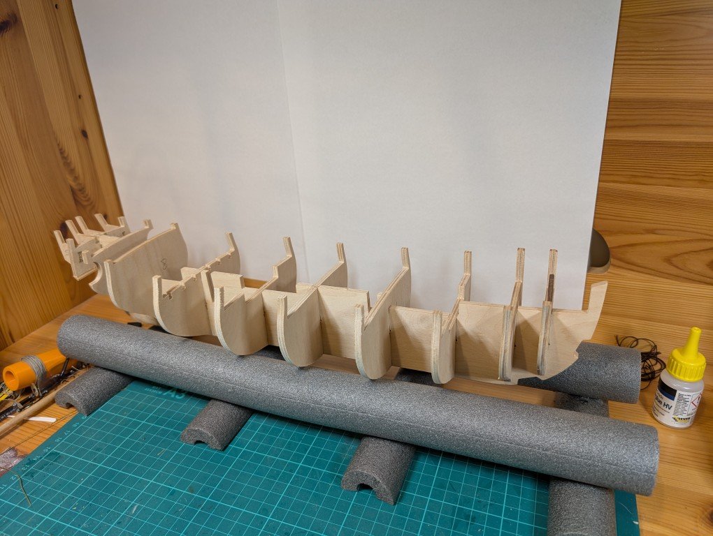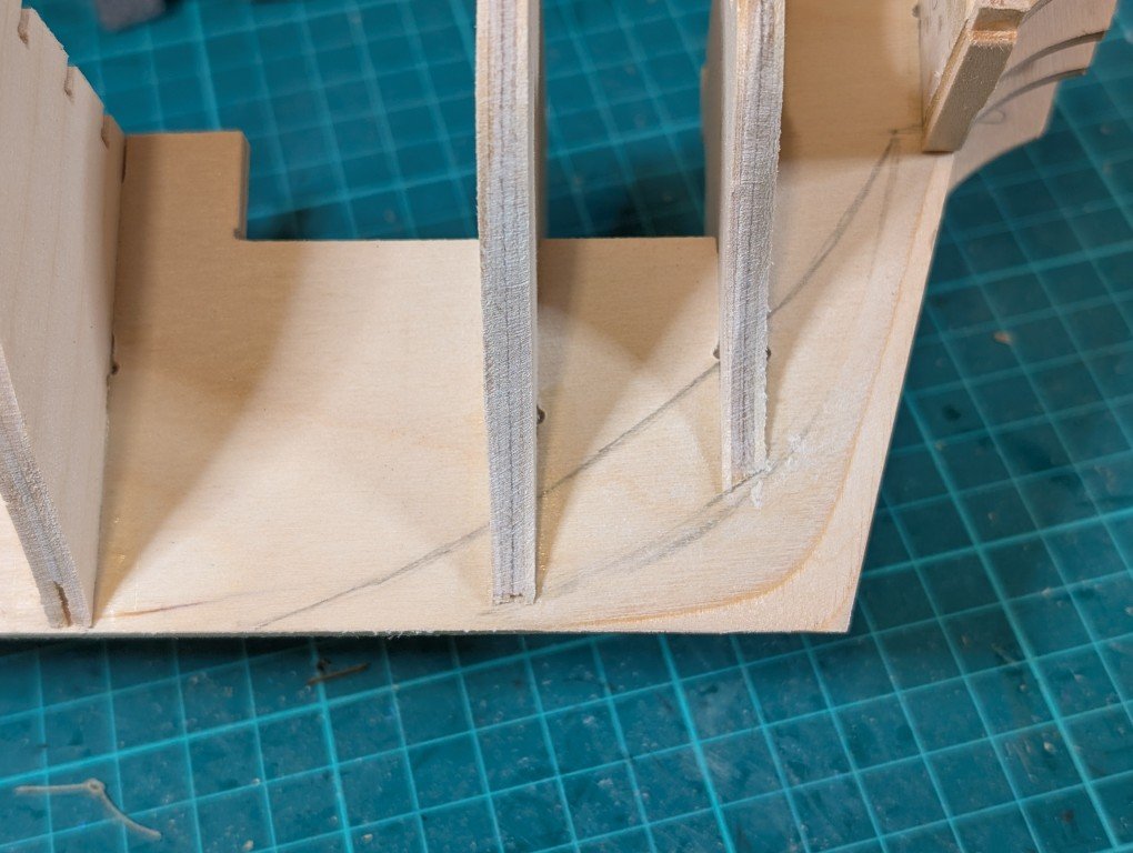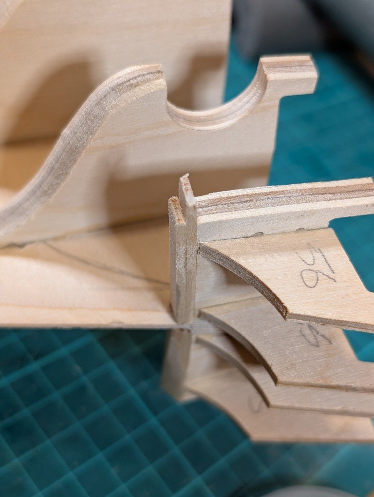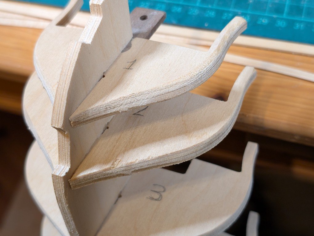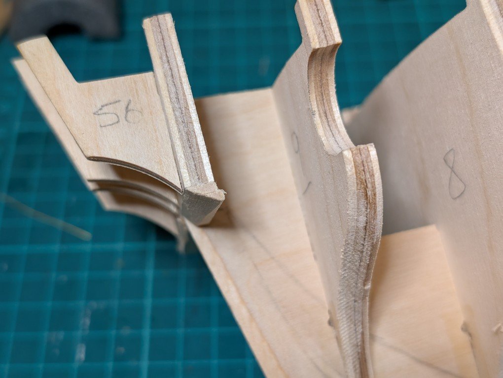Just a quick update as to where I've got to. As it turns out, not very far The bulkheads are fitted to the main keel. I've decided not to fit the walnut stem and false keel yet until all the fairing is completed as I think it would be too easy to damage these parts when sanding the bulkheads. Below is a photo of my attempt at fairing to my repositioned bearding line Bulkhead 1 coarsely sanded to start the fairing process. I've had trouble understanding how the final bulkhead 10 can be sanded during fairing as there isn't any material below the stern's transom. So what I've done is to add some scrap wood which can be tapered down to provide a little more material for the planks to attach to. It might turn out that this isn't required but I would rather add it now just in case it is required. Hope to post another entry soon. Regards Geoff