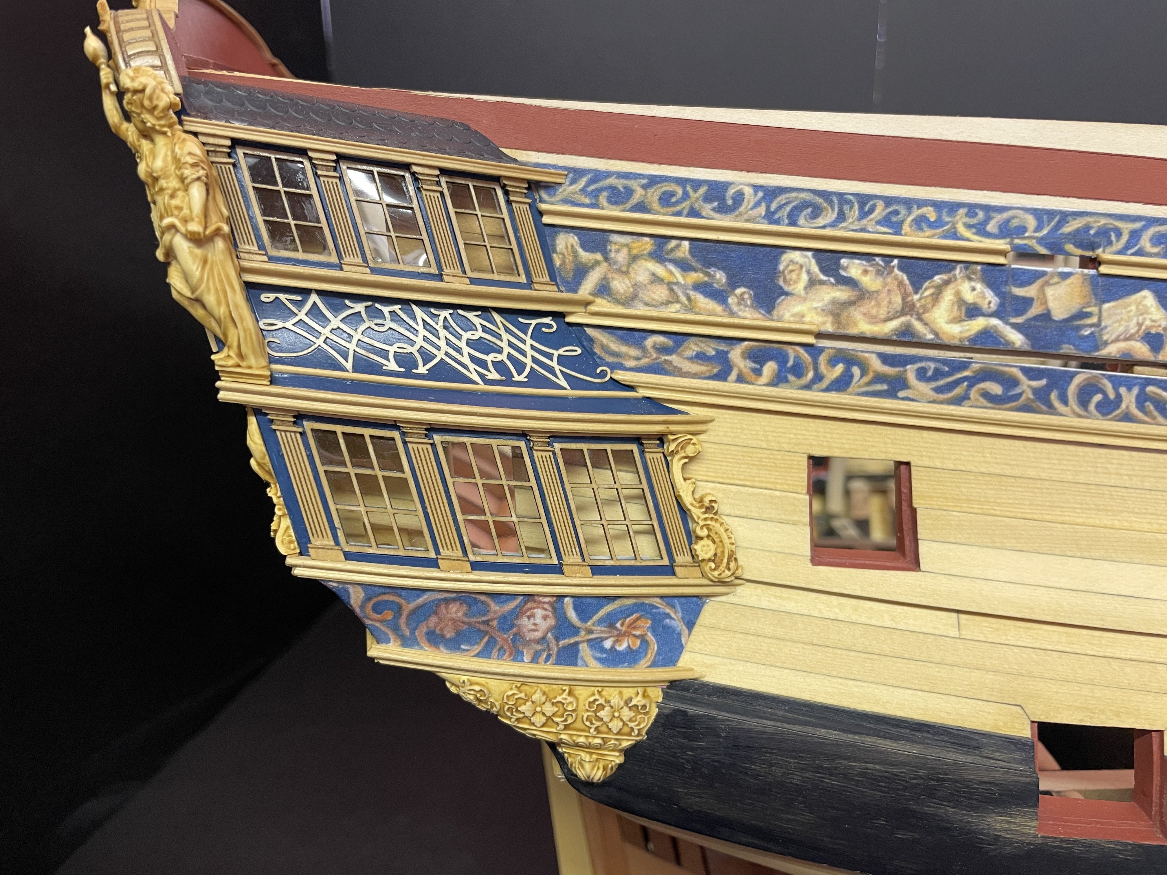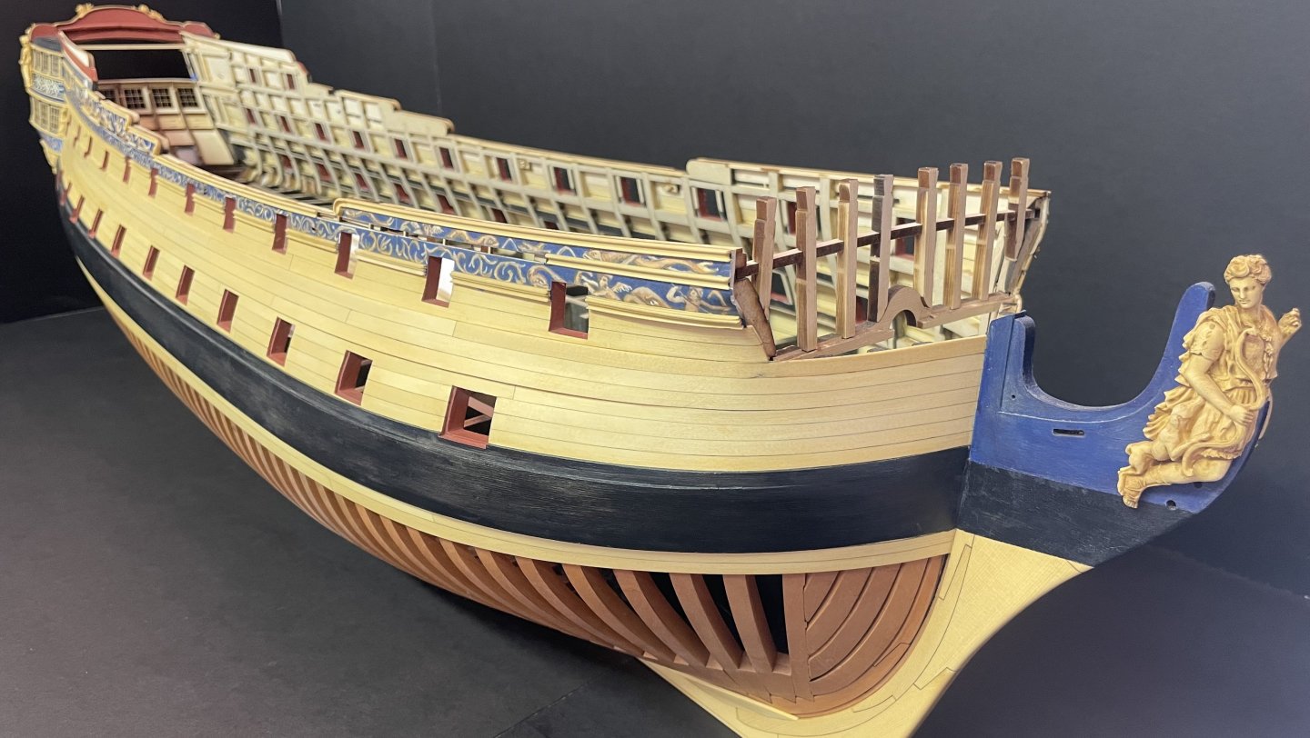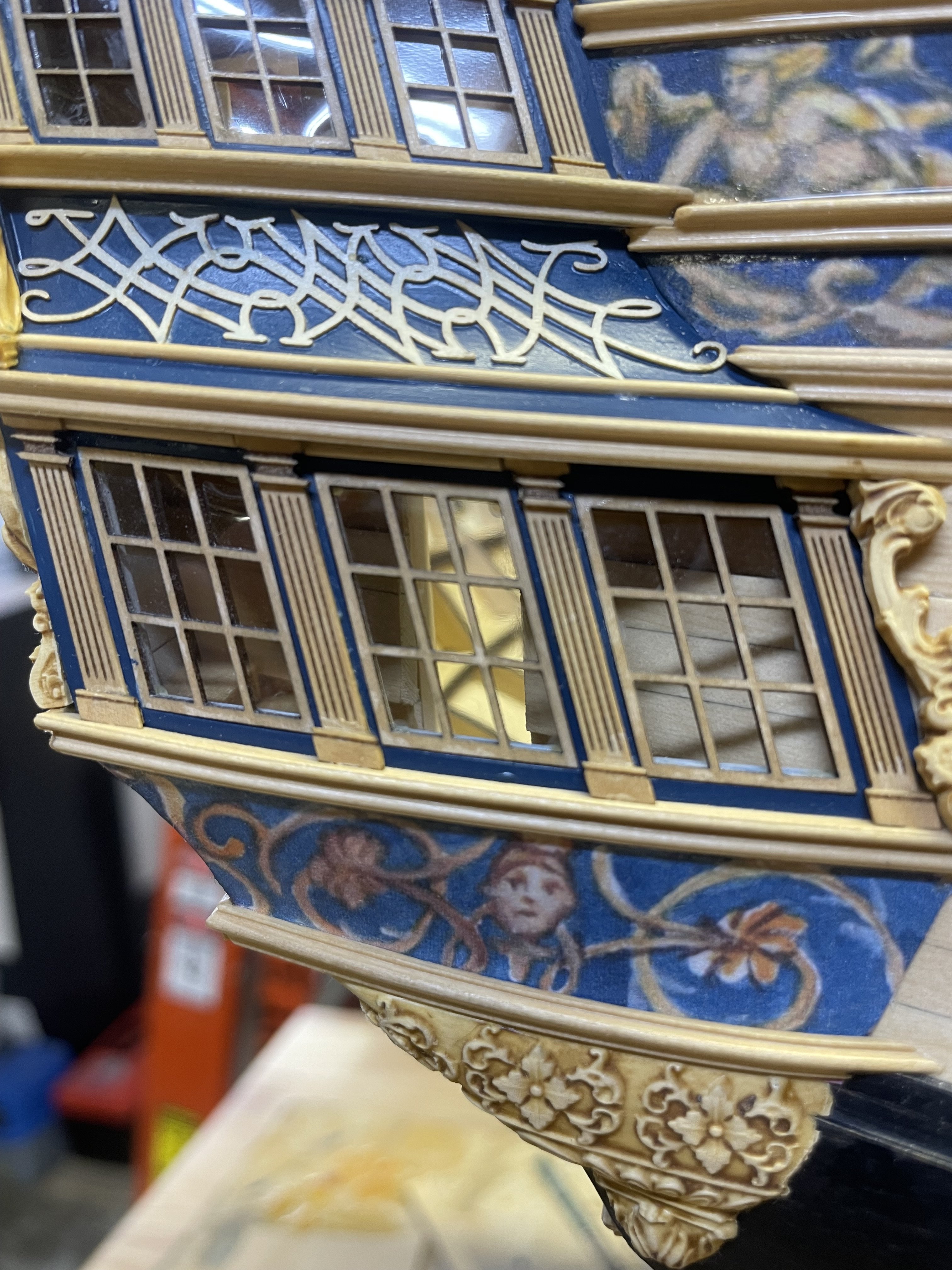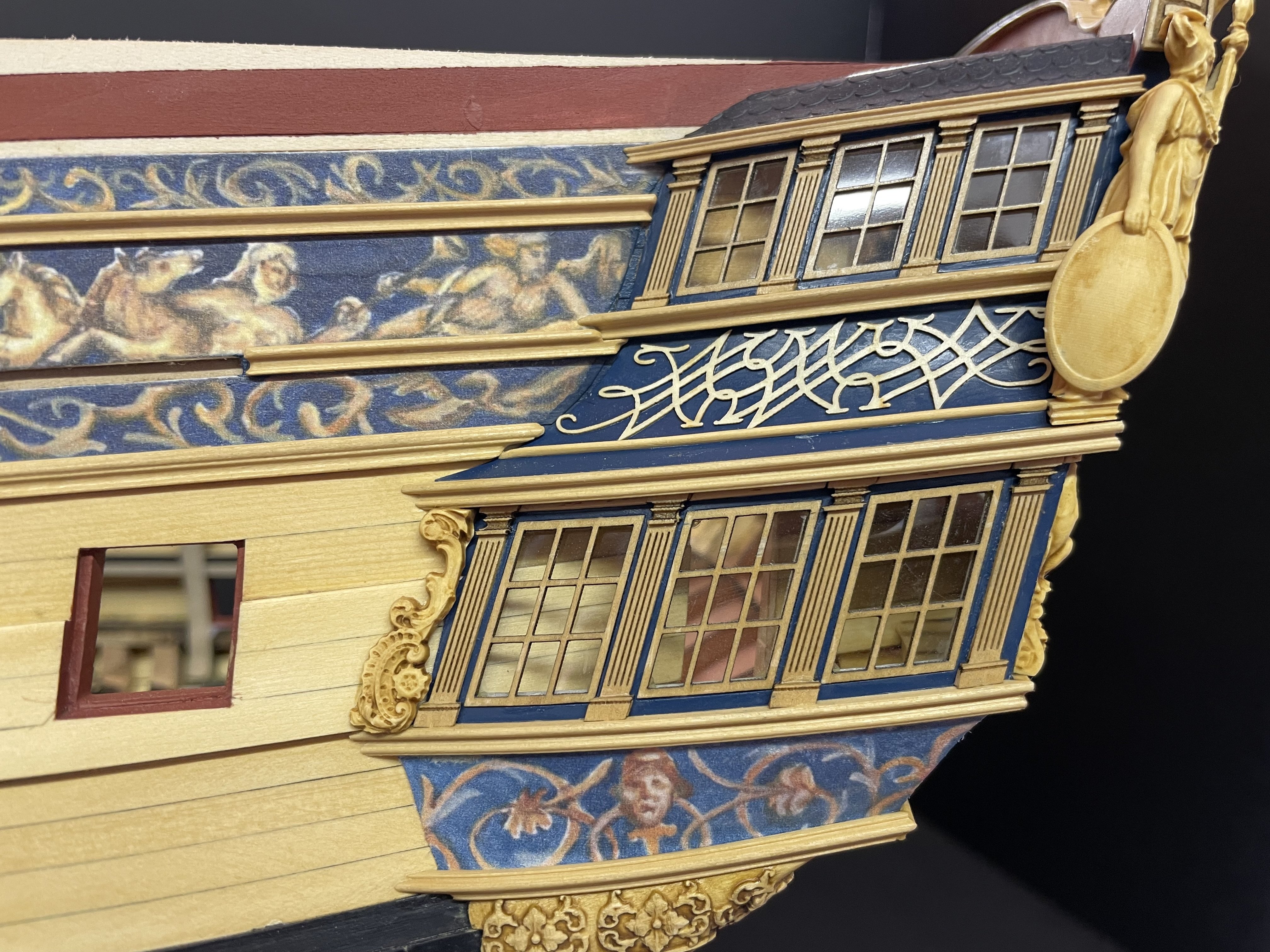 Almost finished with Ch 3. Need to add some strips to the QGs, a smaller frieze on the QG roofline and the stbd side upper molding and scrolls.