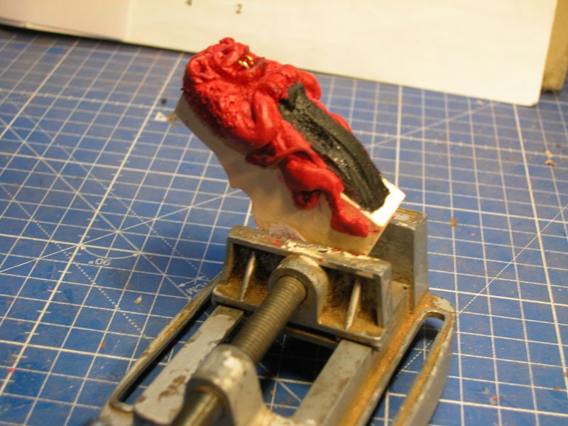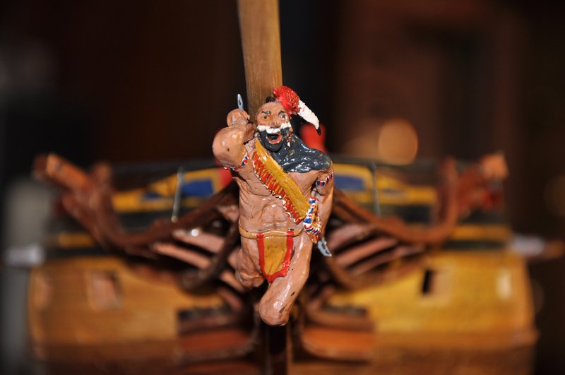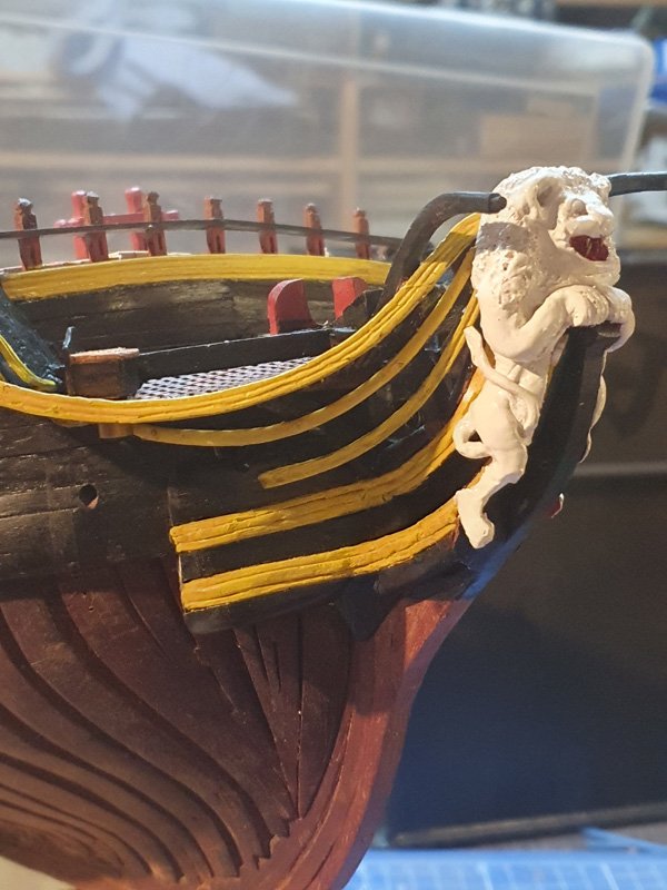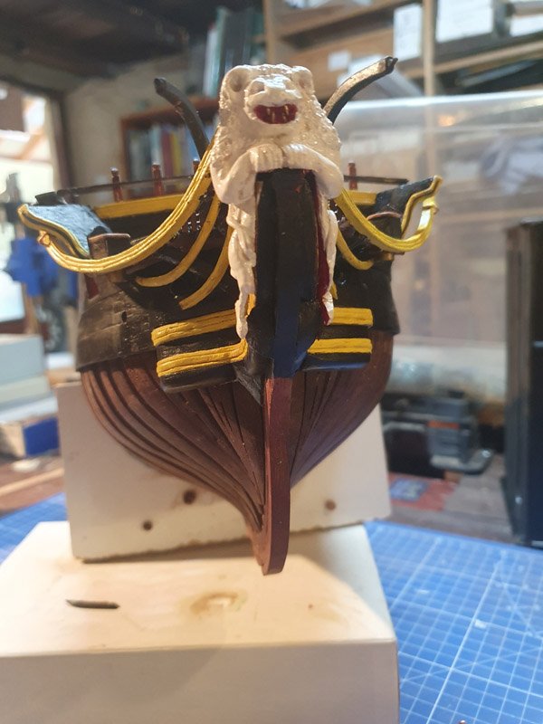 I had a rush of blood to the head and tackled the Lion and I won. I am no woodcarver but have used Sculpy to make decorations and figureheads before. Here is a fierce murderin' Mohawk from my Essex To make the lion figurehead I took a plasticine mold from the cutwater and head rails and cast it in resin. I then molded Sculpy around the cast and shaped according to plans. The Sculpy was cured with a hot air gun and painted off white. I think it looks more like a lion than a teddy bear. Cheers Dick