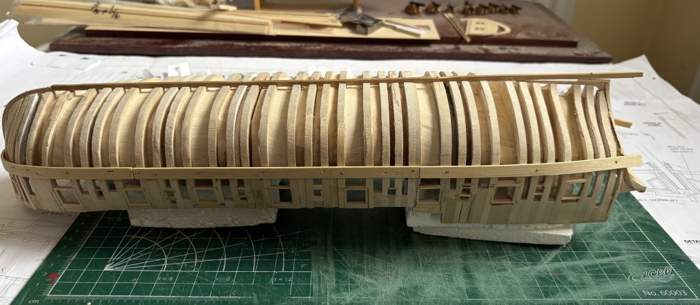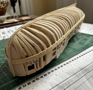 Another summer with no modeling due to an injury. But I’ve been feeling up to modeling again and my next focus will be on the quality of my work. I made frames (18) for each gun port. I think this will give a better look when all the planking is done. Also, I’ve begun sanding the hull in preparation for planking the outside above the wales. A lot of work levels and width of the bulkwarks. Still more sanding to go.