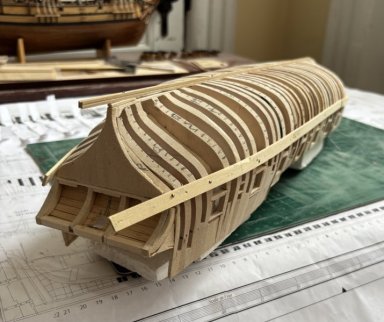 I’ve glued the pieces to make the stern half of the galley. All the pieces had to be adjusted and sanded to make a smooth half-hull. I’m using a technique from an article by Richard Simon in the Nautical Research Journal, Summer 2023, Vol. 68, No.2. which simulates a POF scheme. I thought it would make the creation of the gun ports easier. For the stern, I’m using a POB technique. This model is using a lot of different techniques. It’s kind of a hodgepodge of different ideas from various sources. And the model requires lots of sanding. My shipyard is getting layers upon layers of sawdust; I’m going to have to spend days doing a complete cleaning up once the hull is finished. (I am doing some cleaning up each day, but not a major effort.) Included are the water boards at the rear of the deck. I made them without edge bending since the basswood wouldn’t hold the bend without breaking. I may make the board thinner towards the stern to match the plans. They aren’t glued yet.
