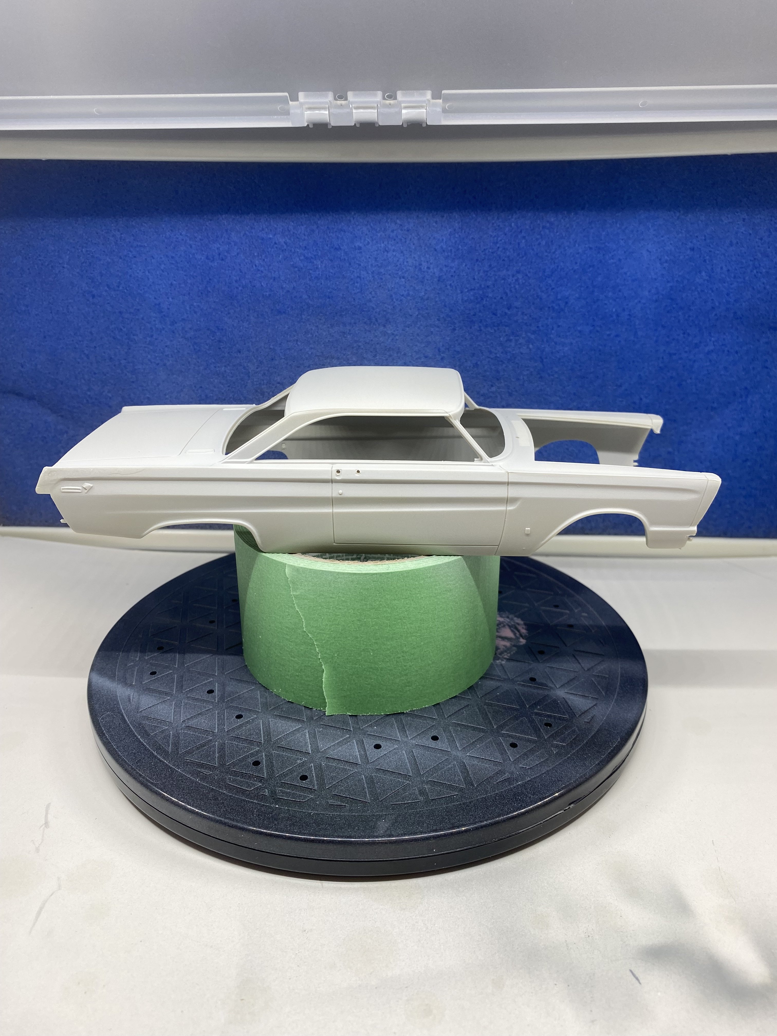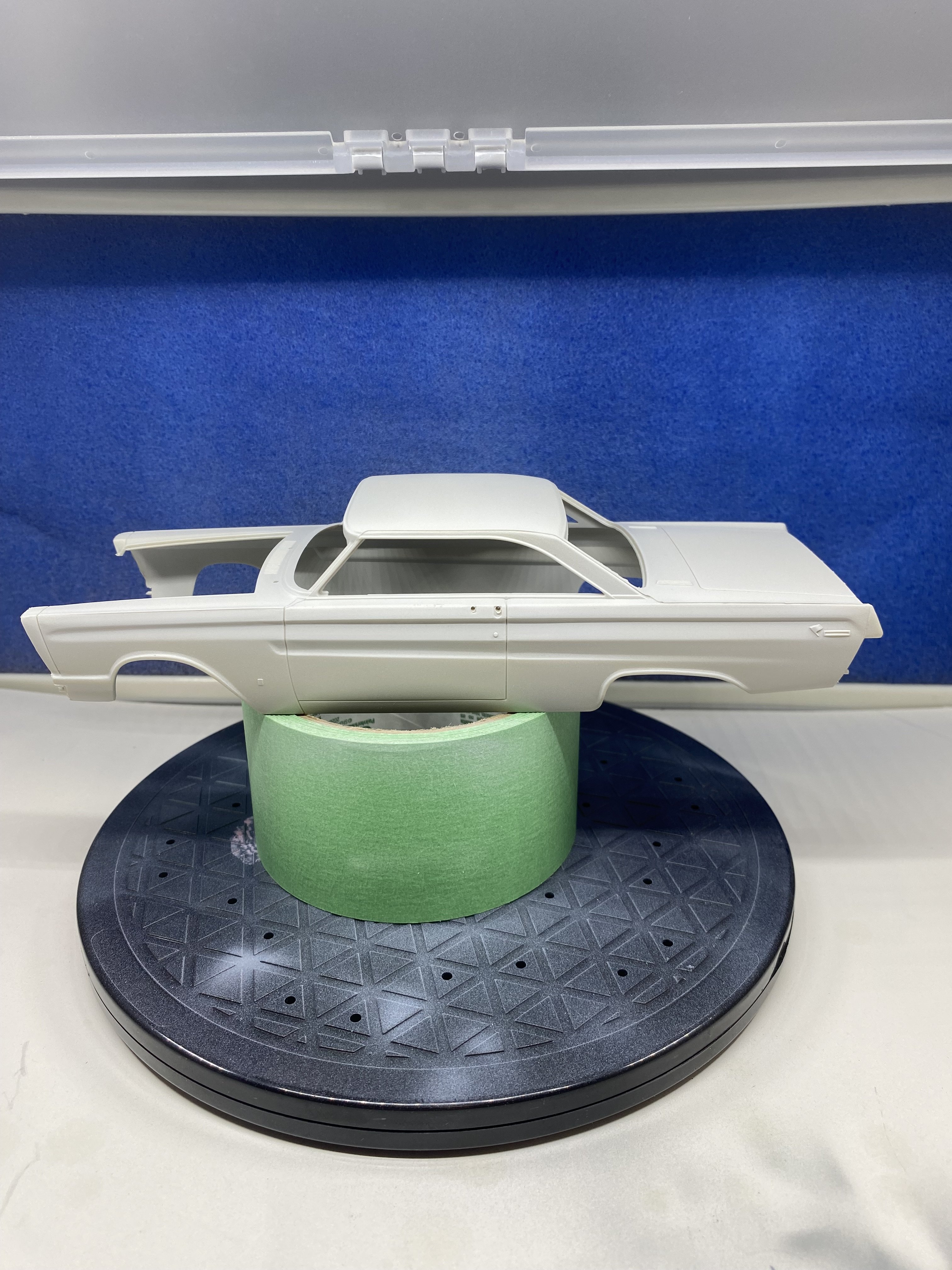 Put my new airbrush and paint booth to the test. A lot of trial and error to get the correct paint mixture and air pressure to spray an acceptable coat. I tested on some scrap before moving to the car body. I am happy with the results. I will let the primer cure for a day and then on to the colour coats.