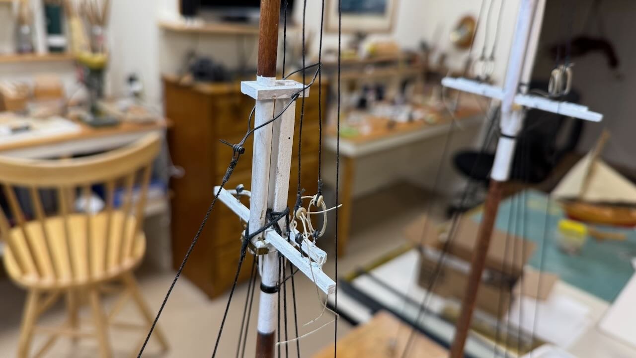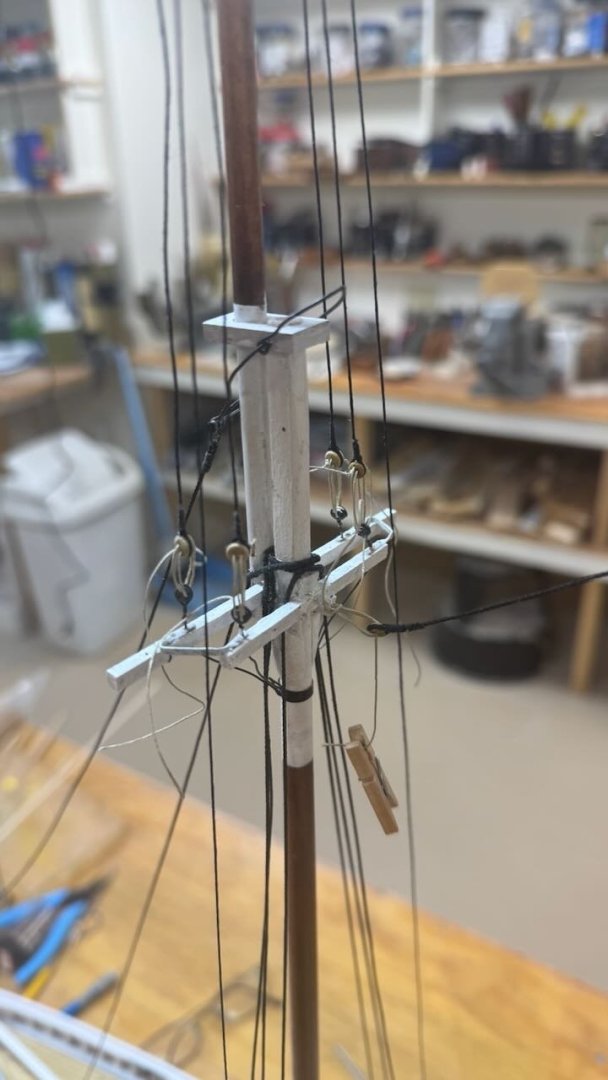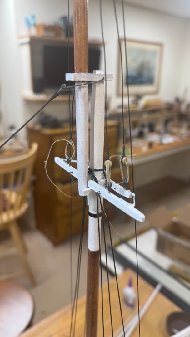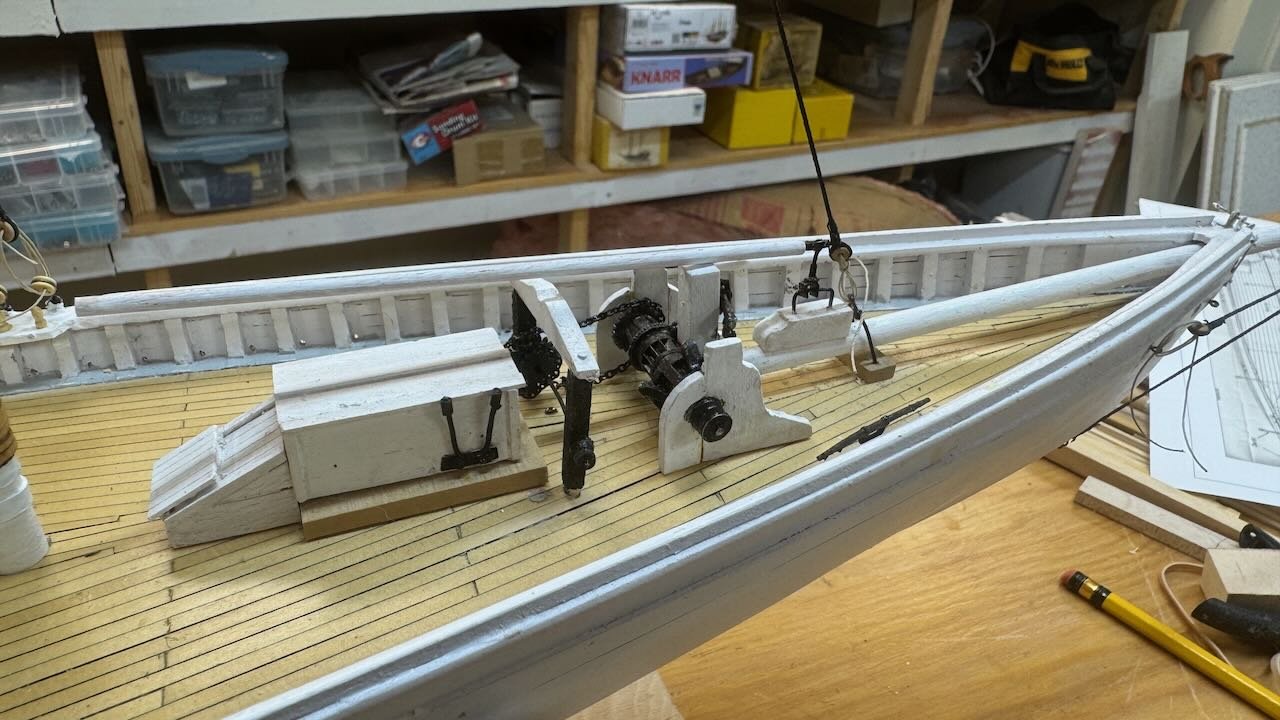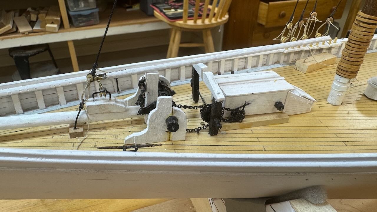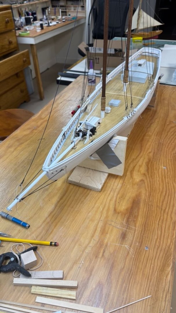 13a deck work and standing rigging moving along As I now divide my time between this build and the 1872 Norwegian ship Gjoa, things are not so fast. It is fun though, as Gjoa is in the hull stage as this build is into deck furniture and starting the rigging. This is a partial update. For most of my guidance I refer to the age-old favorite book o fishing schooners by Howard Chapelle. Several similar scale schooners in the past and the detail I learned building a bigger scale bluenose several years ago. One difference from Bluenose is, from the photos of Elizabeth, lashed dead eyes were used instead of turnbuckles. Perhaps the 5 years between 1916 and 1921 made the difference. I am therefore using lashed bullseyes for many of the fixed stays that surely would have needed adjustment. To work 1-3 these images show my low-tech approach to building the sliding goose neck for the jumbo boom. I took a brass channel drilled a hole on top. Then I set a tiny rivet upside down and put a cut off brass eye with system through the rivet and the hole in the channel and soldered it up. I then soldered a clevis on the end of a rod to sink into the fore end of the jumbo boom. I also added some handles to control the winch [ imagined anyway] and some chain. I am not proud of the mechanism but is represents that something would have been there. 4-6 these images show progress making up the hardware and stringing the running rigging aloft. It is all left untied for now. When it is all in place I will have some extra hands here over the next holiday and we’ll square it all up, tighten and then lash all. 7 This image shows from the bow, the bowsprit and fore stay rigging is taking shape as well. I even put in all the belying pins