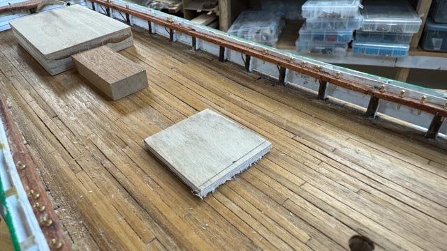 8 complete rails and plan deck work Thank you everyone for your likes. It helps keep the fire burning. This is a partial update to record completion of the cap rails and this phase…. “ the hull” . It’s kind of like topping out of a building. I suppose i could get a miniature Xmas tree and set it on the rail. I had a nice glass of Single malt and now we move on... 1,2,3 these images show the completion of the cap rails. It was pretty straight forward, as I used the rest of the milled poplar and cut out three sections for each side. Next up will be to complete the deck furniture but first I need to plan it out. I think there are three parts. First all the stationary stuff, Then the mechanical stuff then all the rigging stuff that is best to get on deck or the rails early. 4 I scaled the 1950 Model Shipway deck plan using TurboCad then cut it out to lay on deck. I then used light pencil lines to mark where things will go. I then will be using this plan and the long cross section to get dimensions. 5,6,7 these views show the progression of making up blocks to represent the stationary element. Some of these I will trim down build back up with cladding. 8-9 are just further along as the cap rail is now all painted and the 10 stationary deck pieces are laid out with some early shaping. I see in the photo I have a few more of the iron brackets to add in as supports for the shelves too. I need to get them done before setting any deck stuff. None of this first phase includes the mechanical equipment. That is a tough phase to follow as I quickly leave my comfort zone trying to make chains to actually fit on wheels etc. I am thinking about it though as I look for material. All for now.