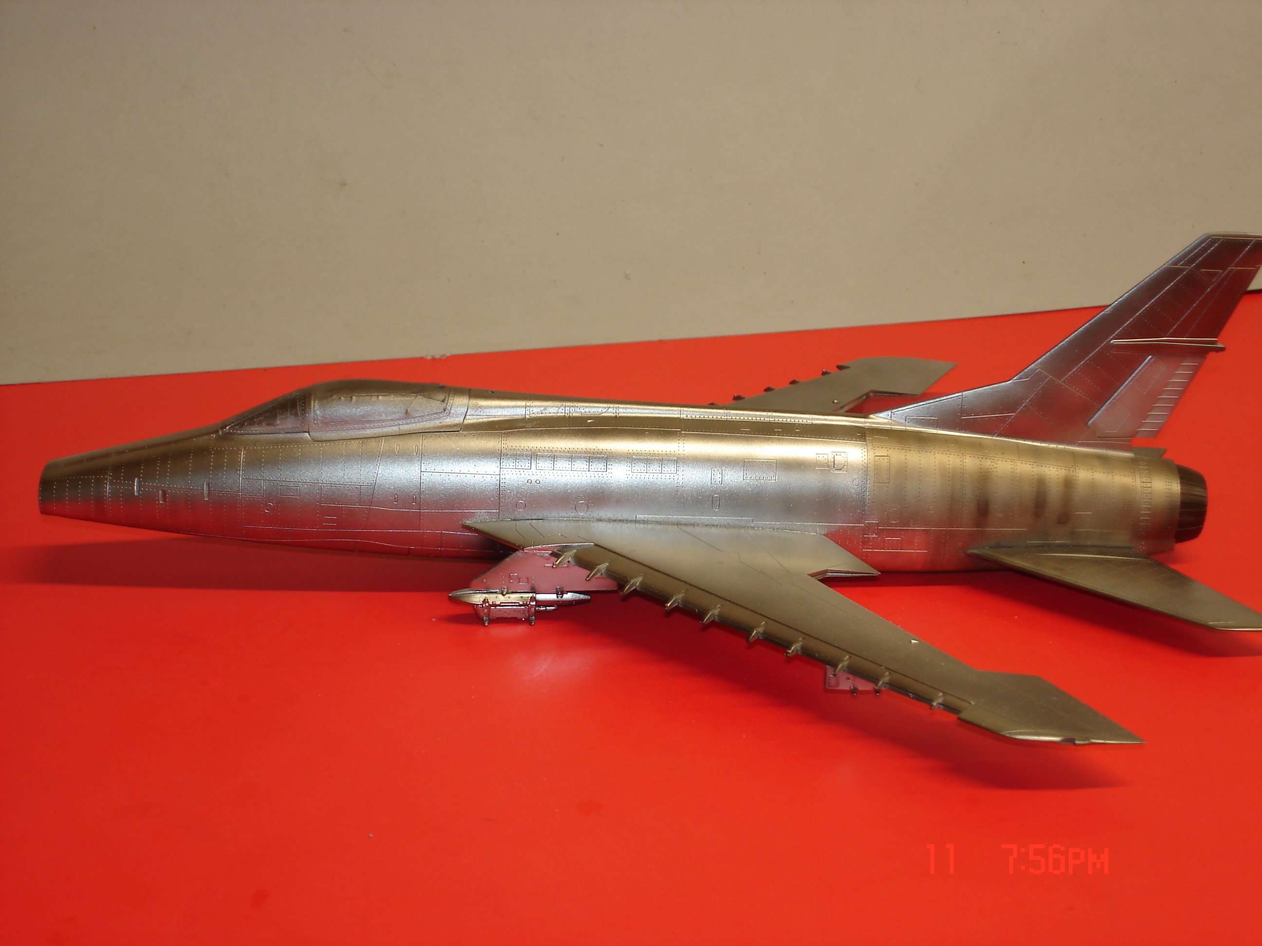 I will clear coat tomorrow with Pledge thinned with Mr.Leveling thinner makes it lay smooth and drys much quicker .The engines are what they are I got a no seam in what you look from the outside but inboard side I did not mess with.I found out doing the belly tank just putting putty and paint does not work still looked white in a sense.I painted a hairline color of black on the engine seams to the wing sprayed AlClad 105 and all was good.I think once all said and done it will not be a bad looking build giving it a B grade.🤨 The F-100C is the Trumpter kit got good vibes on this no seams hardly at all.