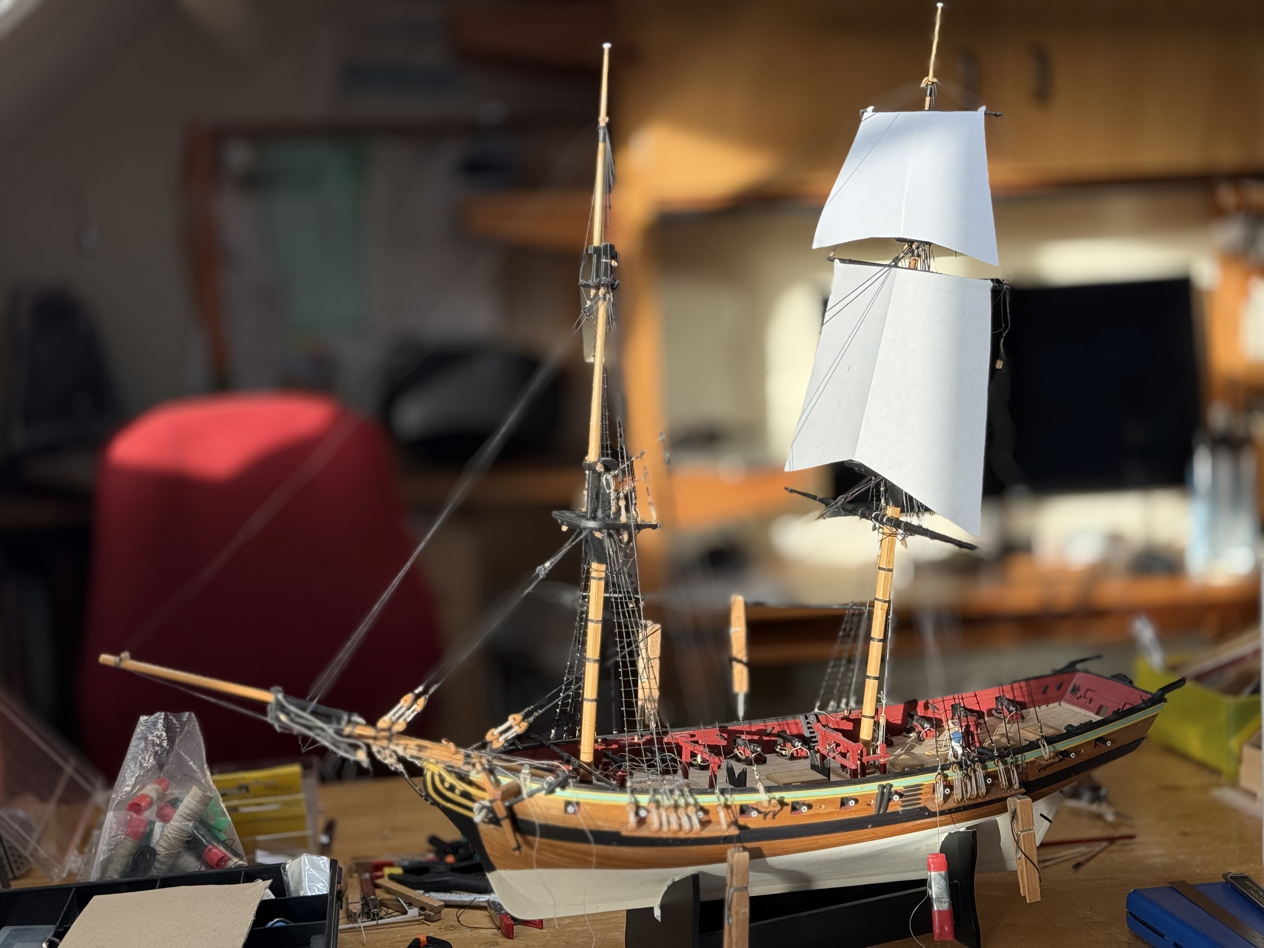 Many thanks for this suggestion, Chris! Shows once more that if you think you’ve got a dilemma, you haven’t been thinking creatively. I like especially the ‘window sill’ idea, putting them in between gun ports. The calibre of the guns on this brig was not too large, the cannon balls not too heavy (9 or 12 pounders? I should look it up, one of these days) so it would have been quite feasible to put them there.