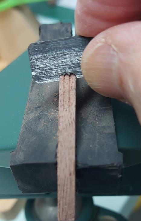 I had been working on the lower cheeks and have since started the upper cheeks. I began by making a card template of the hull using my profile gauge. Then I traced the stem works to fit the upper cheek between the gammoning slots. The lower cheek was made in two pieces, glued and pinned with wooden dowels requiring #57 drill bit holes. The upper cheek will be in three pieces of which I have two pieces roughed. The piece against the stem works is longer than needed. I will make the mating piece longer and trim the two to fit. Tomorrow I will make up the hawse bolster and backing plate pieces to help with spacing and alignment of the upper cheek pieces.