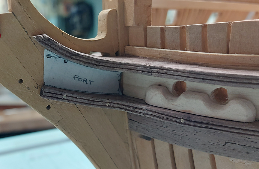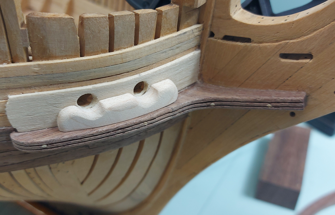 With a couple figures done and the three rows of 4" planking completed, it is time for a change before I go back to yet more planking. I decided to complete the assembly of my 3D printed viol/vyol block. The strapping is blackened card stock. The hook is copper wire that has been twisted and filed to shape. The completed block is placed on a 5cent piece for scale. I then started on the outer lower halves of the lower cheeks. Used some scrap pieces (of which I have plenty) for this first attempt. They fit up quite nicely. Still require shaping and rounding the edges. I'll need to make myself a scraper. Now to attempt the forward halves of the lower cheek assembly.