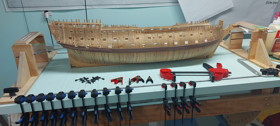 After getting through a multitude of terribly sunny, warm and blue sky days where I just had to force myself to sit out on the back patio, then having yet another health issue I am dealing with, I finally got down to the shop today. I have my lower guides spot glued and clamped so I’ll be ready to go. I have all but one of the main wale pieces dry fitted on the bench. The one piece needs to be remade. It is not perfect, but I am aware of my capabilities/limitations and can recognize when my “good enough” has been reached. Now to get that last set remade and start getting them on the model!