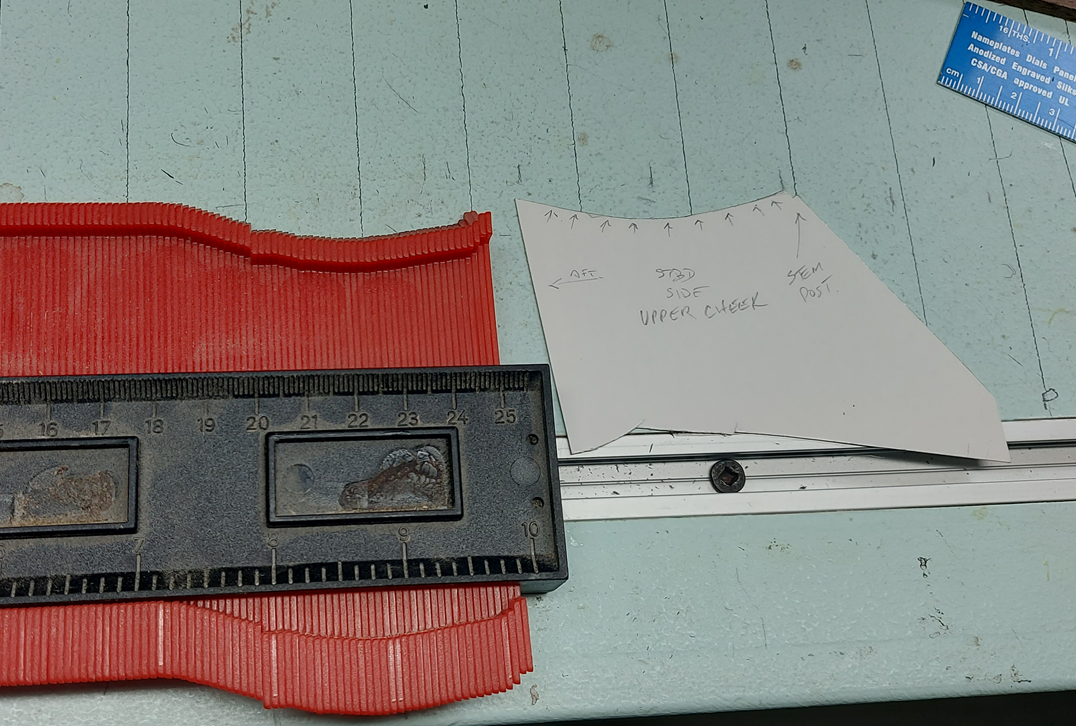 I had been working on the lower cheeks and have since started the upper cheeks. I began by making a card template of the hull using my profile gauge. Then I traced the stem works to fit the upper cheek between the gammoning slots. The lower cheek was made in two pieces, glued and pinned with wooden dowels requiring #57 drill bit holes. The upper cheek will be in three pieces of which I have two pieces roughed. The piece against the stem works is longer than needed. I will make the mating piece longer and trim the two to fit. Tomorrow I will make up the hawse bolster and backing plate pieces to help with spacing and alignment of the upper cheek pieces.
