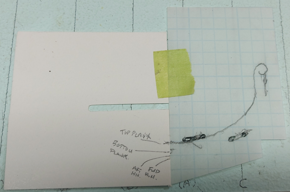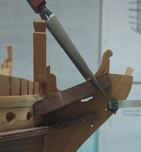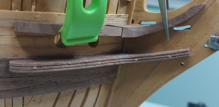 With a couple figures done and the three rows of 4" planking completed, it is time for a change before I go back to yet more planking. I decided to complete the assembly of my 3D printed viol/vyol block. The strapping is blackened card stock. The hook is copper wire that has been twisted and filed to shape. The completed block is placed on a 5cent piece for scale. I then started on the outer lower halves of the lower cheeks. Used some scrap pieces (of which I have plenty) for this first attempt. They fit up quite nicely. Still require shaping and rounding the edges. I'll need to make myself a scraper. Now to attempt the forward halves of the lower cheek assembly.
