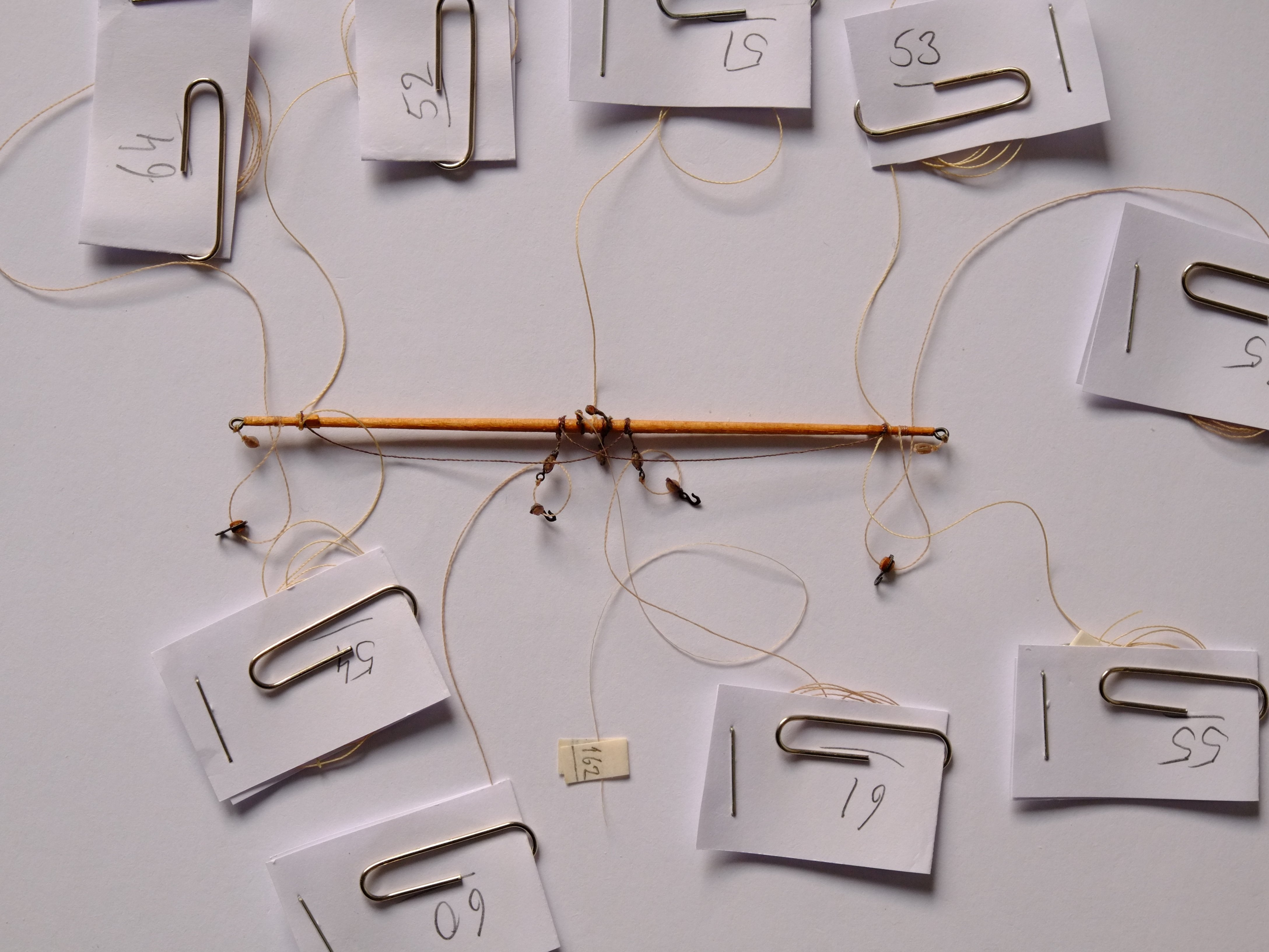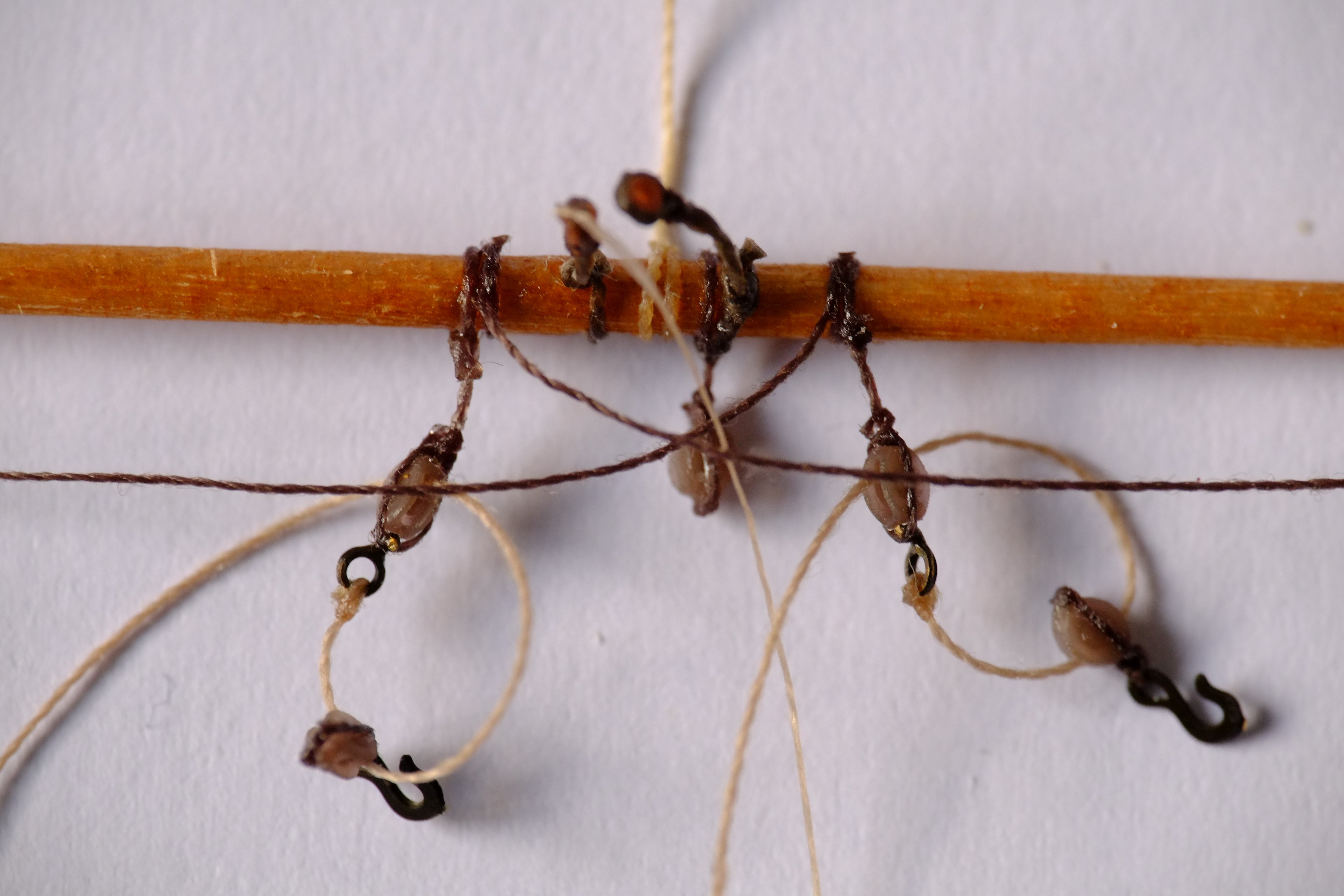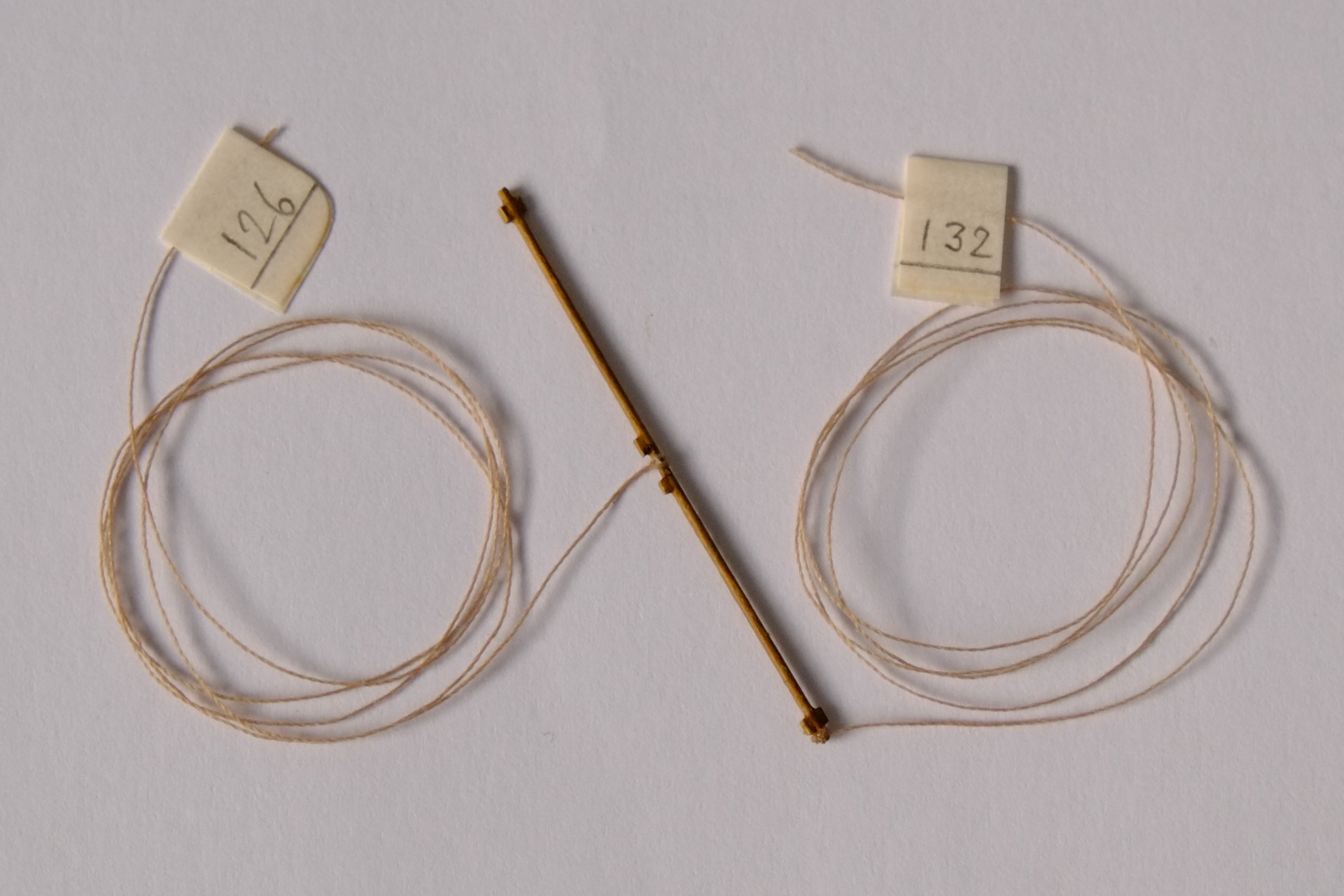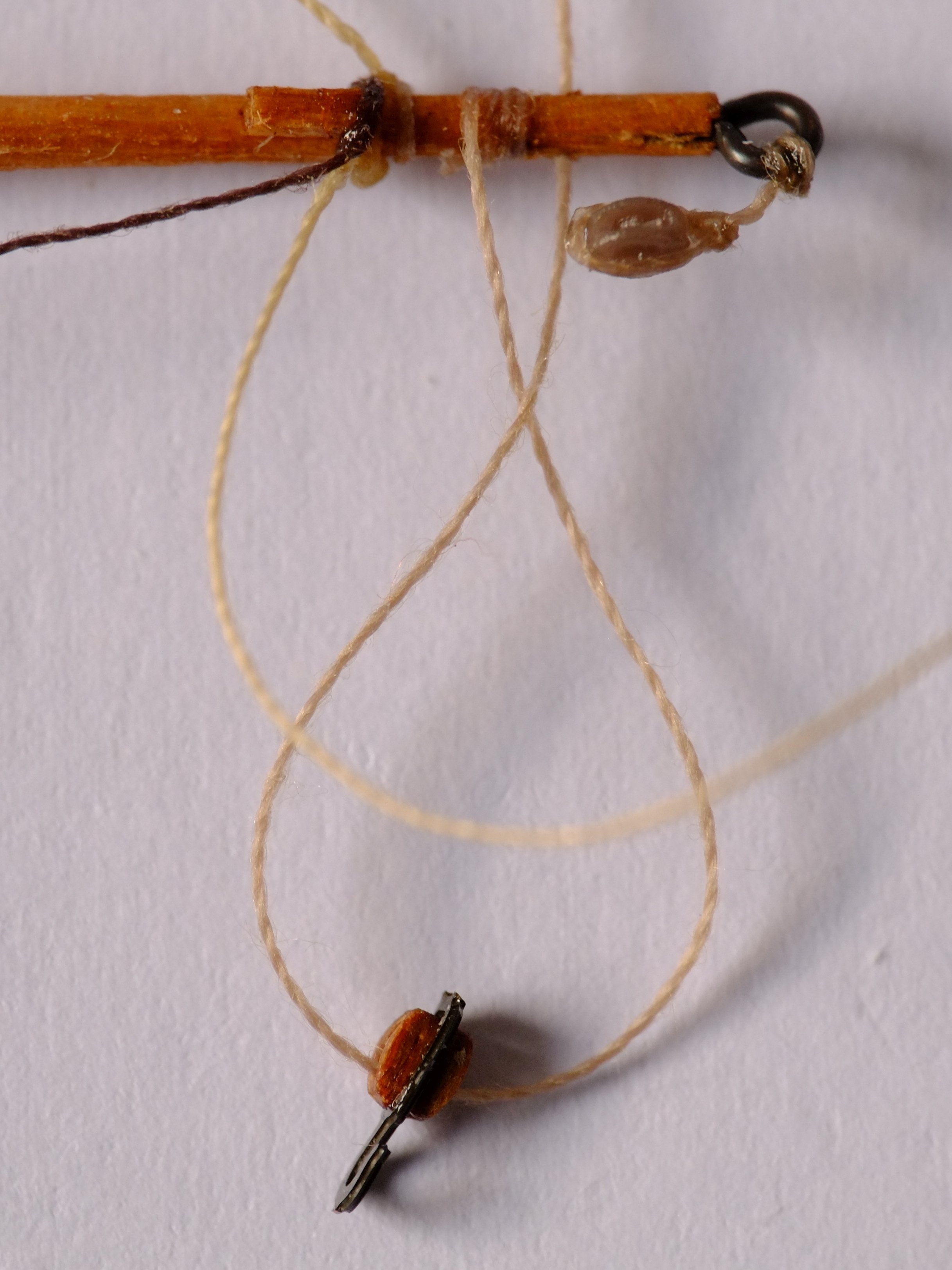 • Two eyes on pendants for the yard truss. The shorter eye has a fine line tied to it, ready to become a lashing. I used fly tying thread.