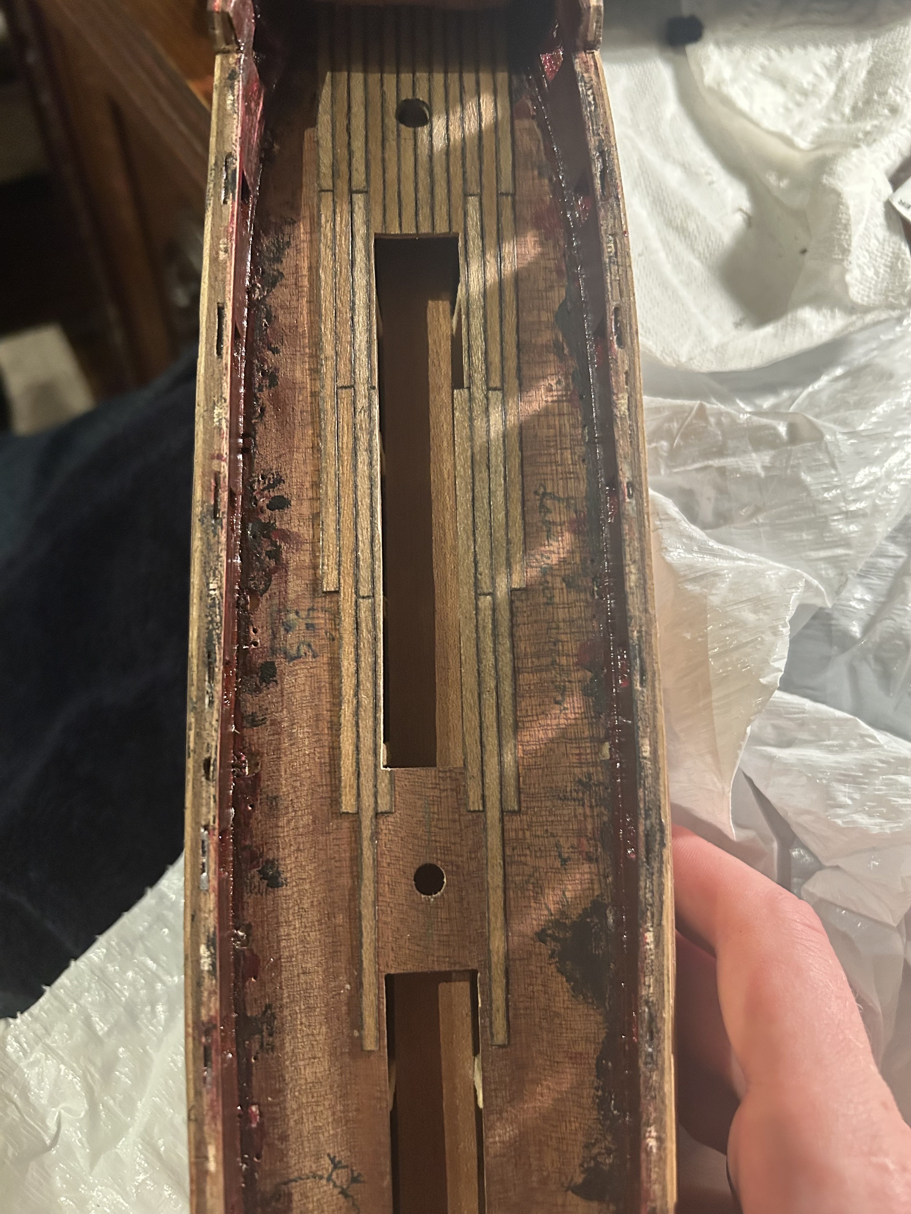 I replaced the wood bits on the back that hold up the transom, and I'm beginning to plank down to cover the stern.