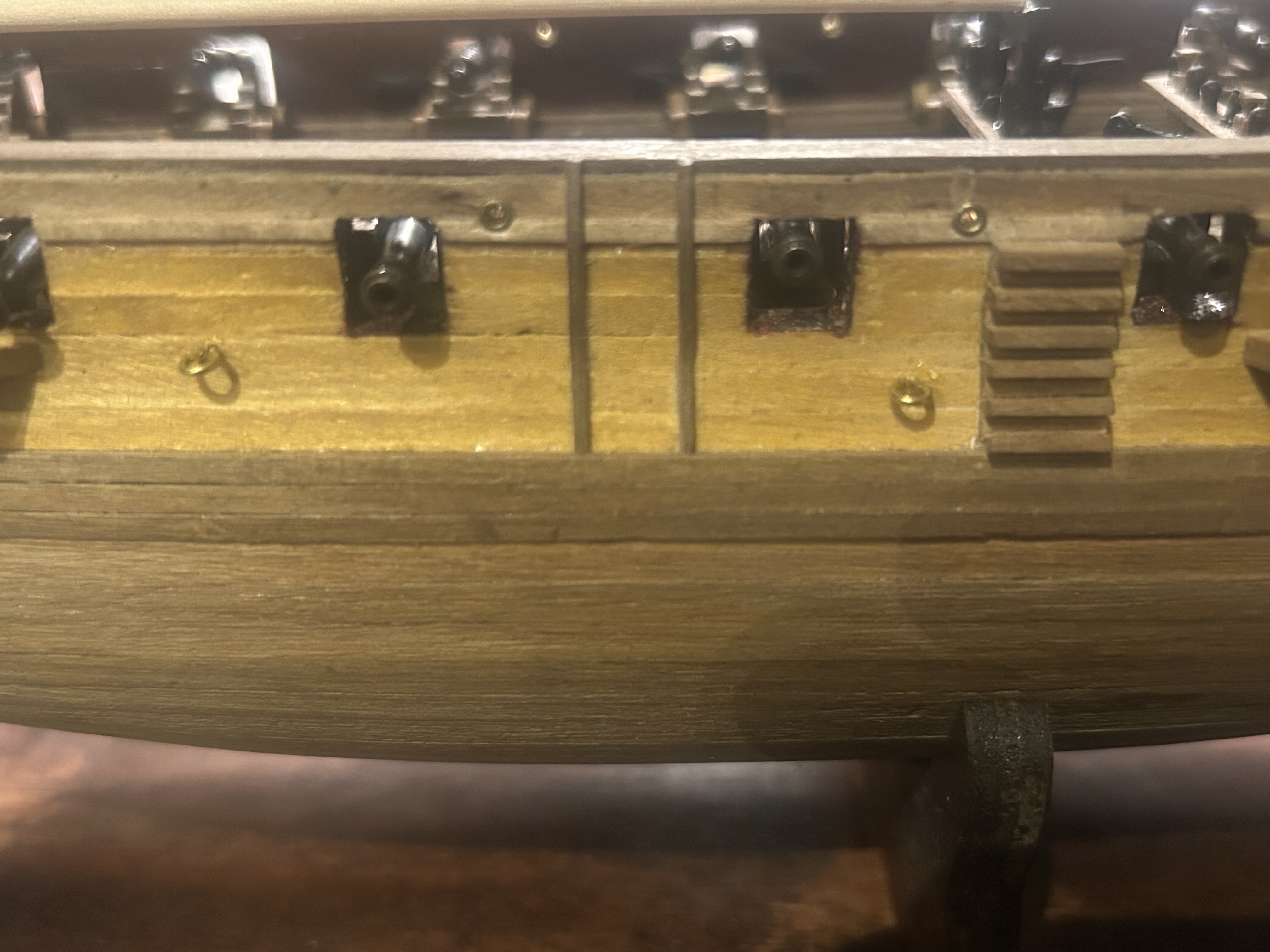 While gluing the cannons on, I discovered they often aren't quite even. I fixed the problem by running them over light sandpaper until the wheels were all level. It's hardly noticeable, and having four glued points of contact on the deck is a great benefit to their long-term stability. 78490429118__A2B4A3CB-A758-4A53-B1CF-1E2CB8F4E7DB.thumb.jpeg.5e605e19dc96846f0b70c874725de9db.jpeg