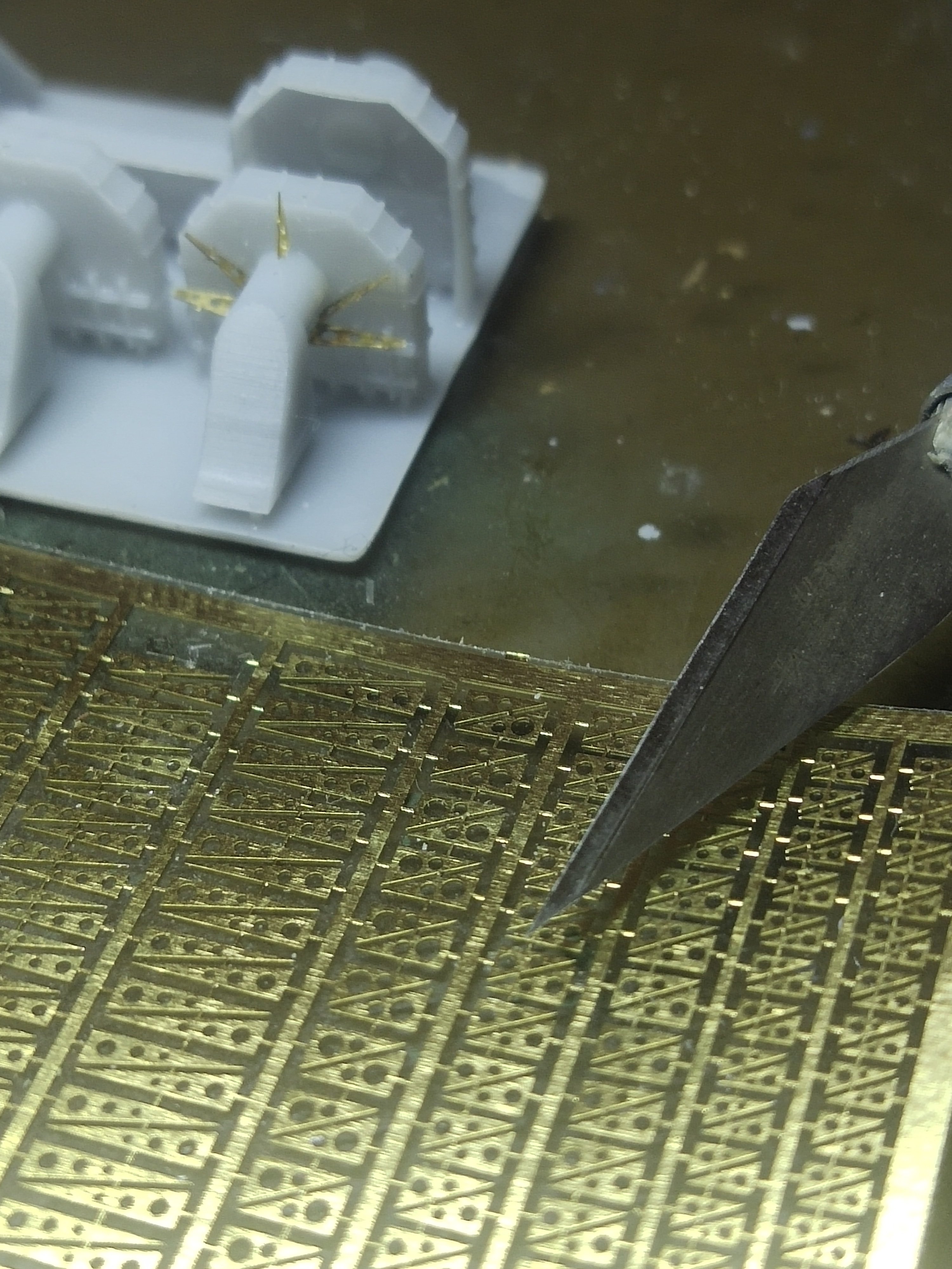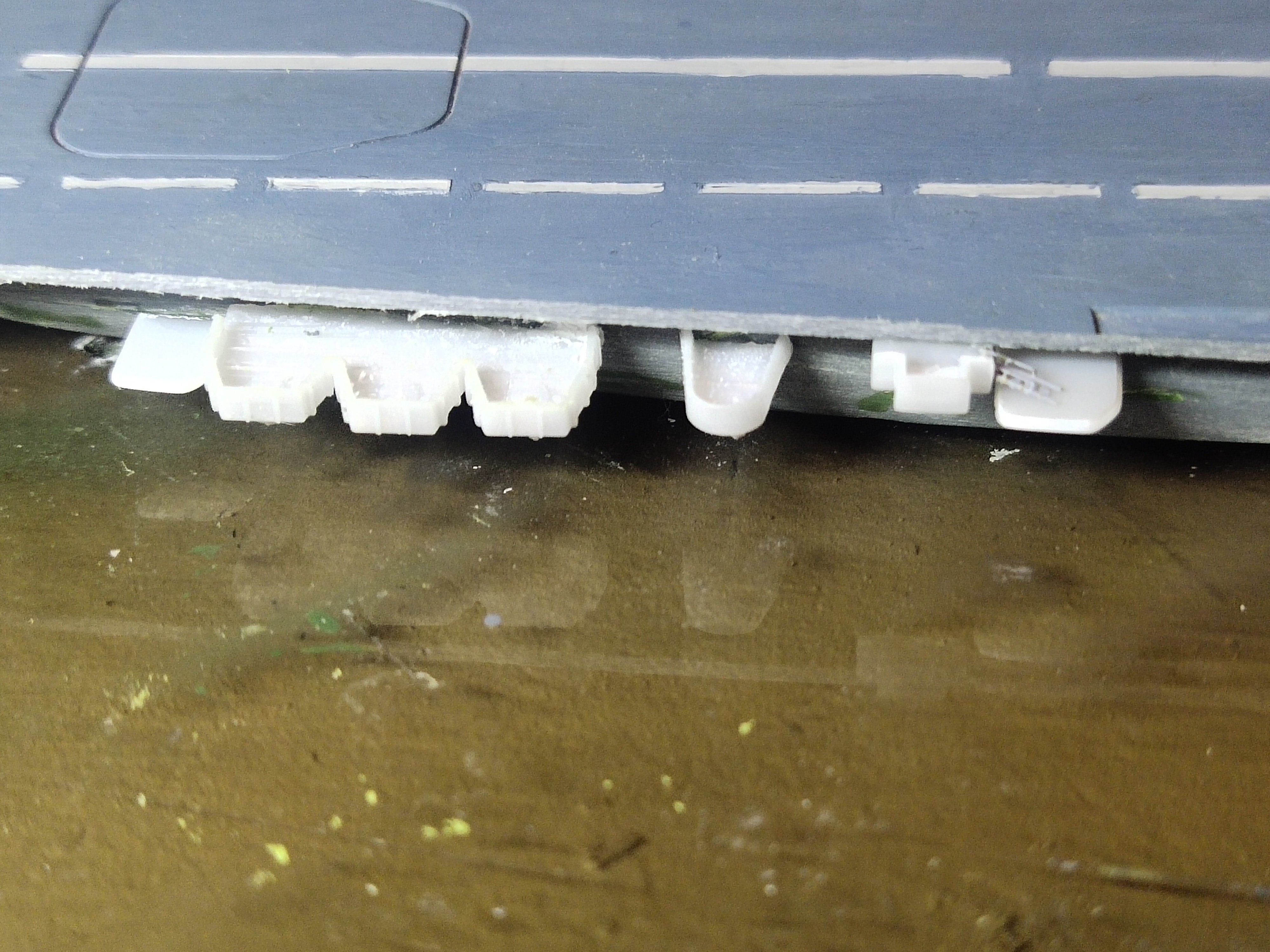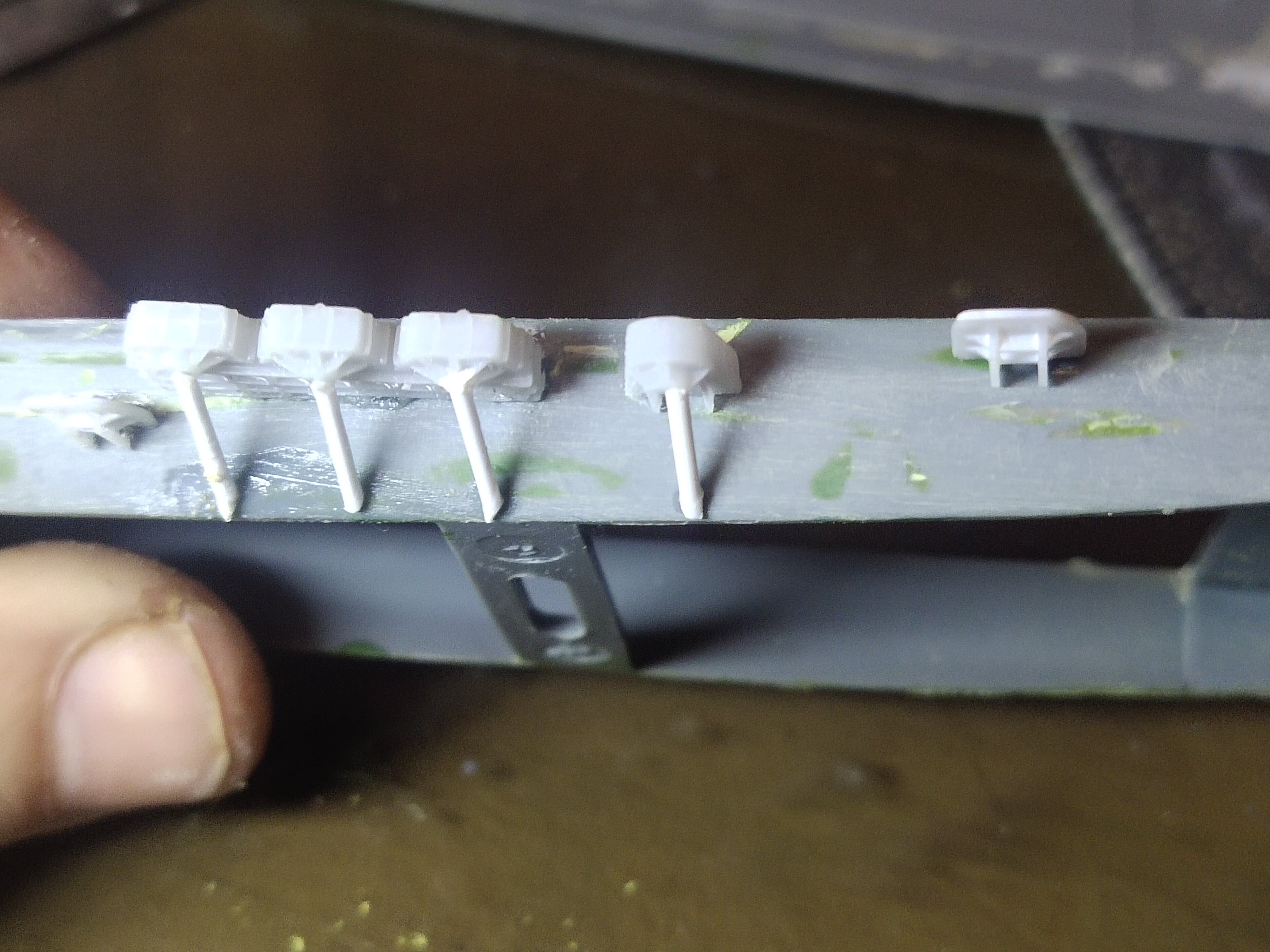 I start working on the gun platforms around the main deck. These should be all removed and replaced by correct ones. Unfortunately these are part of the hangar deck, so I had to cut them using a low rpm rotary cutter. Then sand a lot to remove the excess plastic.