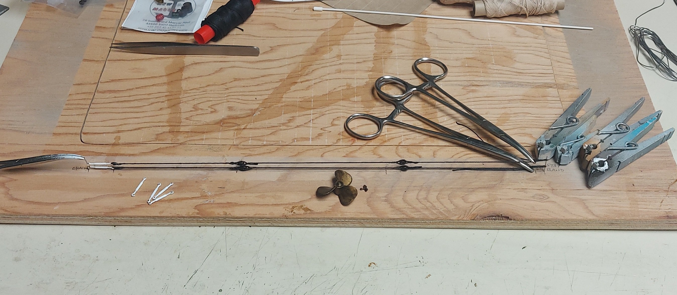 While waiting for the paint to dry on the jib sail sheet blocks I completed the bottle screws for the foremast shrouds, and the foremast back stays which are now ready to go onto the model after a bit of line trimming.