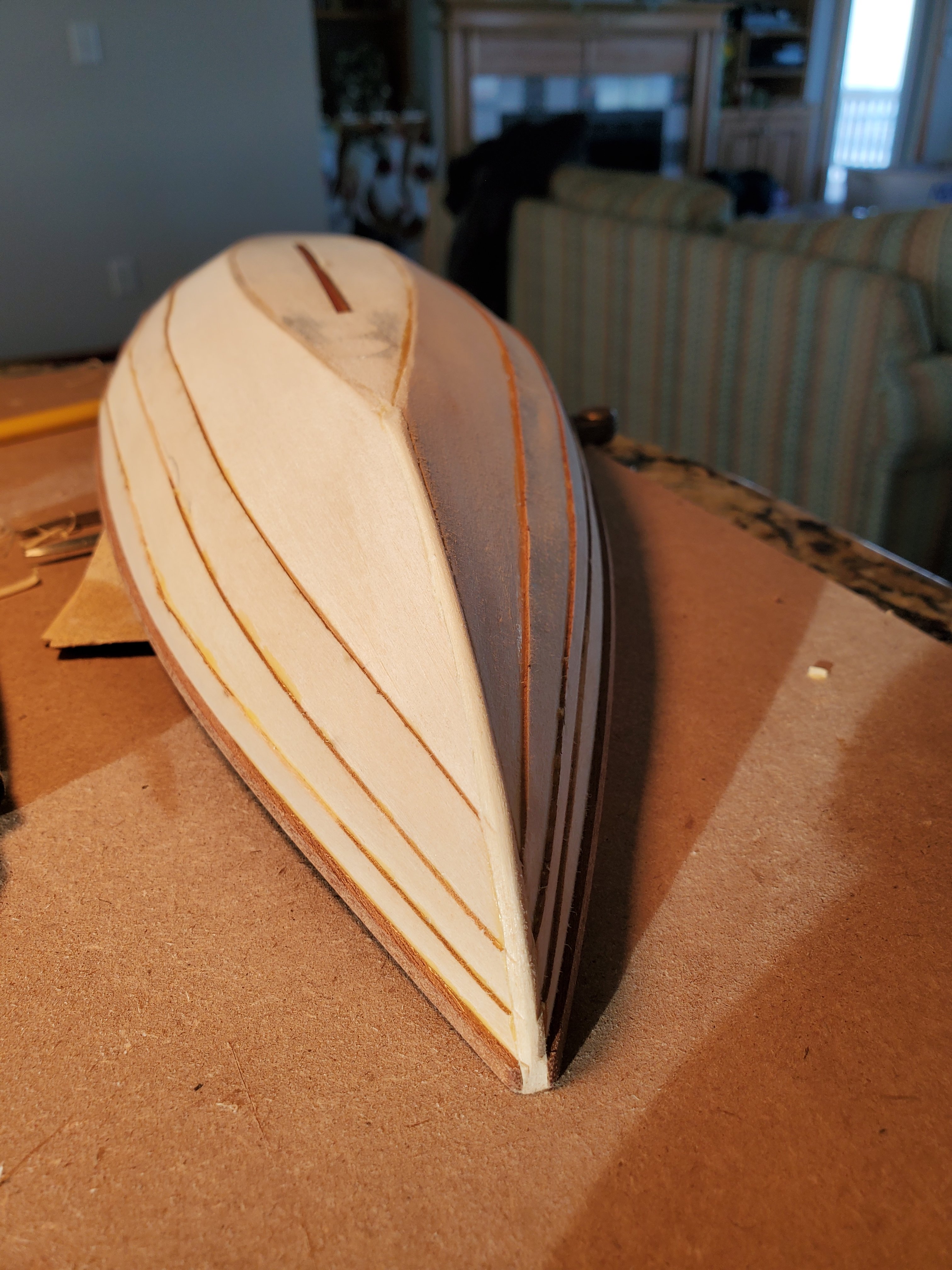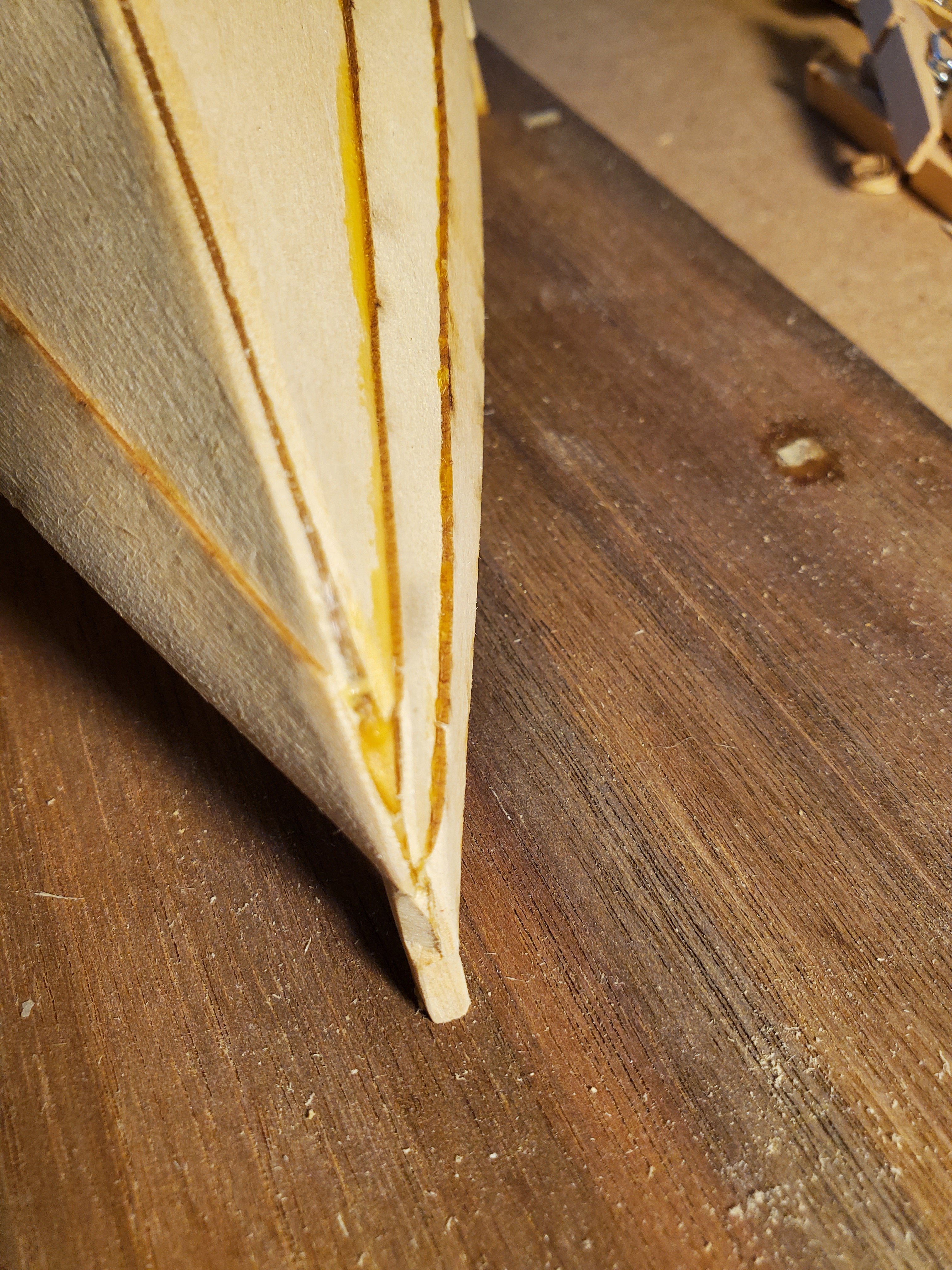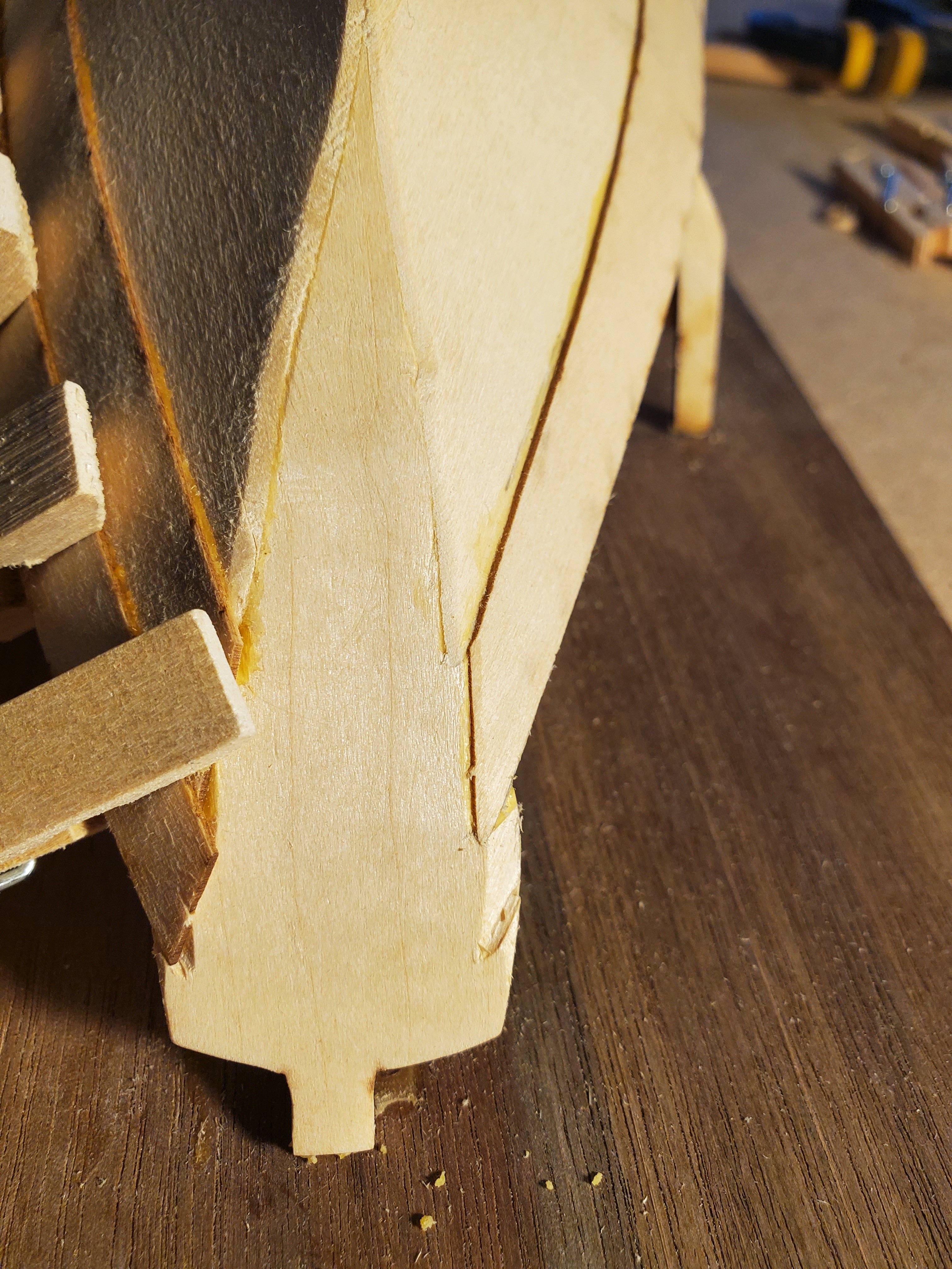 A closeup of the bow and all the glue I am going to have to pick out before painting. If I had it to do over again, it would (a) trim the plank with a small hand plane so I got a nice clean, crisp and square line and (b) use less glue.