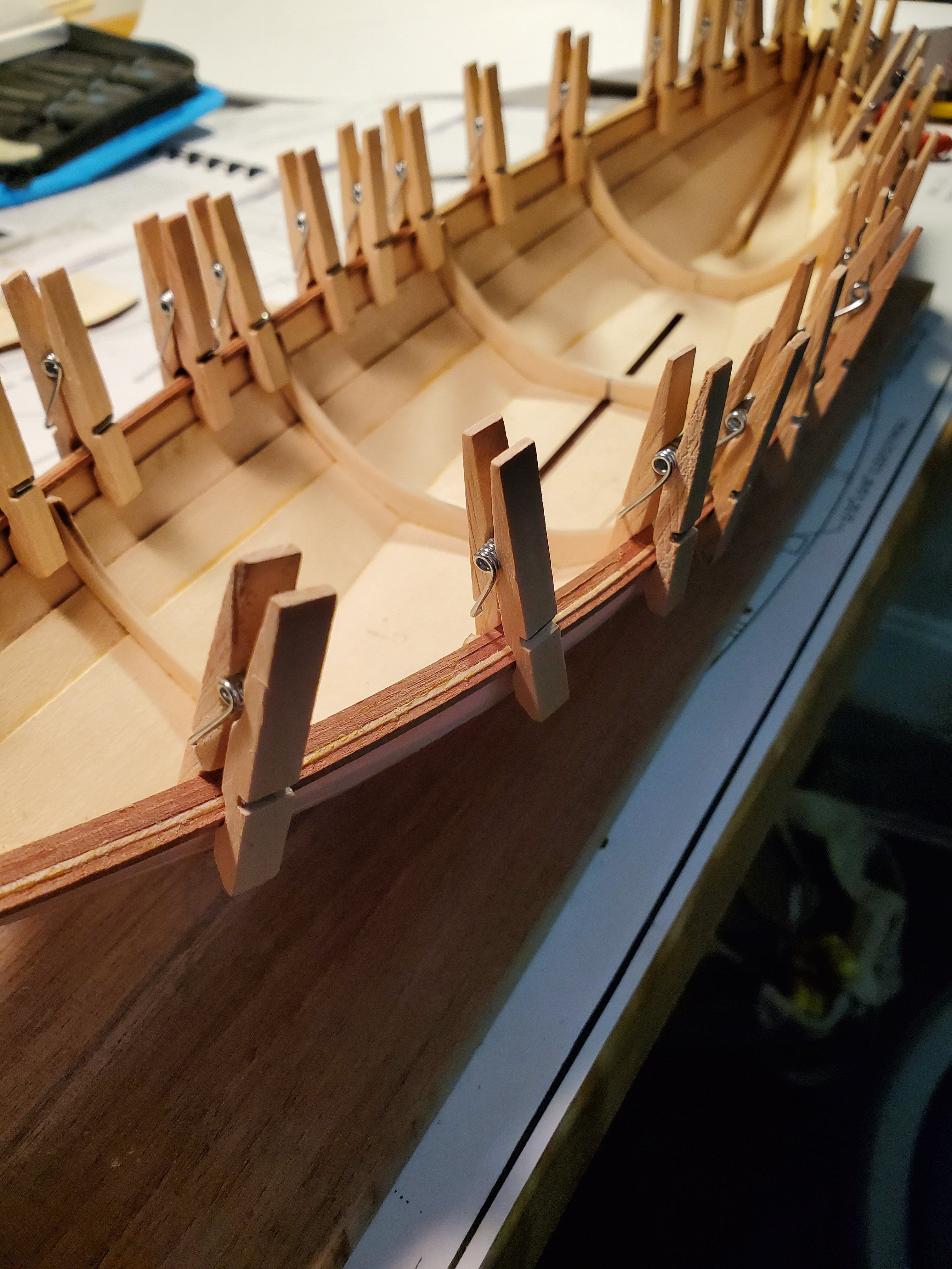 I had drawn a line on my work surface and taped the boat bottom square to the edge of the board. That way, I could use a square to make sure they placed exactly square to the centerline and each other.