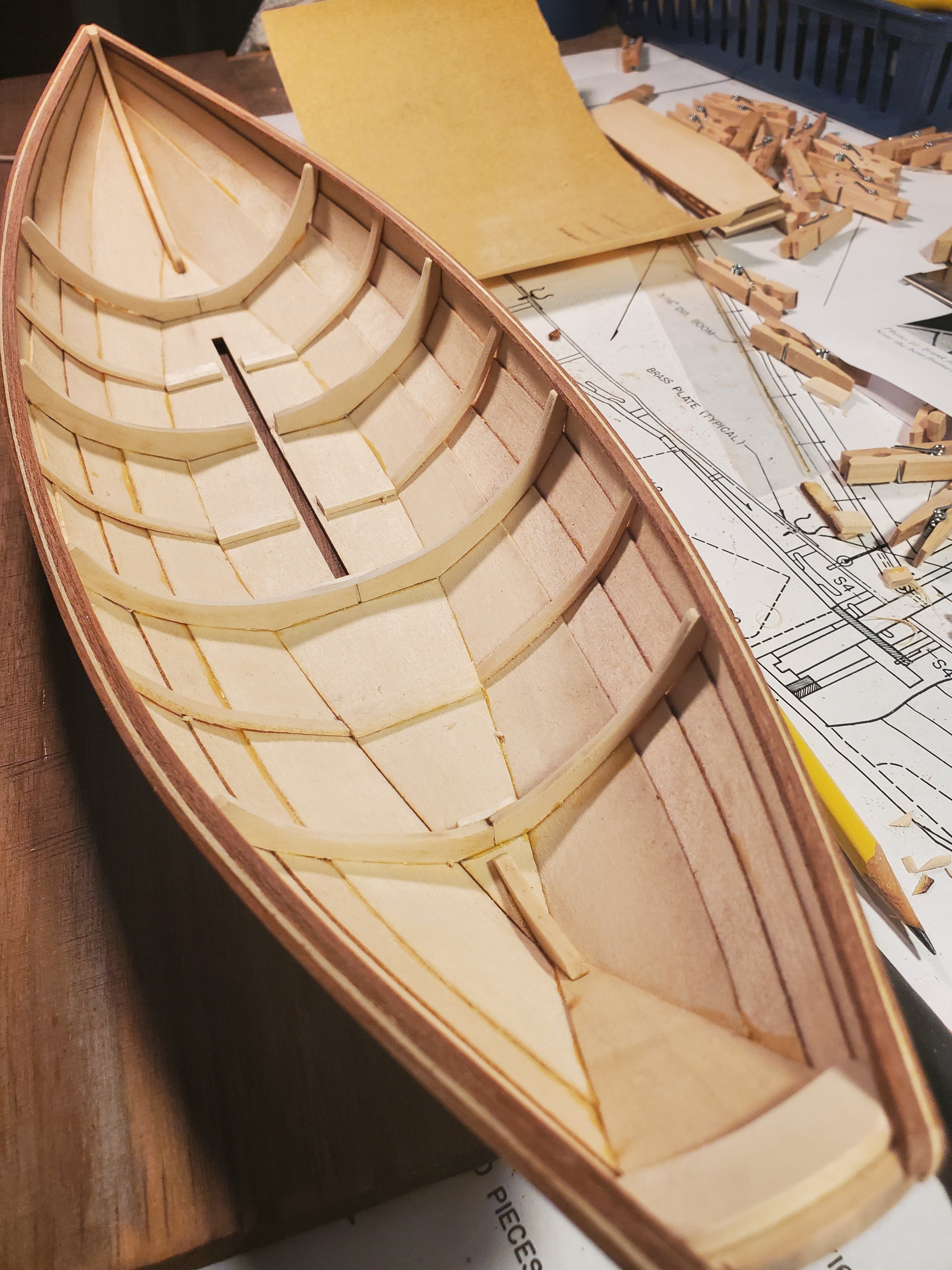 I was very happy with how the rails came out. I tapered all the frames so they ended flush with the rail. Following this picture, I spent an inordinate amount of time picking glue out the seems of the planks. I will be varnishing the inside, so I will not be covering up anything.