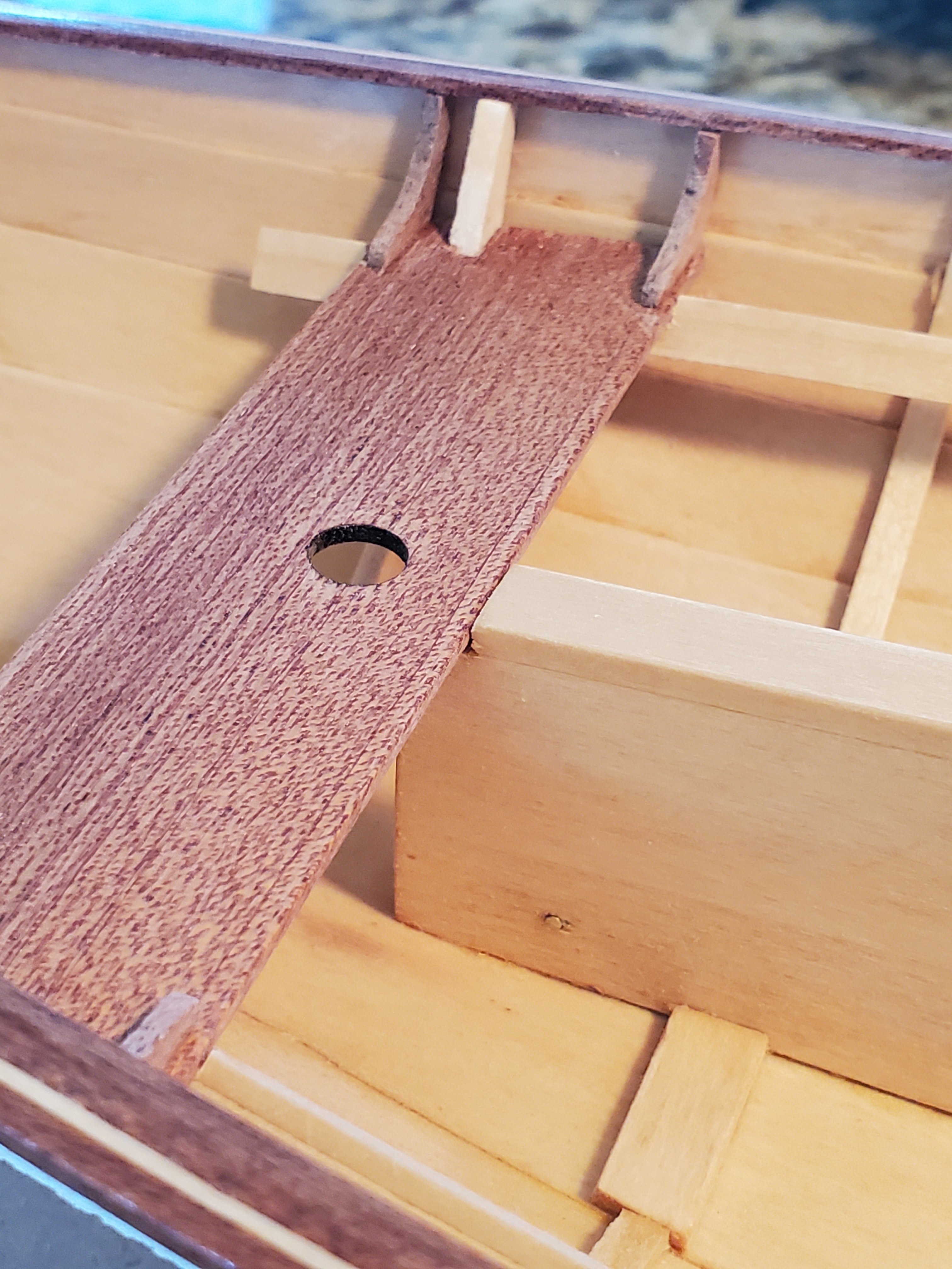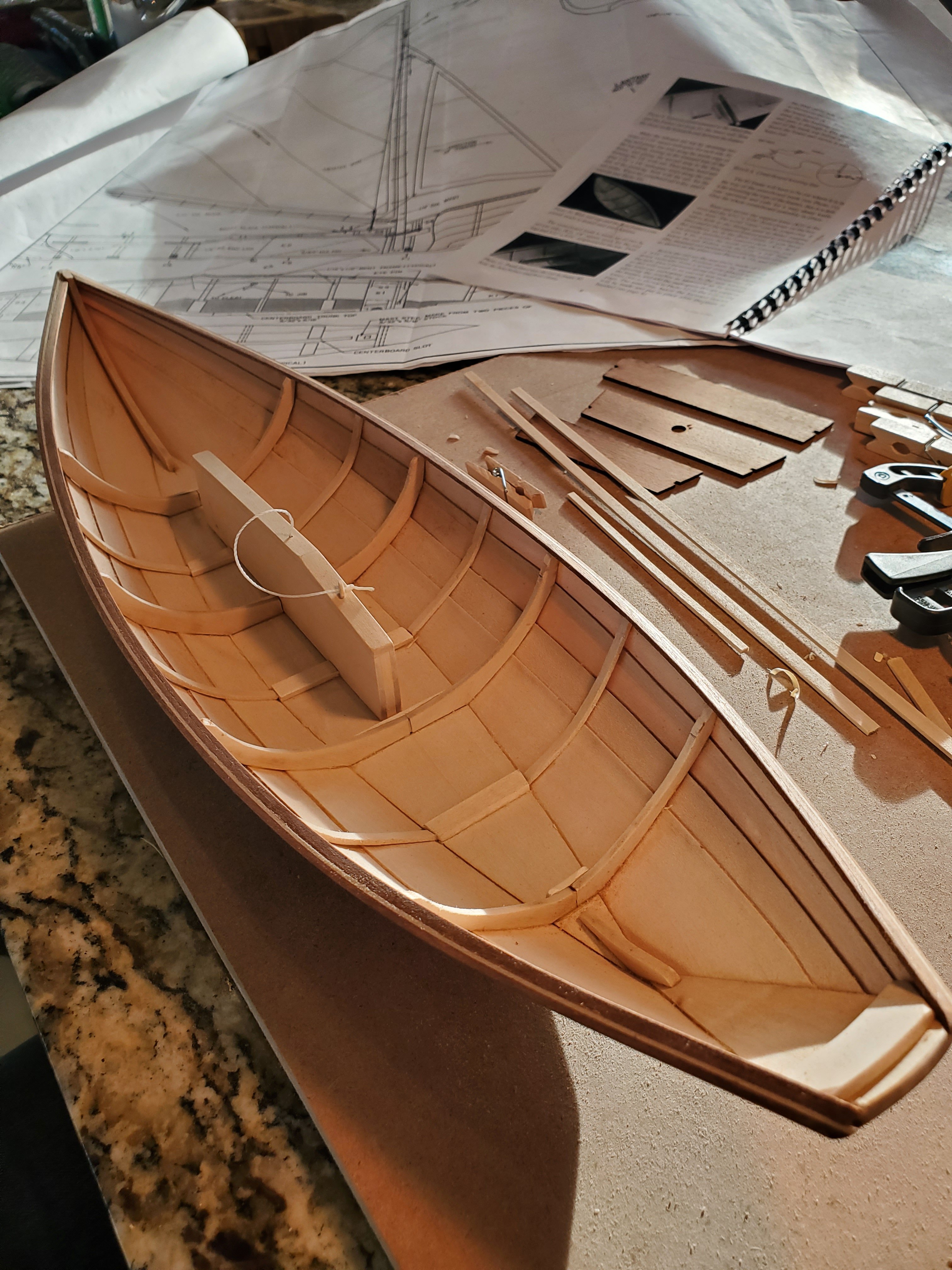 Seats were next. I made sure to trim the angles of the knees so they made contact with the hull planking. I had to cut back the top of the centerboard trunk because I did not dry fit everything and realize how they intersected.