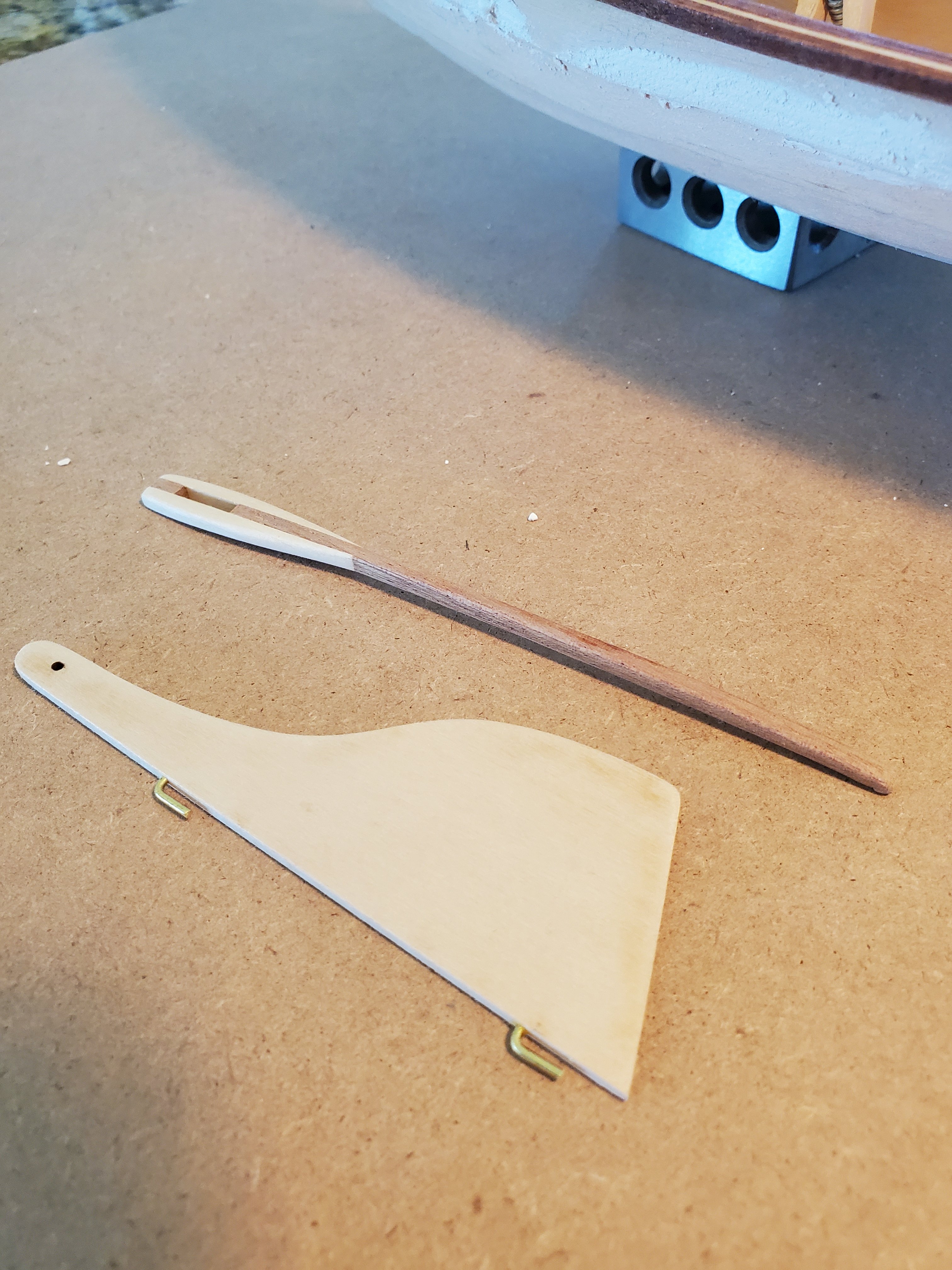 The rudder and tiller done. I had fun making the tiller. The choice of the mahogany tiller looks cool. I don't know how authentic that would be though.