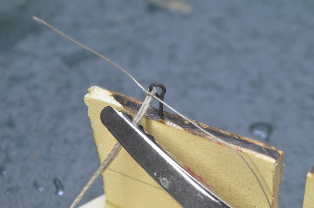 I first made me a jig for the rigging before putting them to the deck. The horizontal line marks the level of the eye bolt on the bulwark.