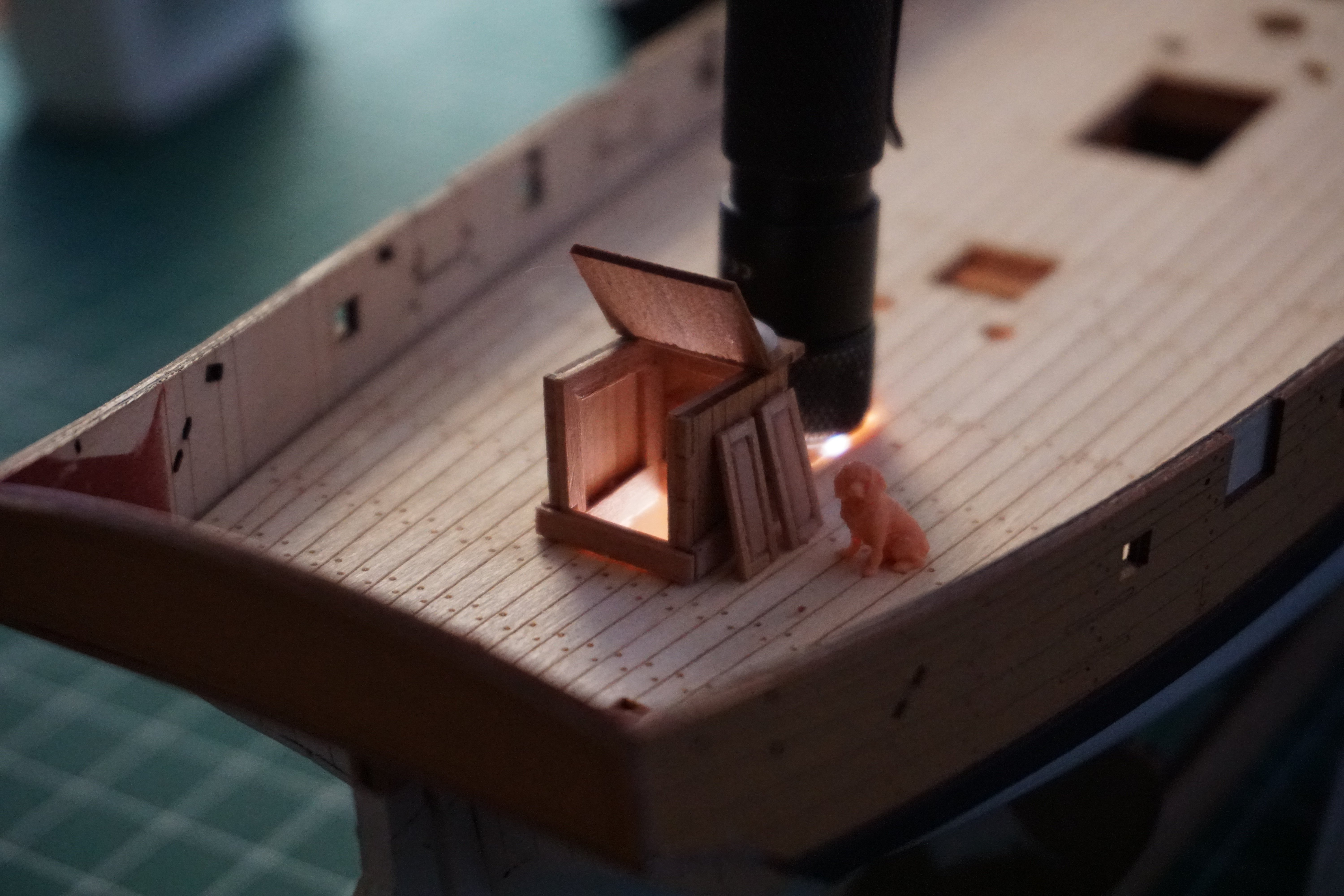 I'd greatly appreciate any opinions on the hatch stay that Caldercraft's HMS Pickle has. I'm considering replicating it for the Sherbourne. Is it based on something real, or just model designer's imagination? The part circled in red is also a bit of a mystery to me. I think that the vertical iron has a tooth that catches on the horizontal piece when the hatch is open, but I'm not sure. I haven't been able to find any close-up photos in build logs.