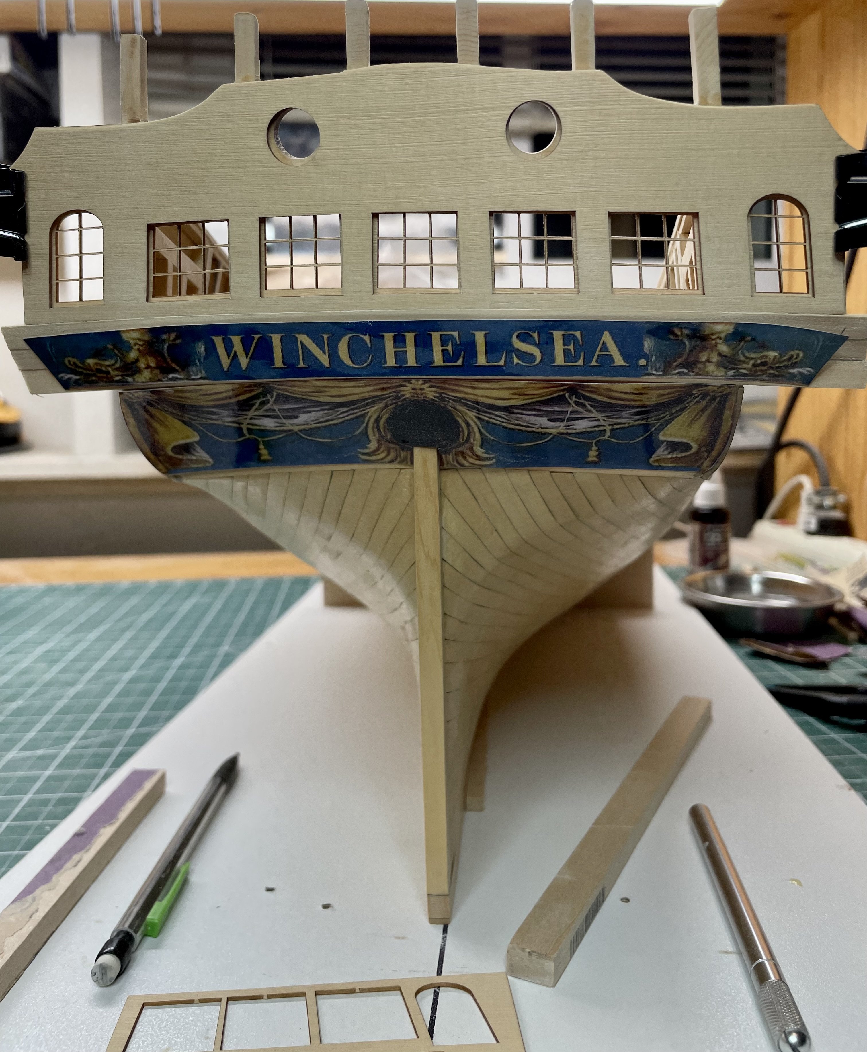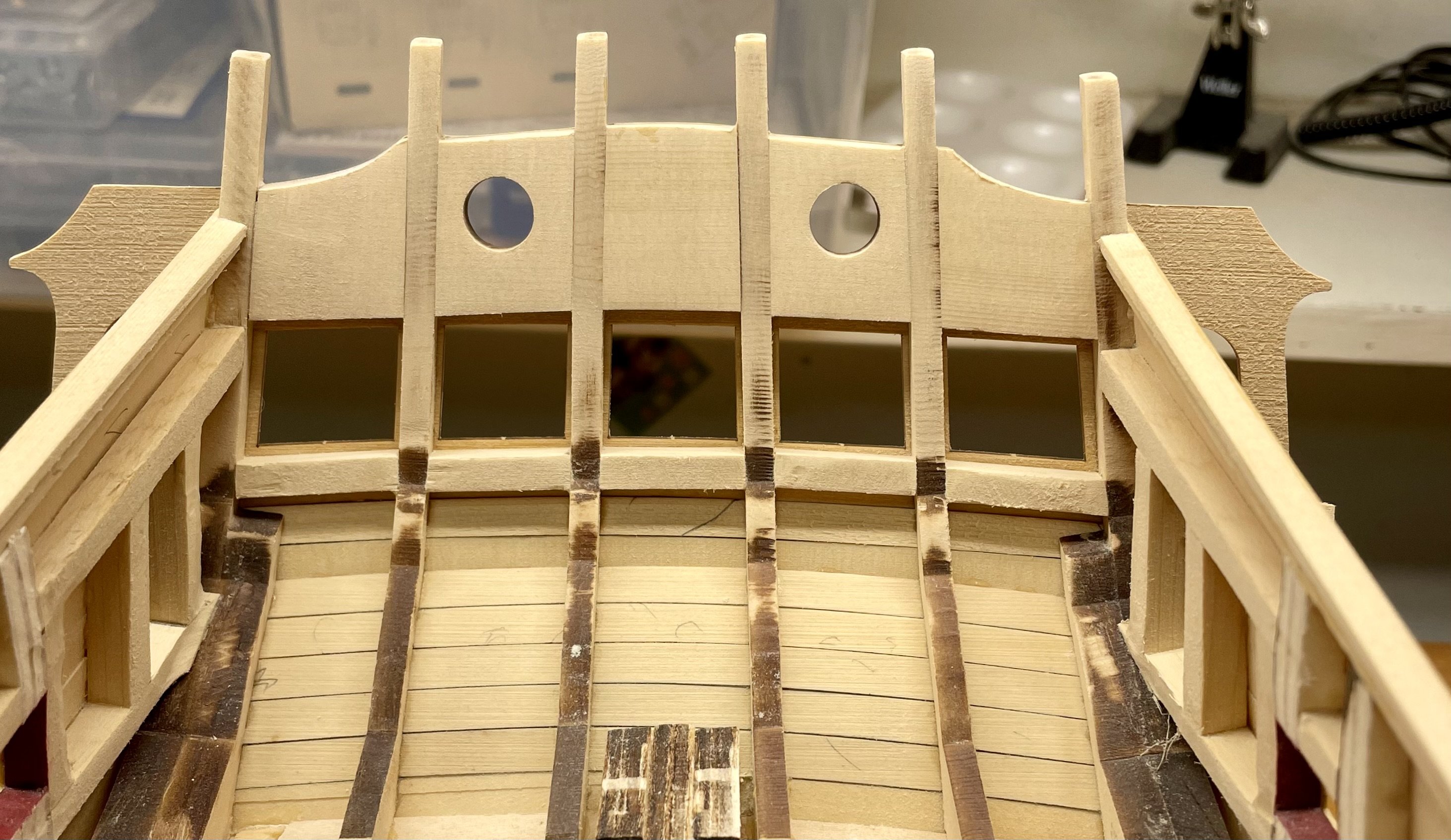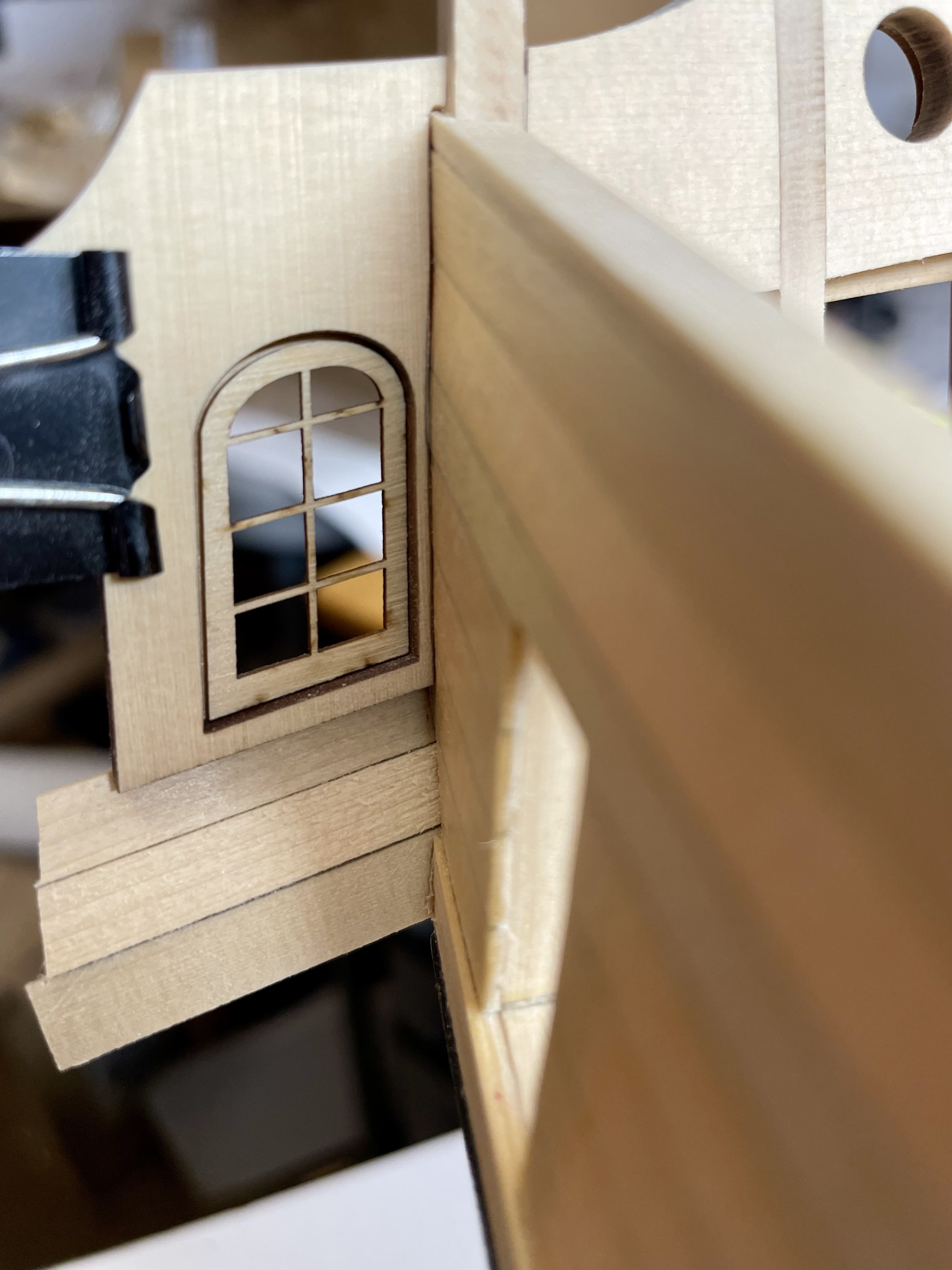 Fitting the quarter gallery pieces to the side of the hull to get the window spacing even from side to side.