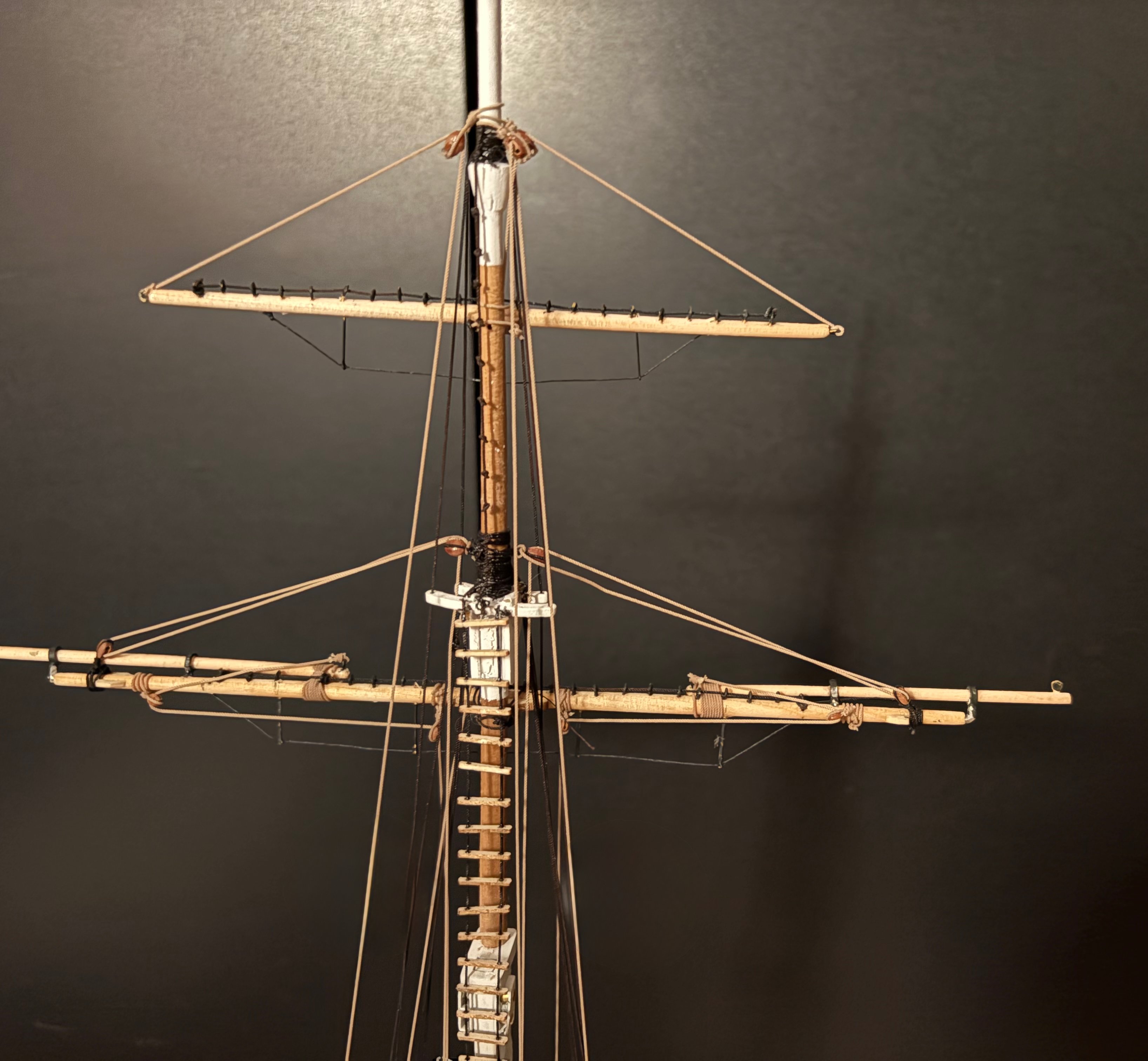 The first shrouds were installed, the first knots tied, the first ratline knotted – all completely new territory for me. But it's fun.