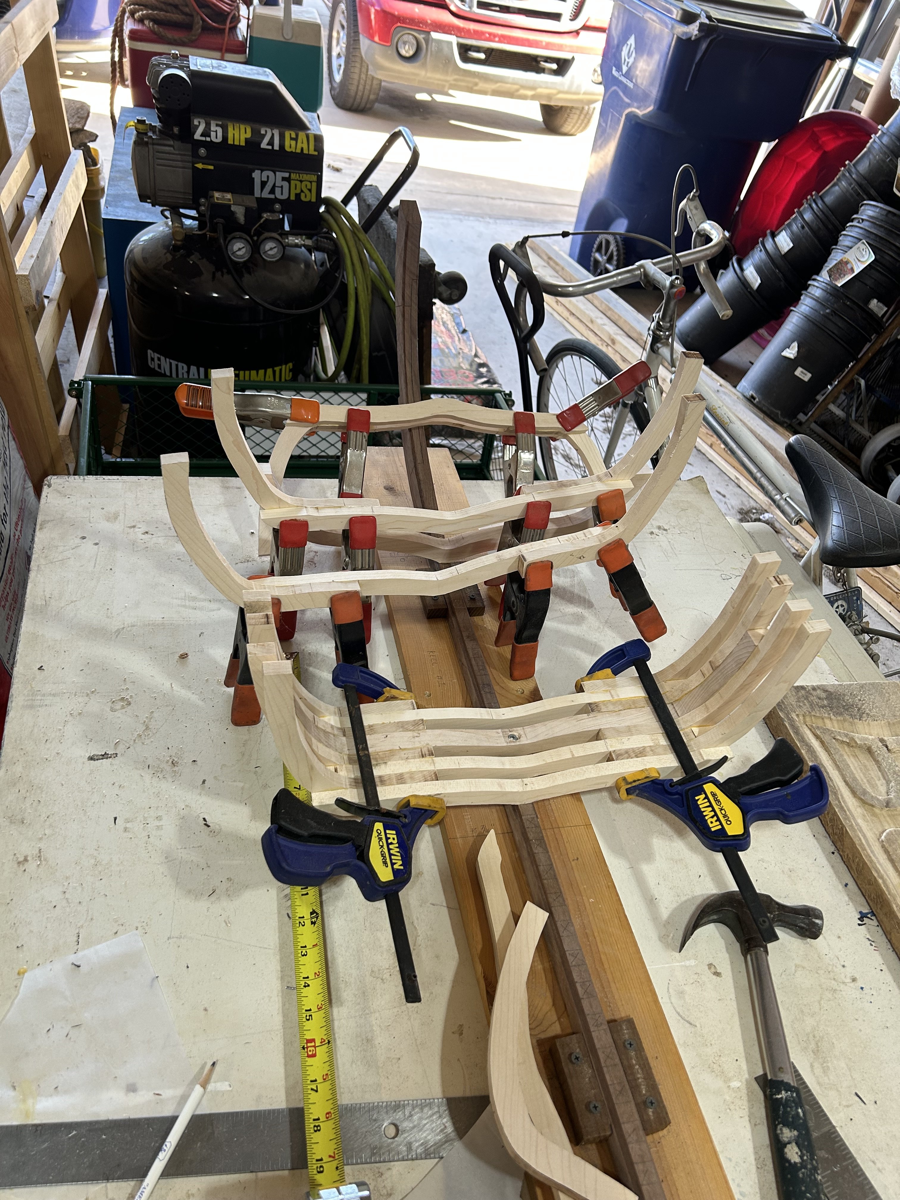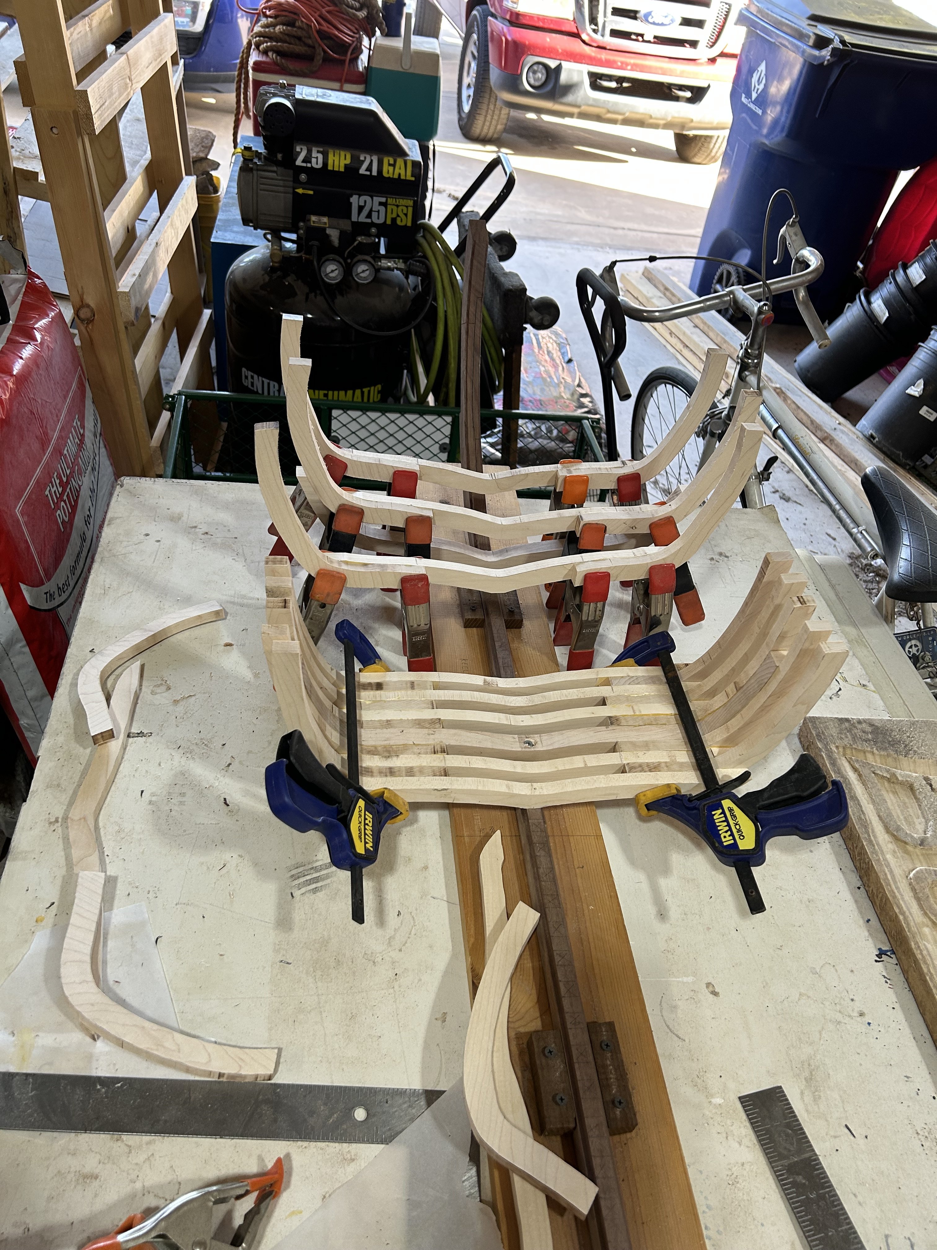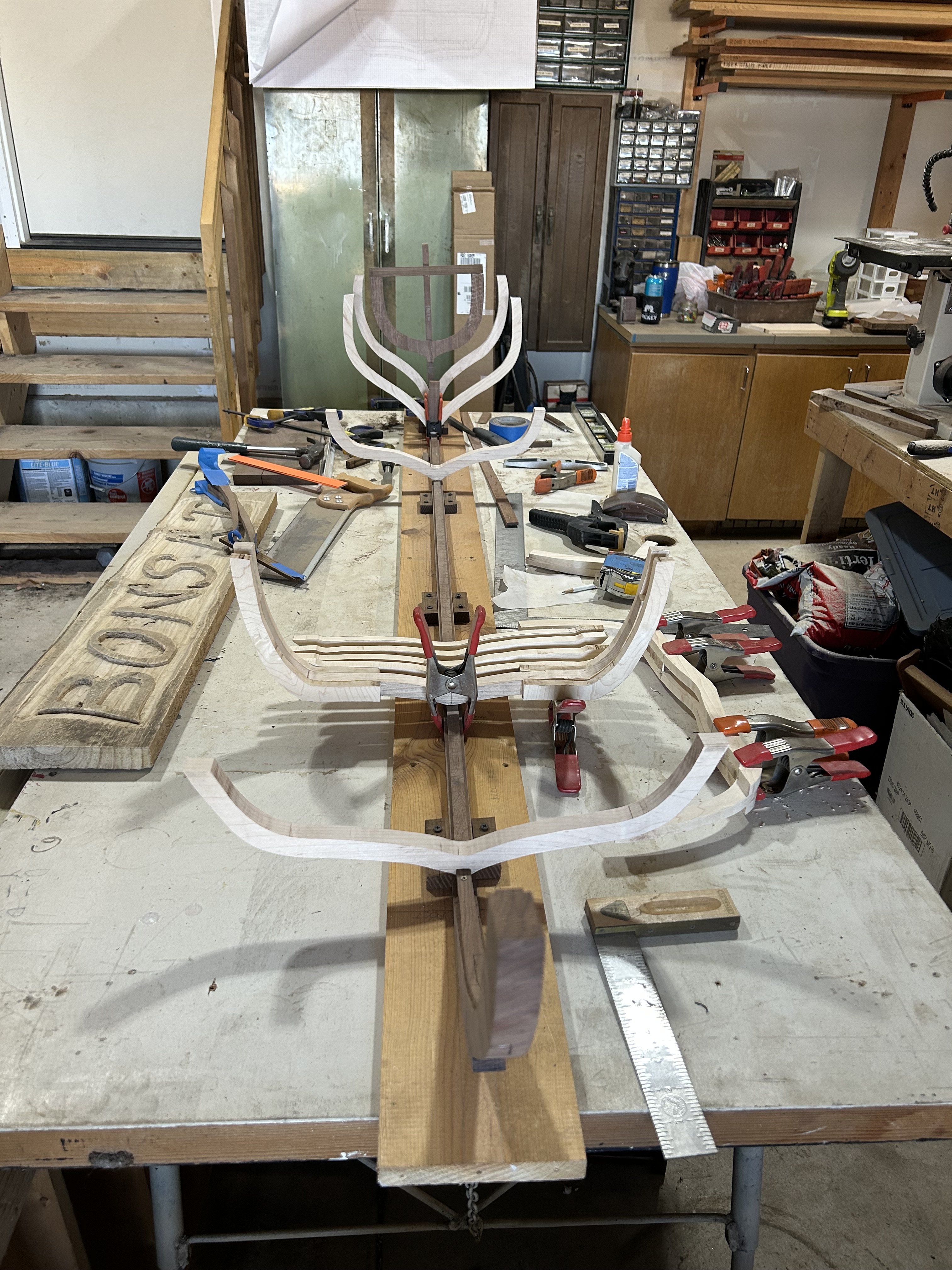 I’ve not updated in a while but work is progressing. Slowly getting frame pieces cut and fit. A long process especially since I have to make my own templates. I am concentrating more on the middle of the hull first as it is easier than the bow and stern. I have begun testing some pieces for those areas but nothing mounted.
