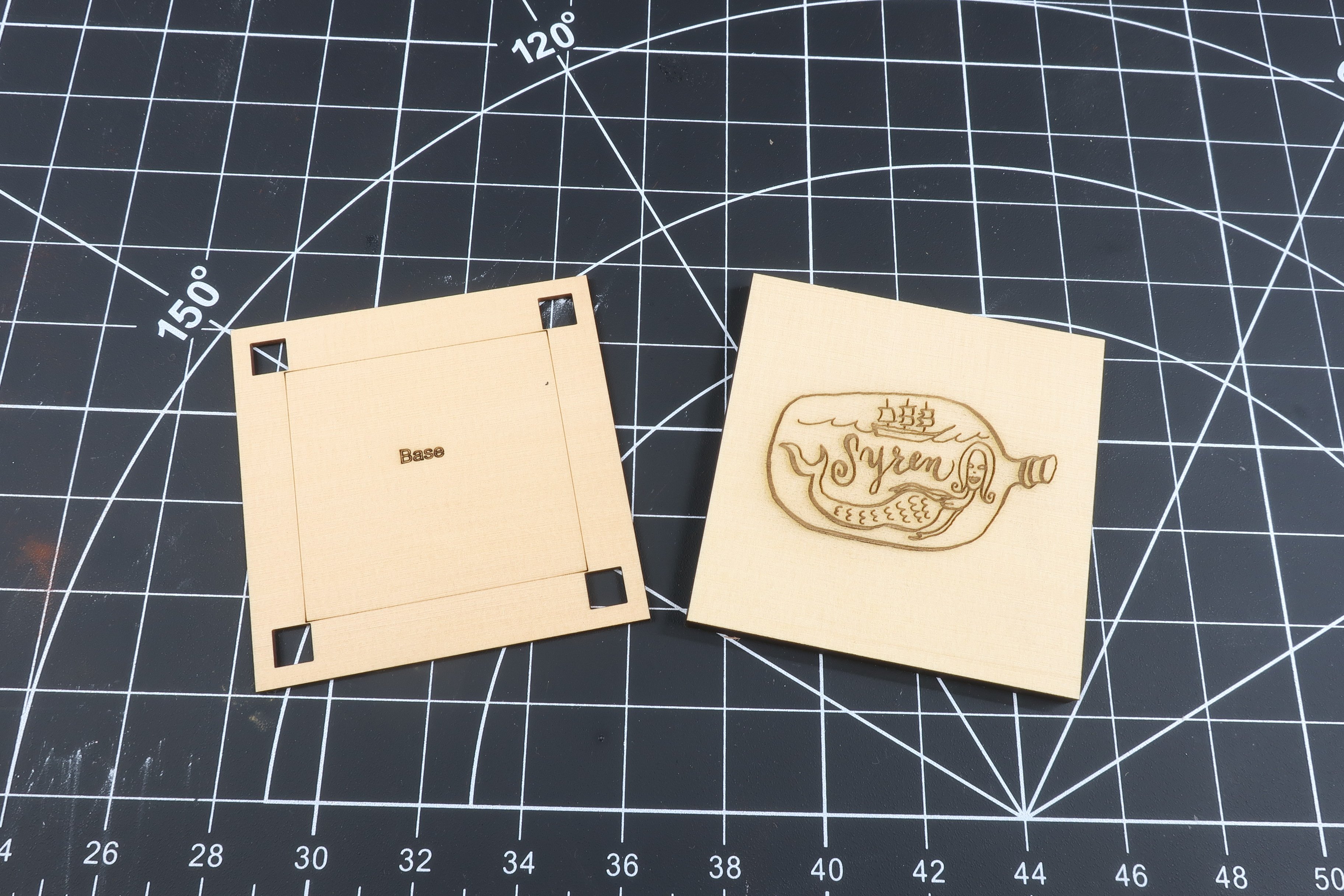 Glue a section on opposite sides first and then glue the remaining two in position next with the top edge being flush with the top edge of the base.   Clean off the laser char from the top and bottom edges first though.