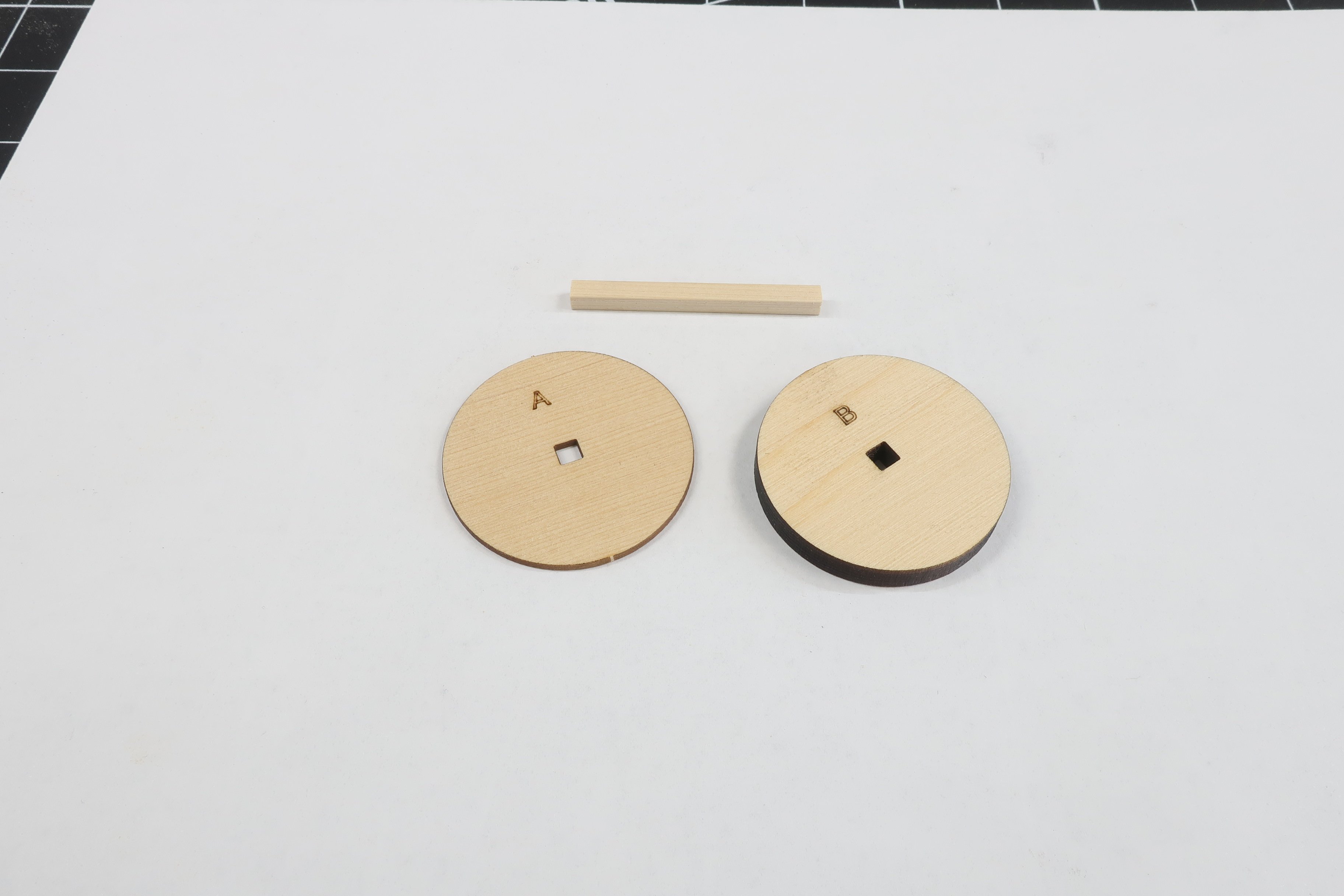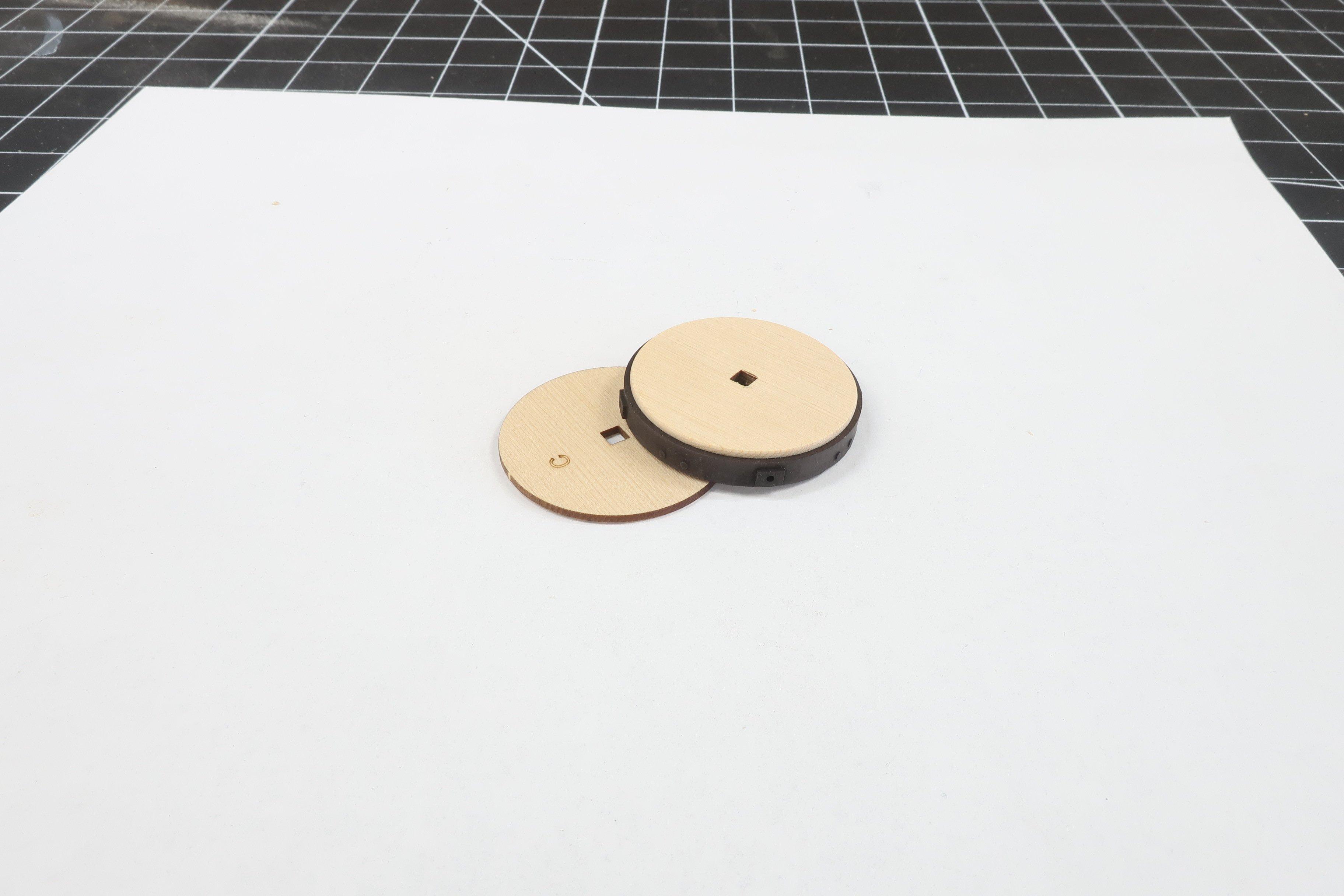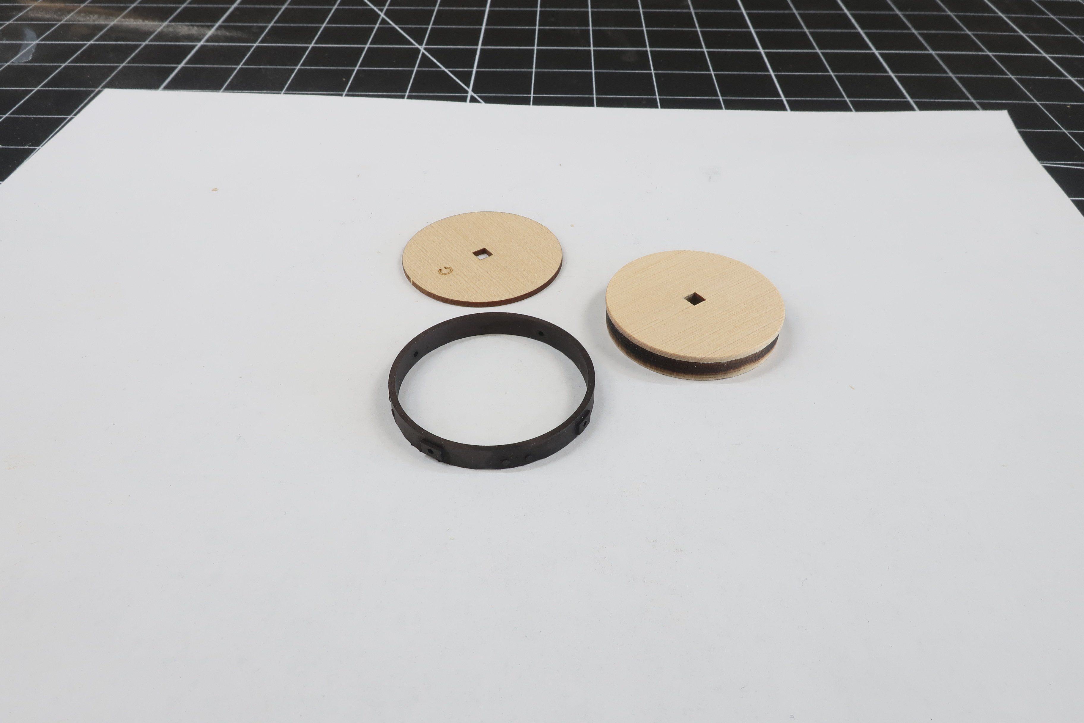 You will notice the little rectangles with holes along the edge of the ring.   They are closer to one edge than the other.  Slip this onto part C up against the lip created by part A.   Just slide it on there!!!  No glue is need.  This should be a nice press fit also.  If not and it is too loose then add some glue.   That just means that your laser Kerf was to large and your laser cutter settings were set too high when you cut that disc.  This made your part B slightly too small.  Its an easy fix and not a huge problem.  Cut another on lower power or just use some glue.