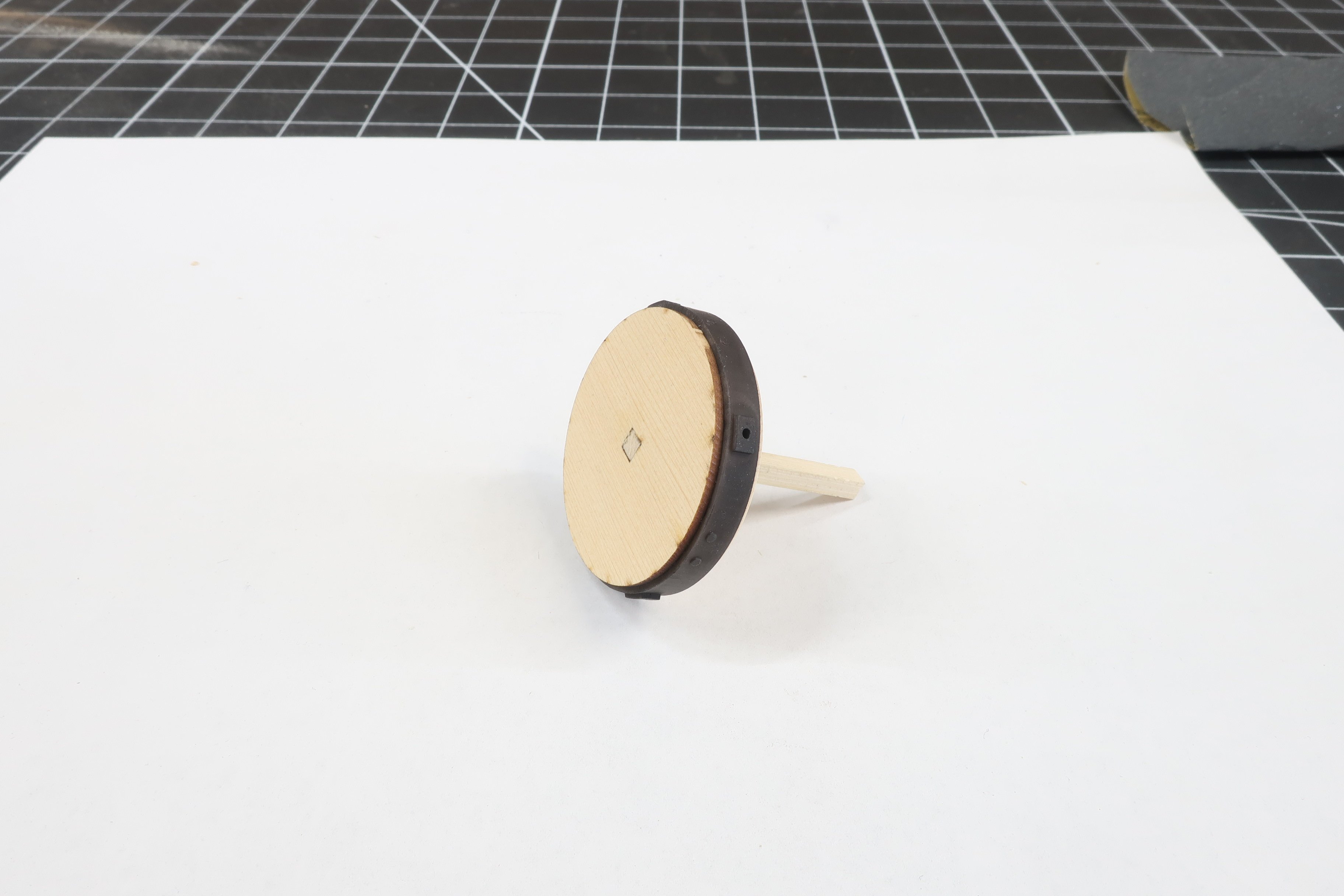 Then get parts LD3 ready.  LD stands for lower drum by the way.  Glue those onto the assembly.  One on each side.  These are very thin so dont force them or they will break along the grain.  Then chock it up again and start sanding and shaping.  These discs are larger in diameter with some extra size on them.  Dont be afraid to remove the char and reduce the diameter.   Sand the edges and soften them.  They are indeed also rounded off a bit.  Refer to the plan to see the profile of each layer you add as you proceed.