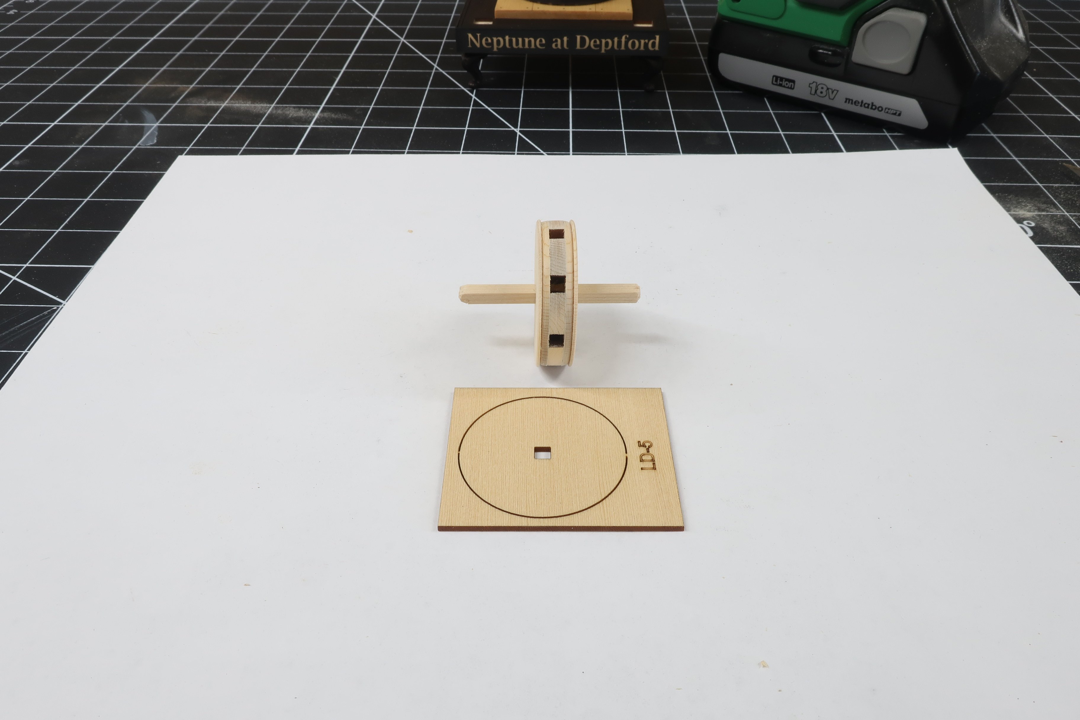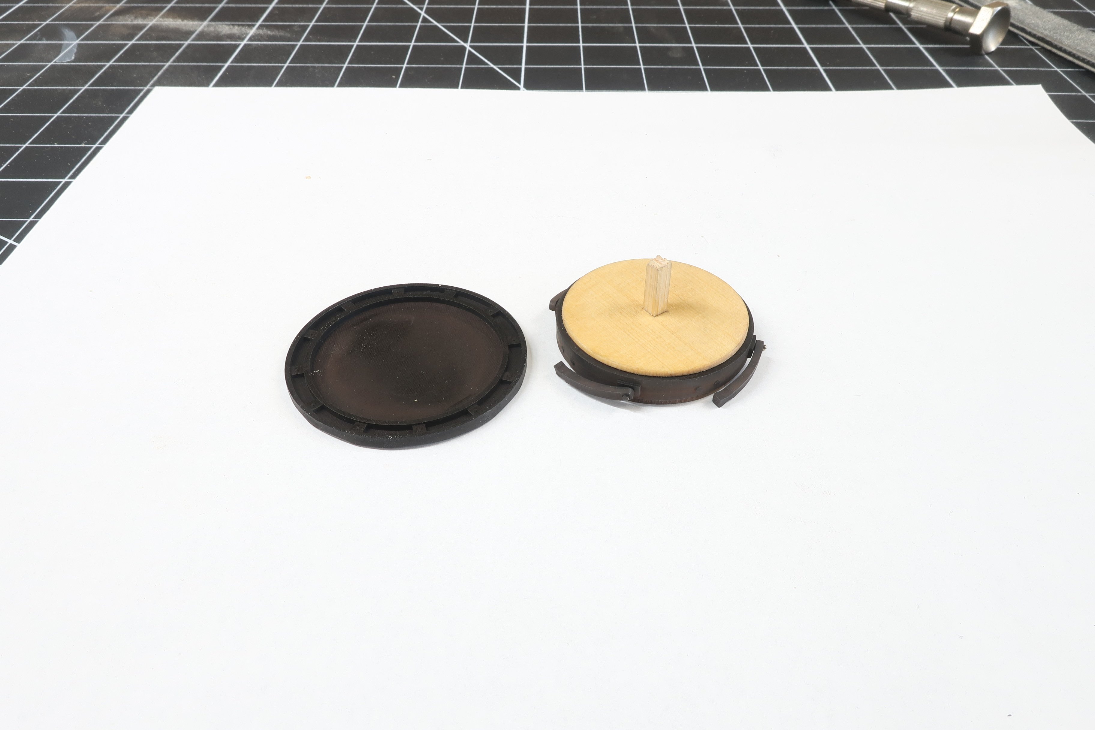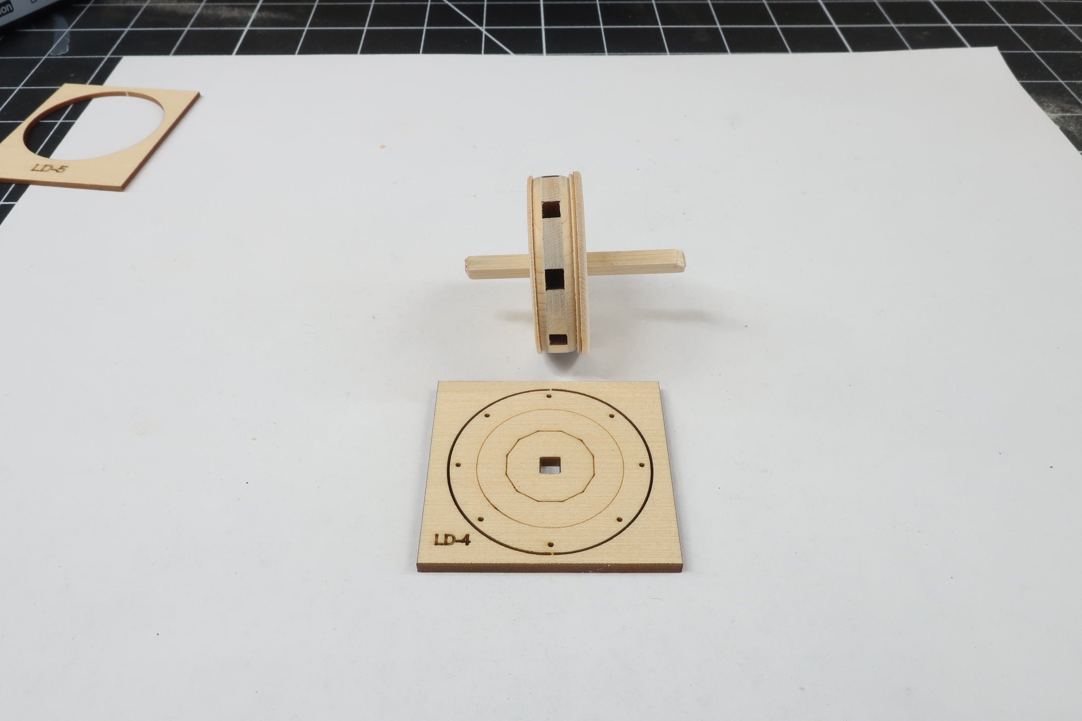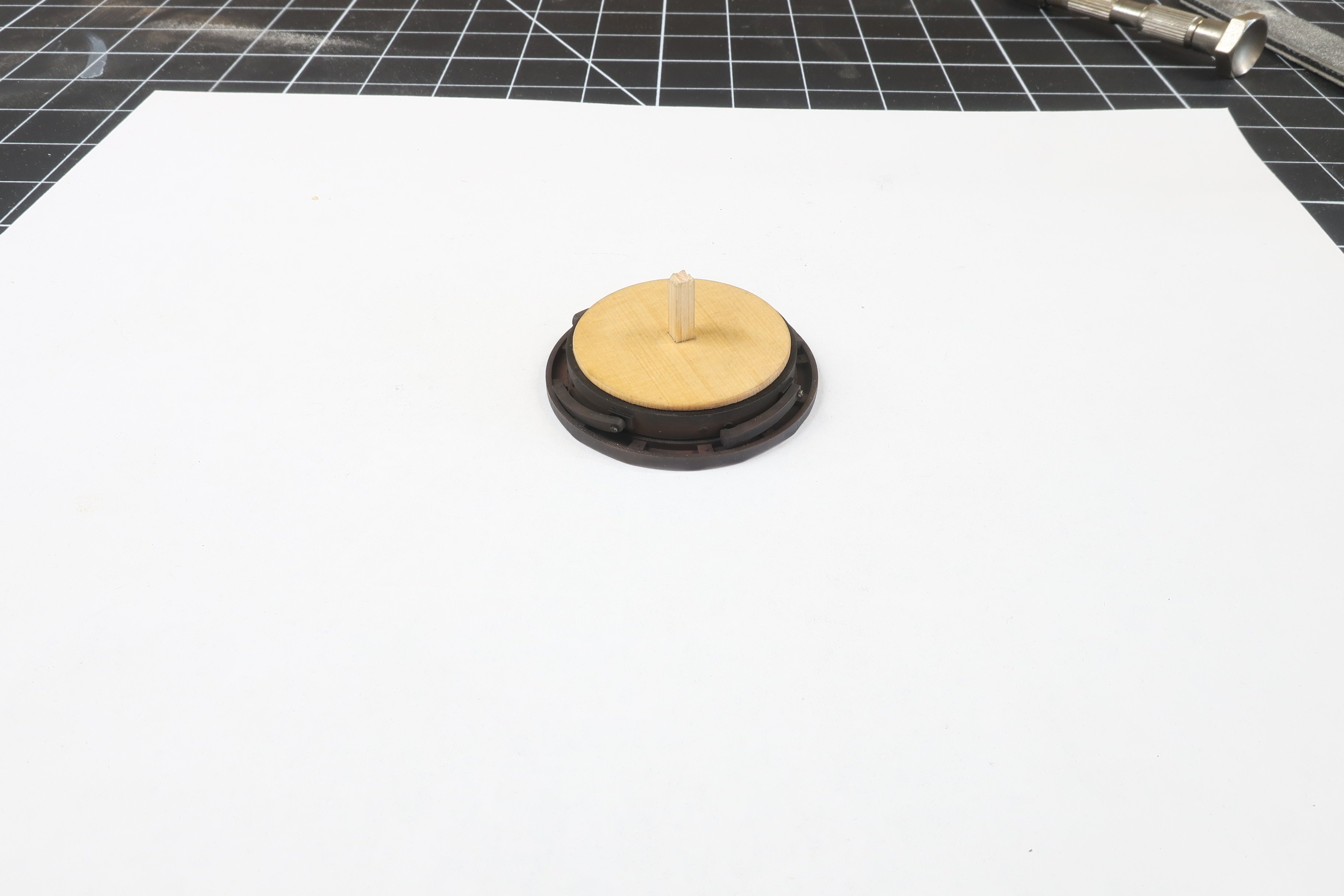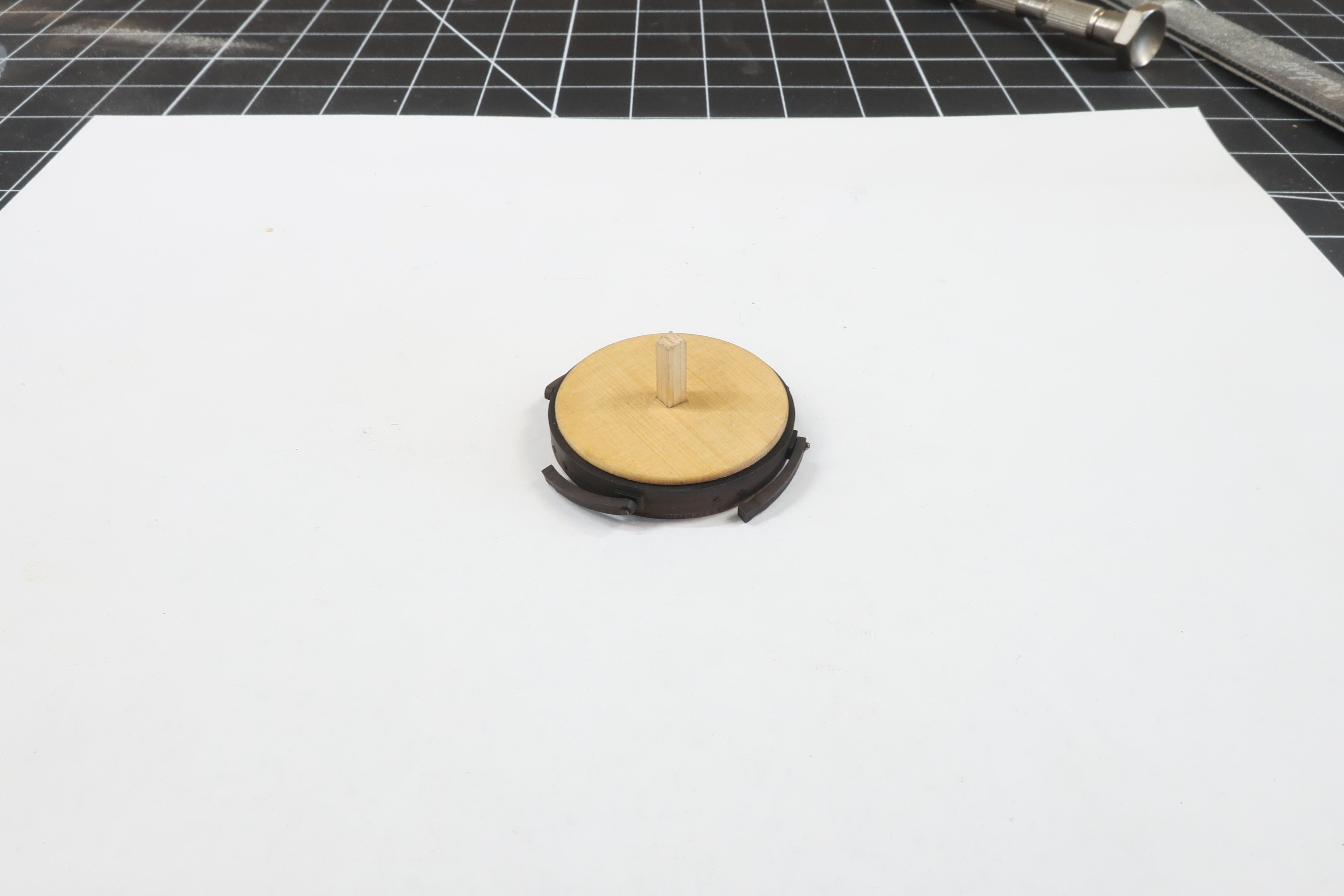 Next you can glue the 3D printed pawl base on top of the capstan partners.   It will fit right in the laser etched circle on the top of the partners.   Its orientation doesnt matter but just center in that etched circle.  I used CA glue for this.  It does a great job gluing the resin parts to the wood parts.  But you do have to position it quickly before the glue sets.   So keep this mind.  Dont dilly-dally with getting it centered.