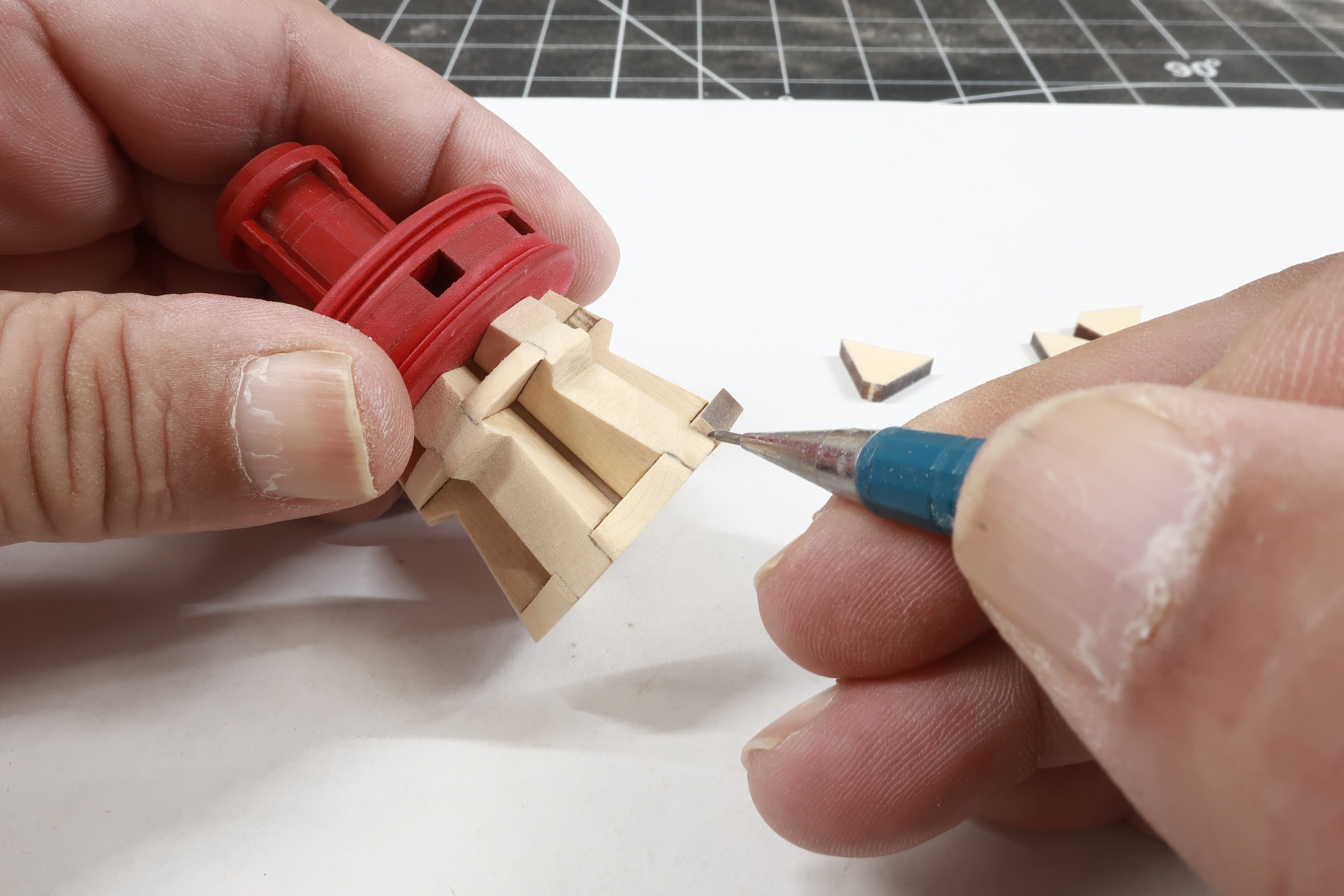 So first,  sand a chock on its small edge to knock off the sprue nub.  Not a lot.  but just flatten it out.   Then sand both sides so its a nice pie shape and your chock can slide all the way into position.  The back edge should touch the column.  The two sides should be nice clean and tight fit in their whelp slots.   No gaps.   Take you time.  There is plenty of meat on these.   You will be sanding them and testing them and then sanding and testing more.   Test fit them until they slide in with a nice fit.  You will grow accustomed to how much to remove and where after the first few chocks are completed.