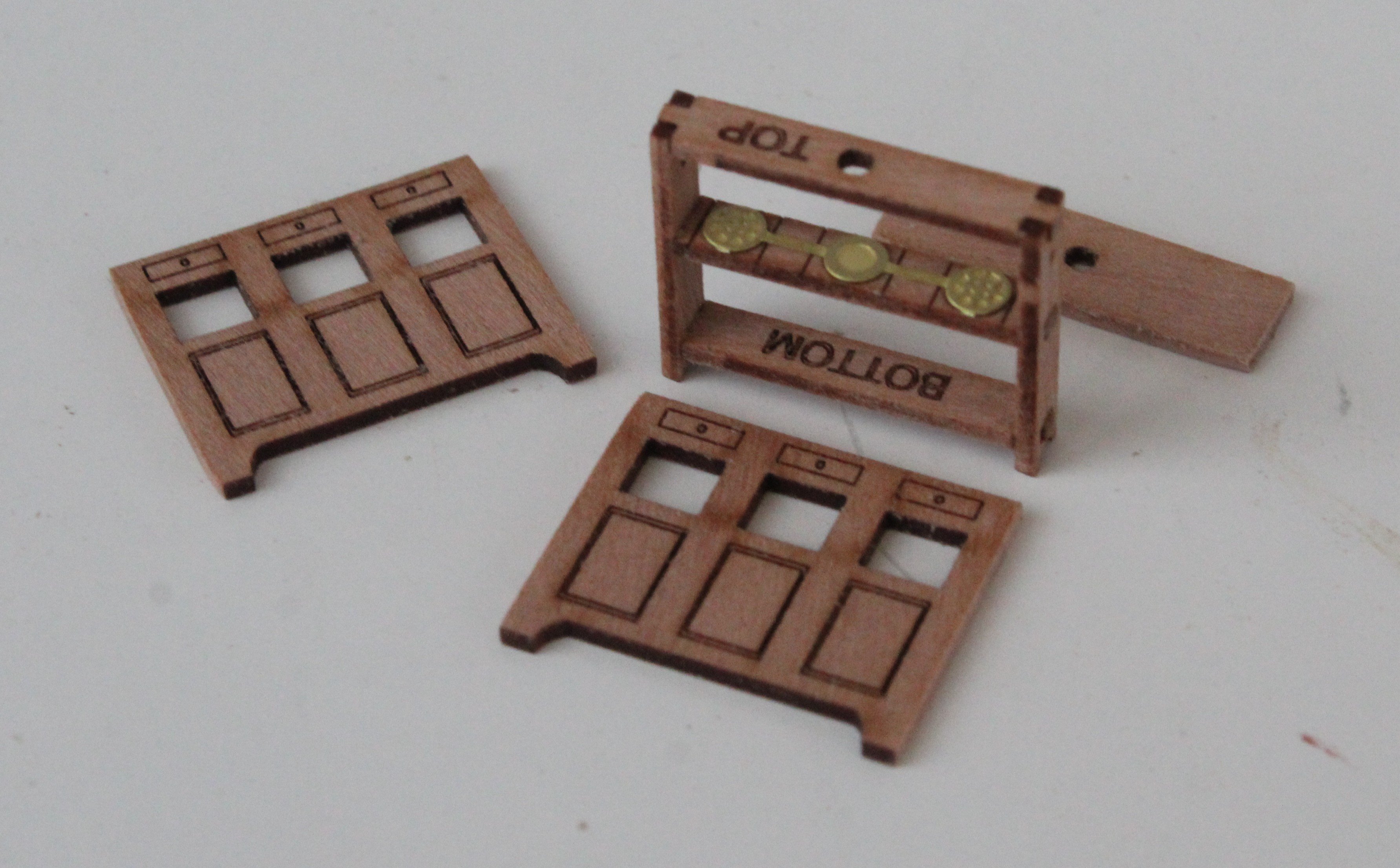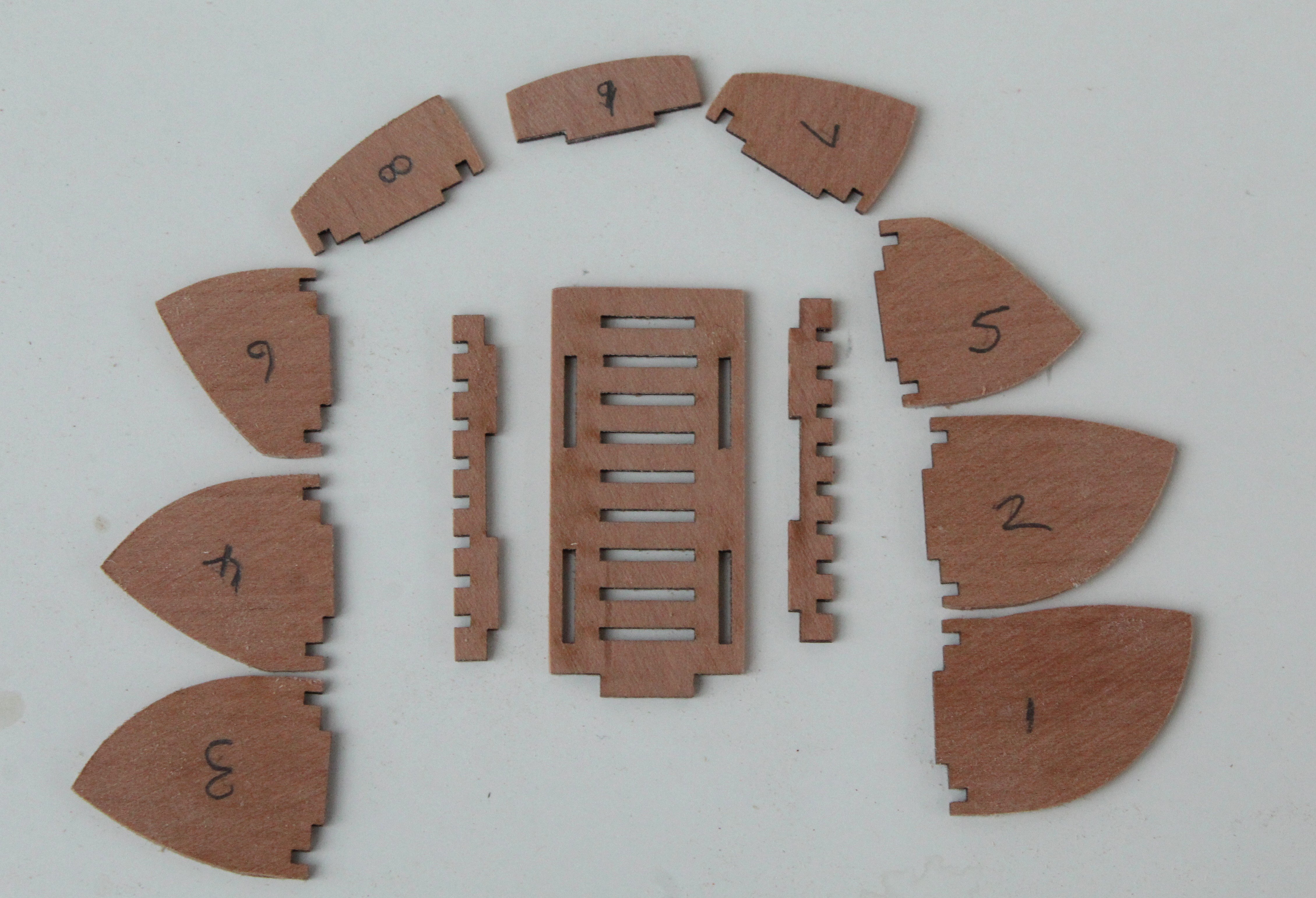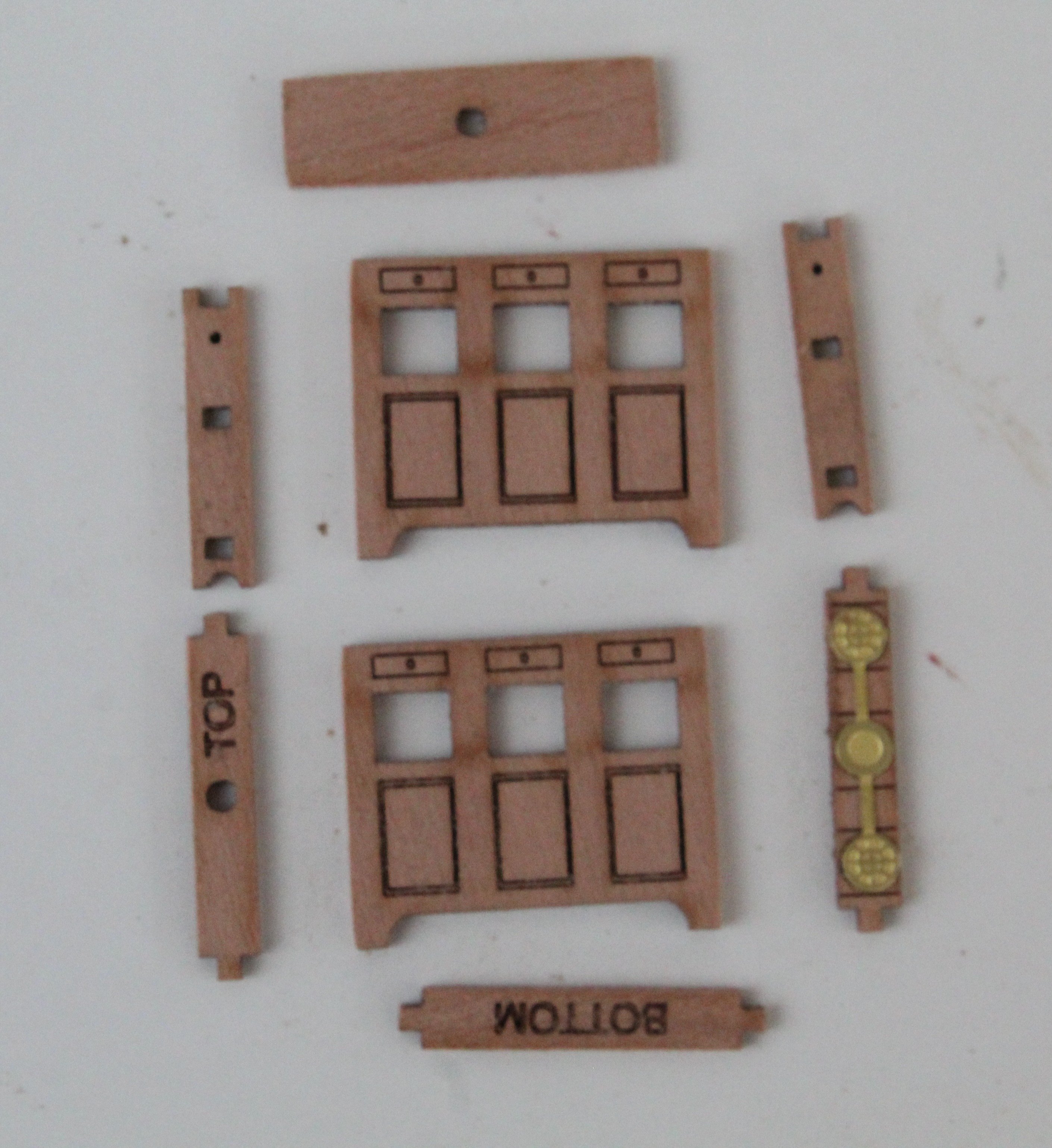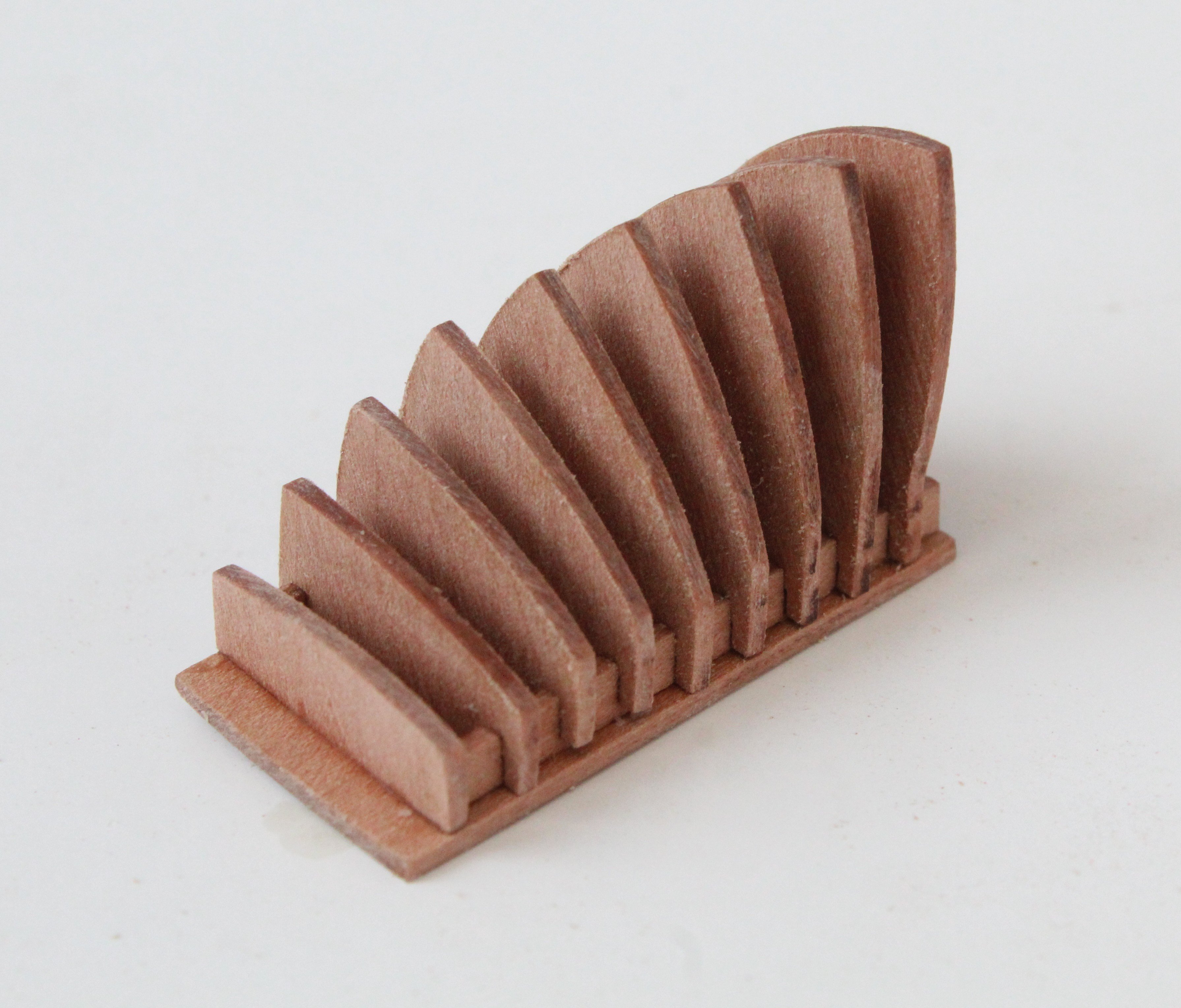 I really like the curved stairs to the main cabin so thought it would be a nice easy build task. The parts were removed from the sheet and the laser char removed from the stair edges. As each rung was removed, I annotated their positions on the underside.