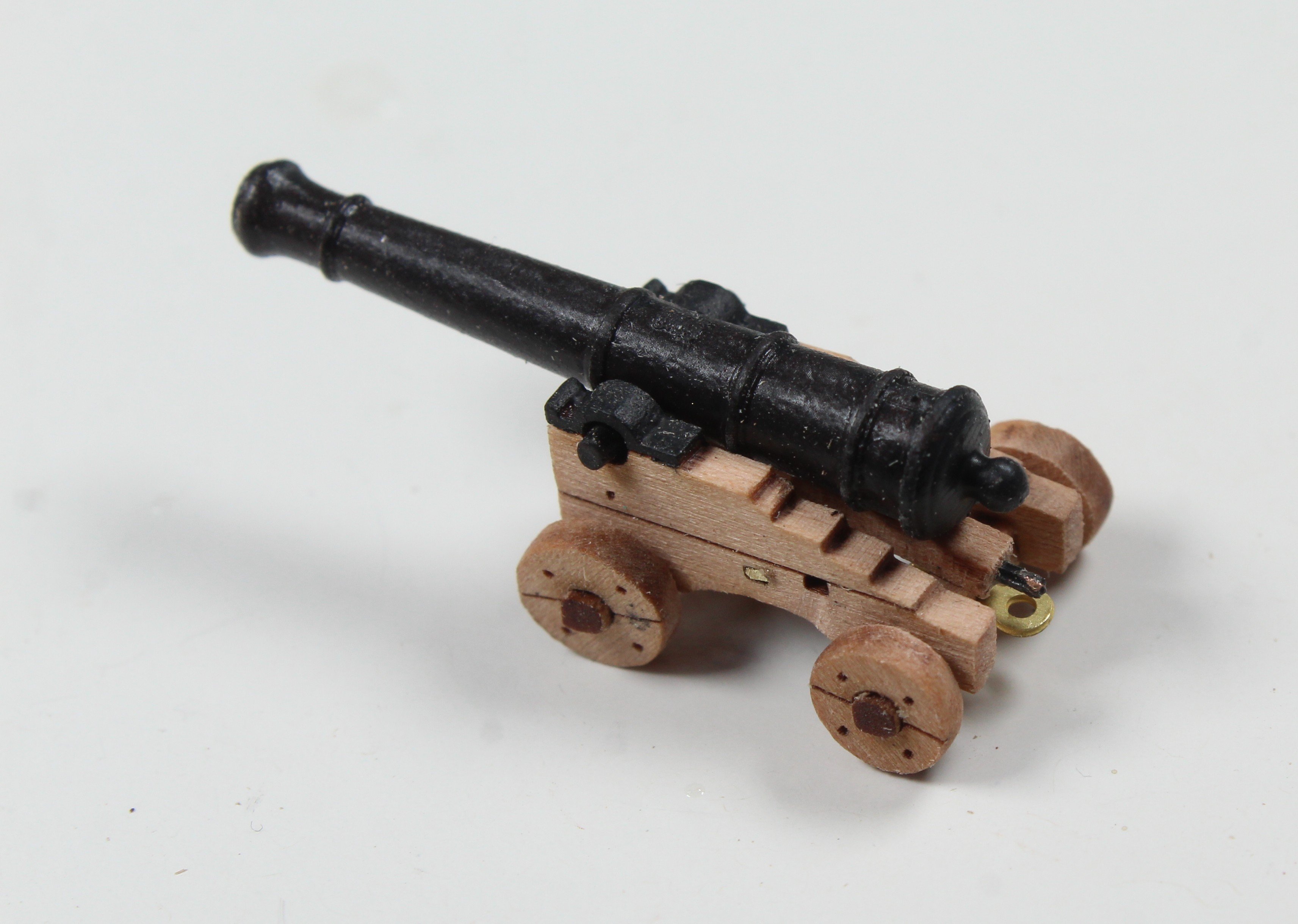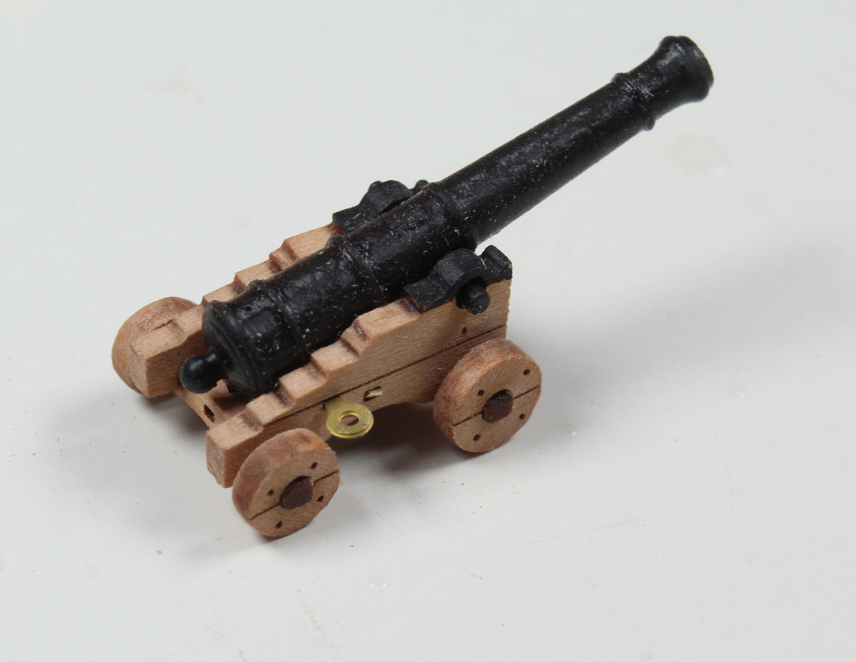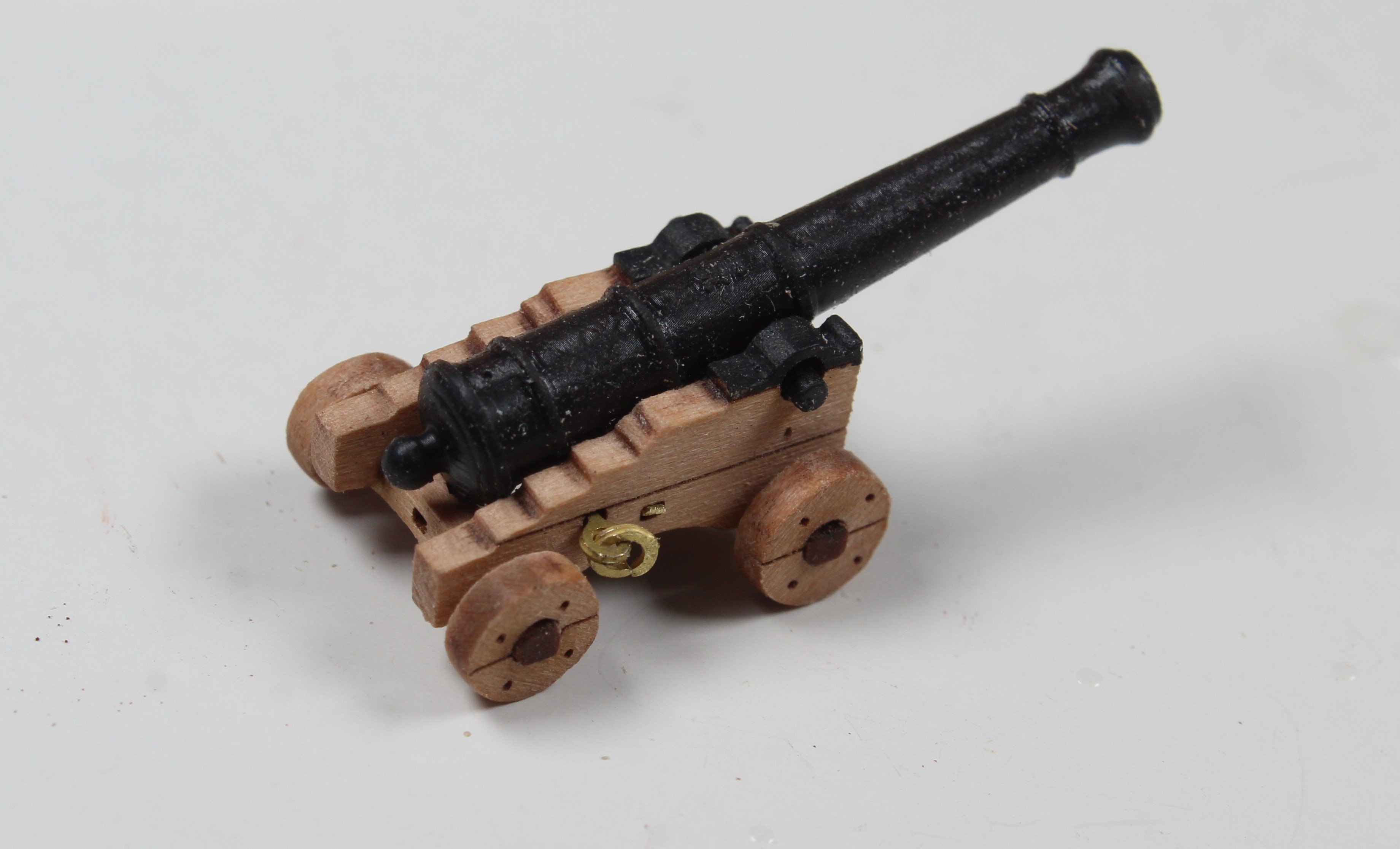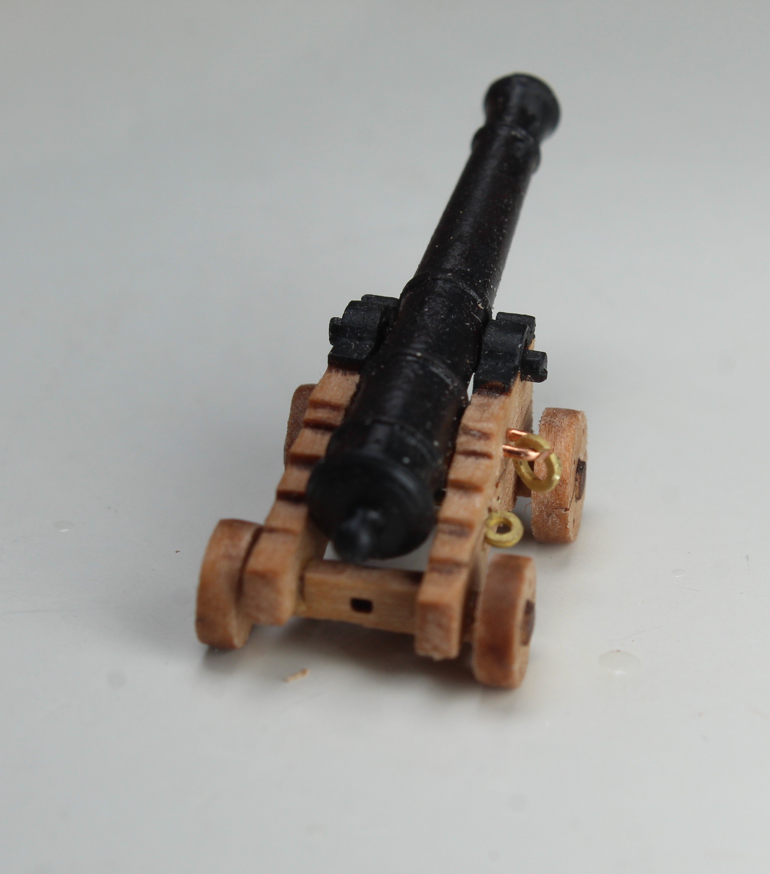 I have built one of the ships cannons. I did not encounter any problems when assembling the various parts. The most time consuming aspect was removing the laser char from the cannon side edges and wheels. I have not done a brilliant job of the removing the char from the ships wheels but I think they look reasonably OK. I did use a top end of a belaying pin to add a handle for the quoin. I think the handle looks OK. Should I paint the quoin black, thoughts anyone?
