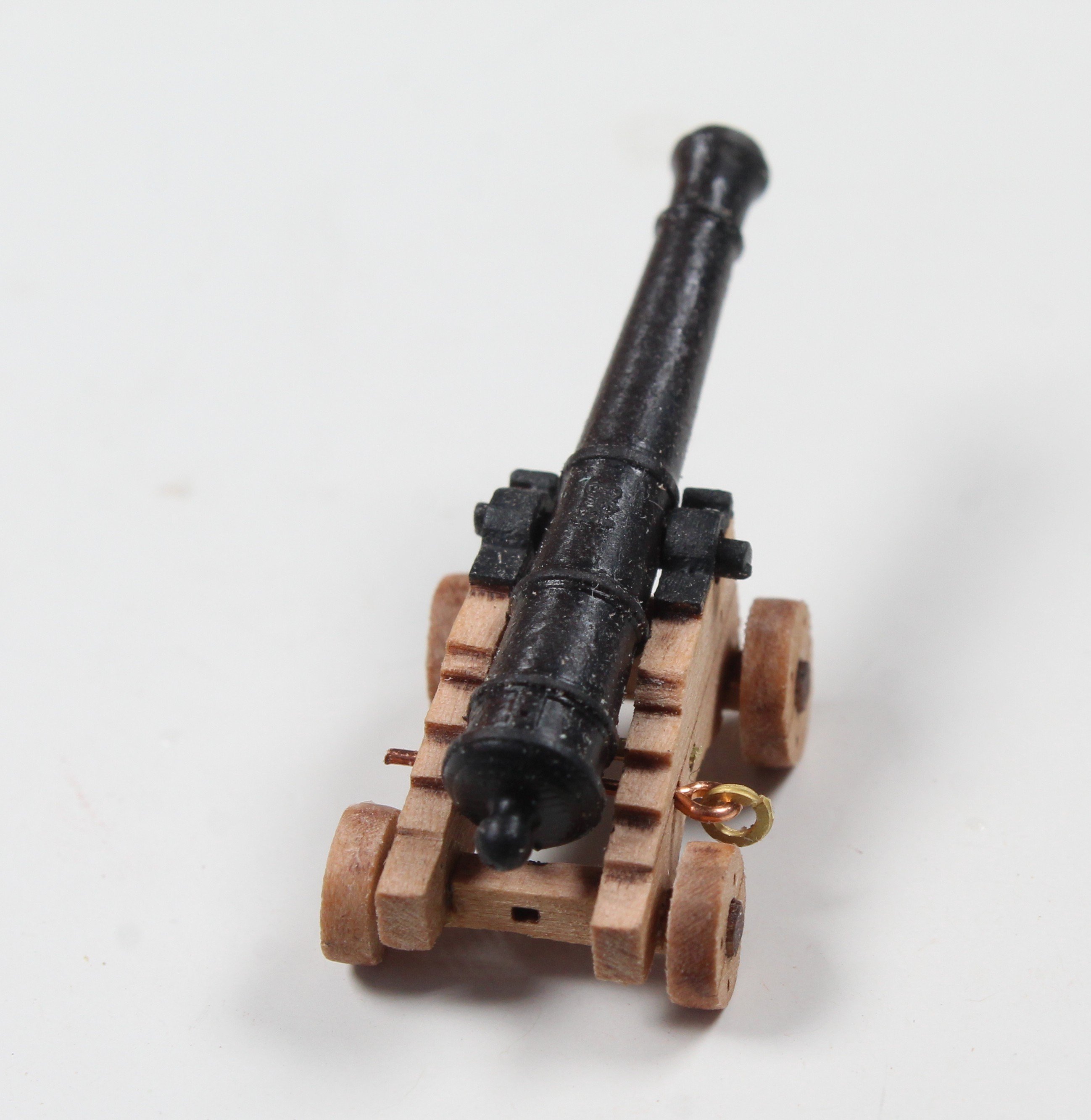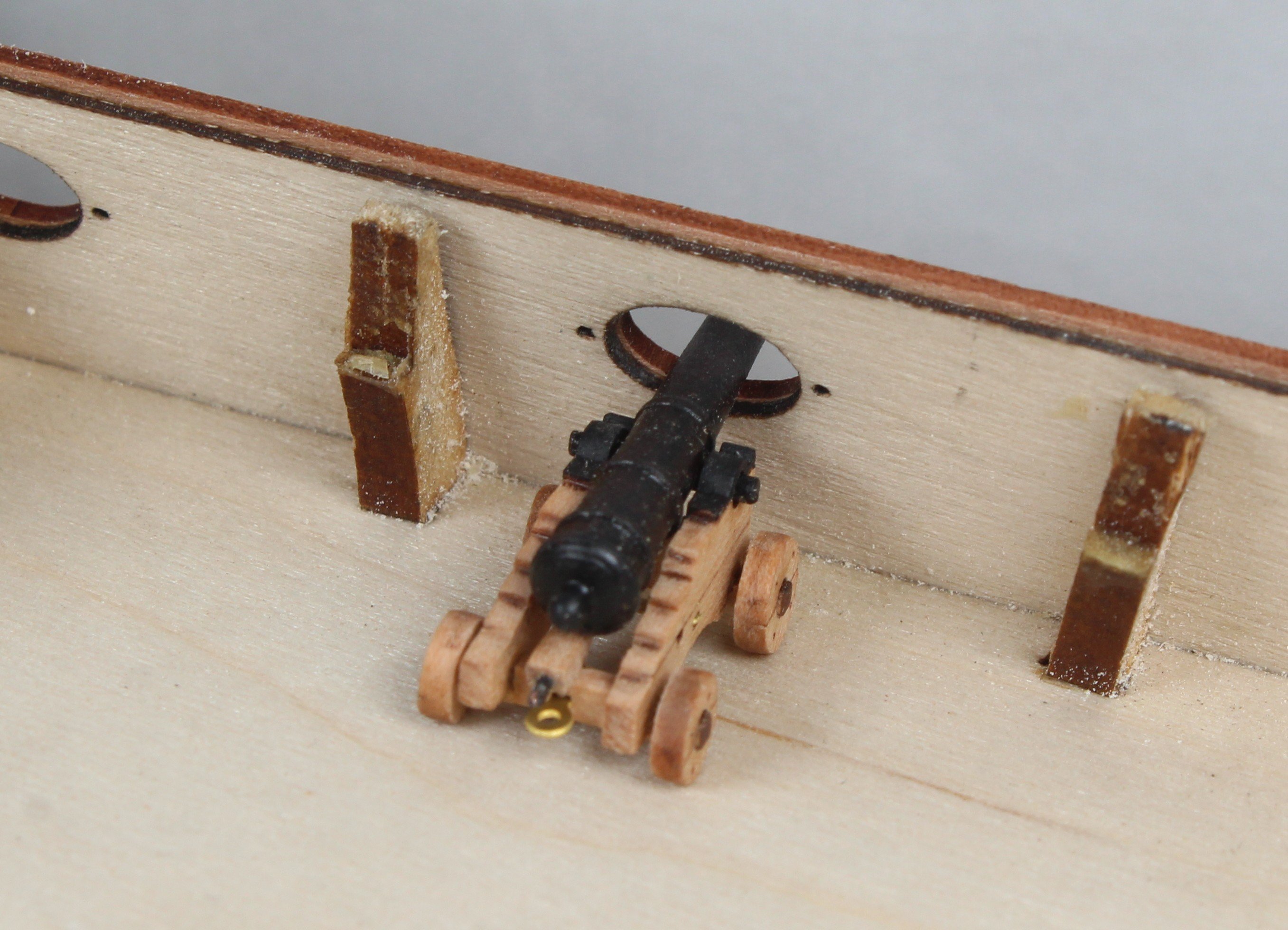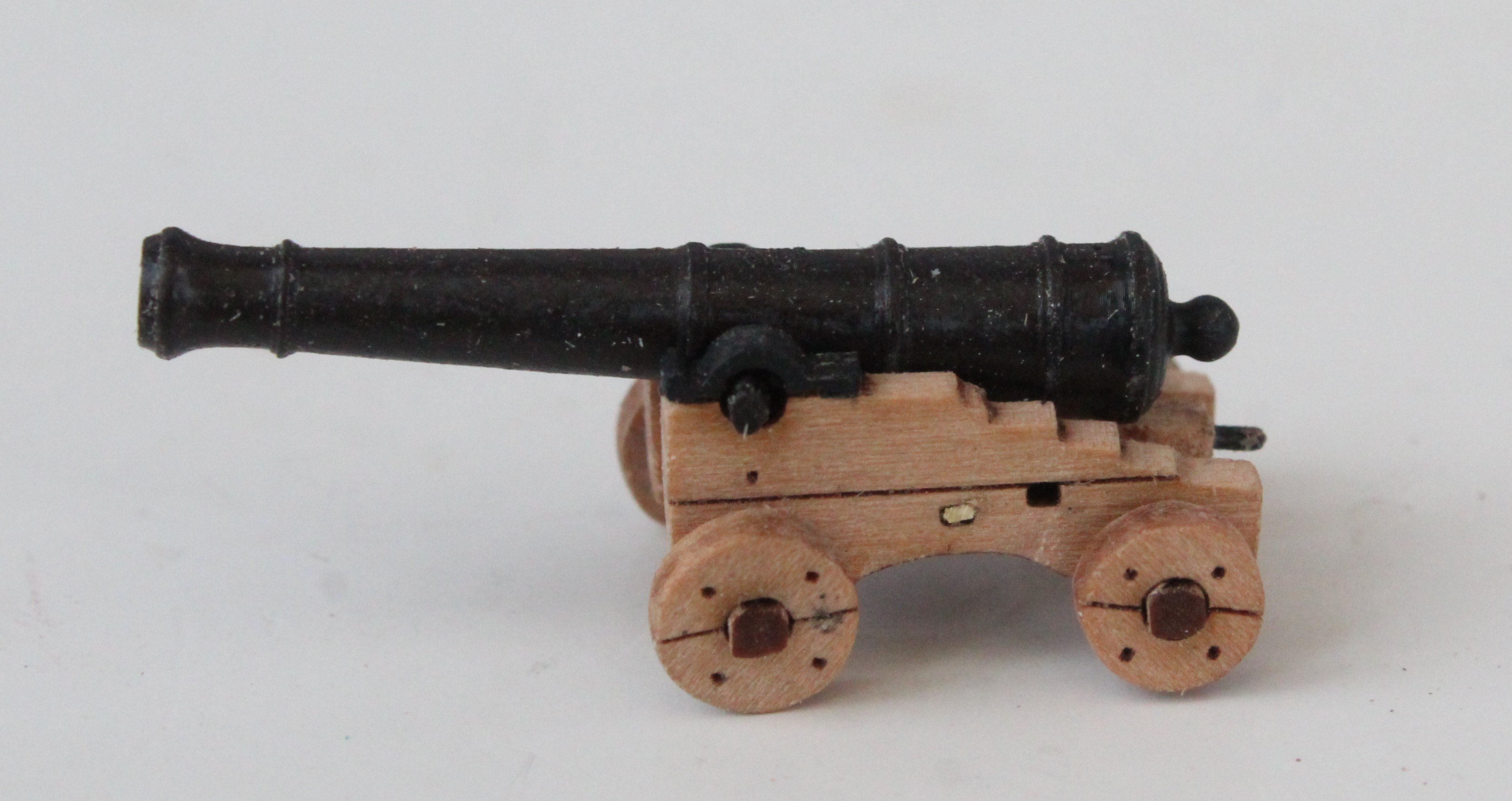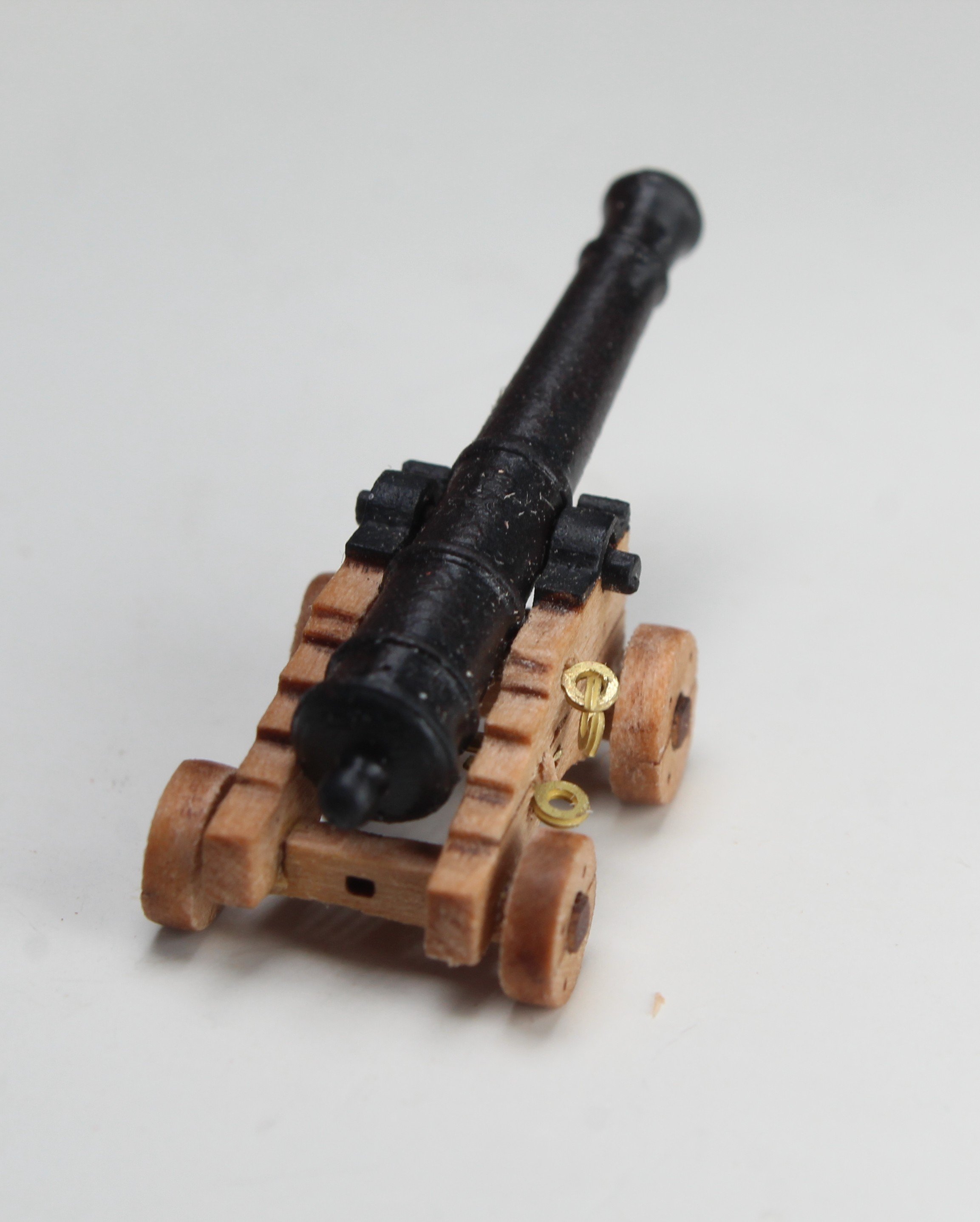 I have built one of the ships cannons. I did not encounter any problems when assembling the various parts. The most time consuming aspect was removing the laser char from the cannon side edges and wheels. I have not done a brilliant job of the removing the char from the ships wheels but I think they look reasonably OK. I did use a top end of a belaying pin to add a handle for the quoin. I think the handle looks OK. Should I paint the quoin black, thoughts anyone?