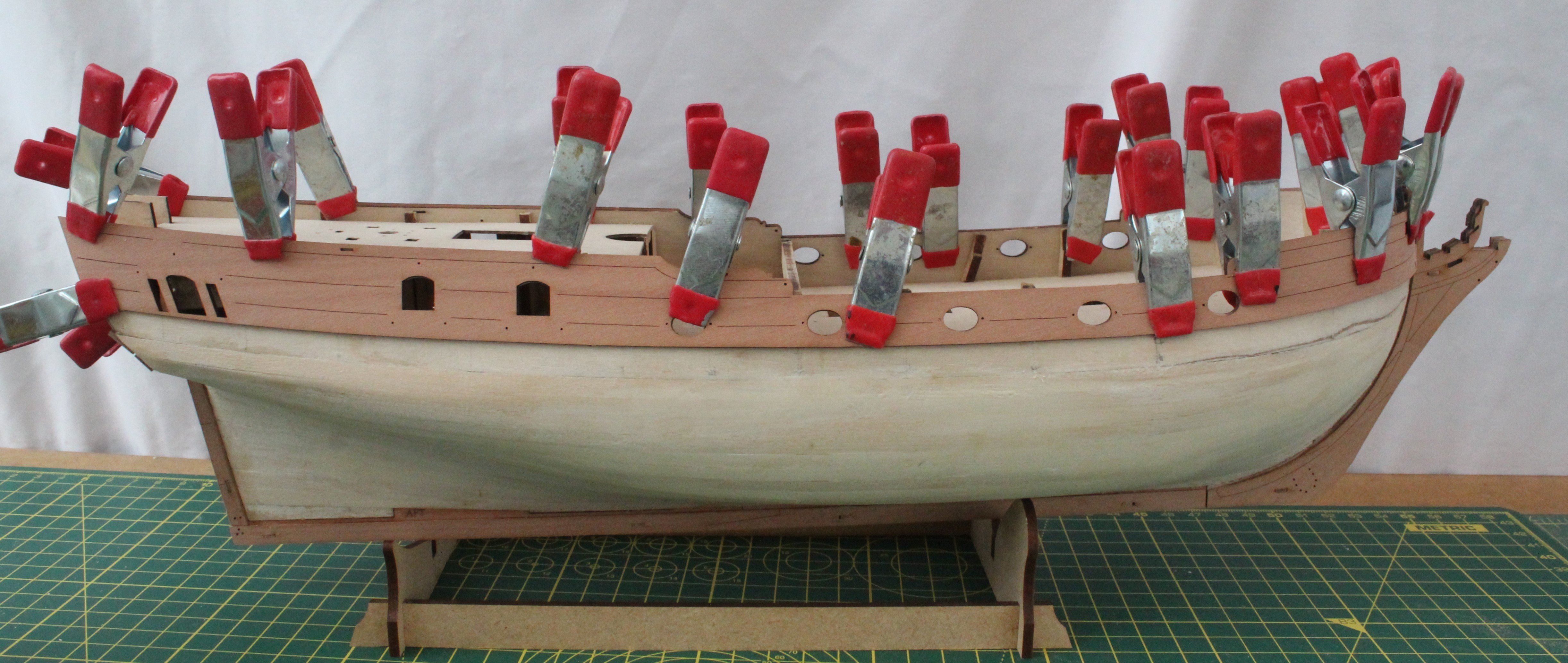 With all the bulkheads, longitudinal patterns and bow patterns added to the false keel, taking care that the pre faired bulkheads were all facing the right way, some diluted PCV glue was brushed into all the joints. The hull assembly will now be left for several hours to allow time for the glue to fully cure before I will move onto the next task.