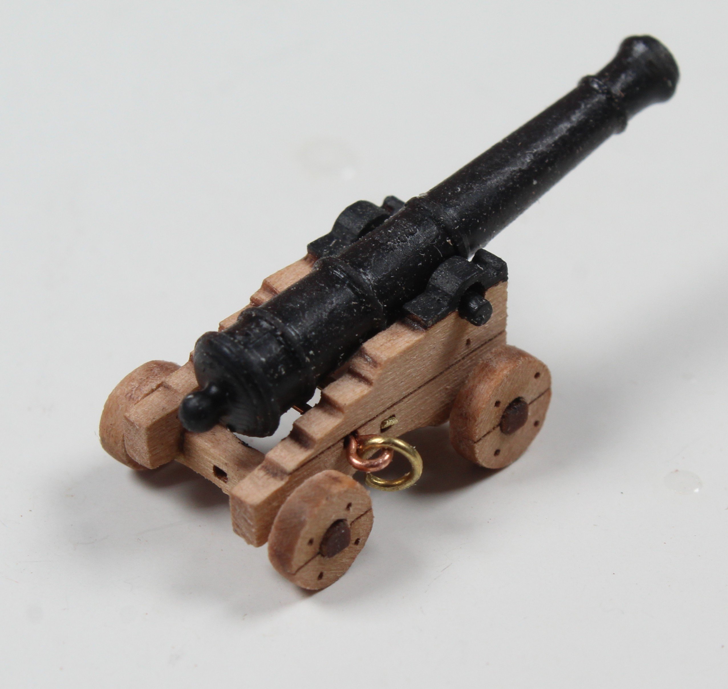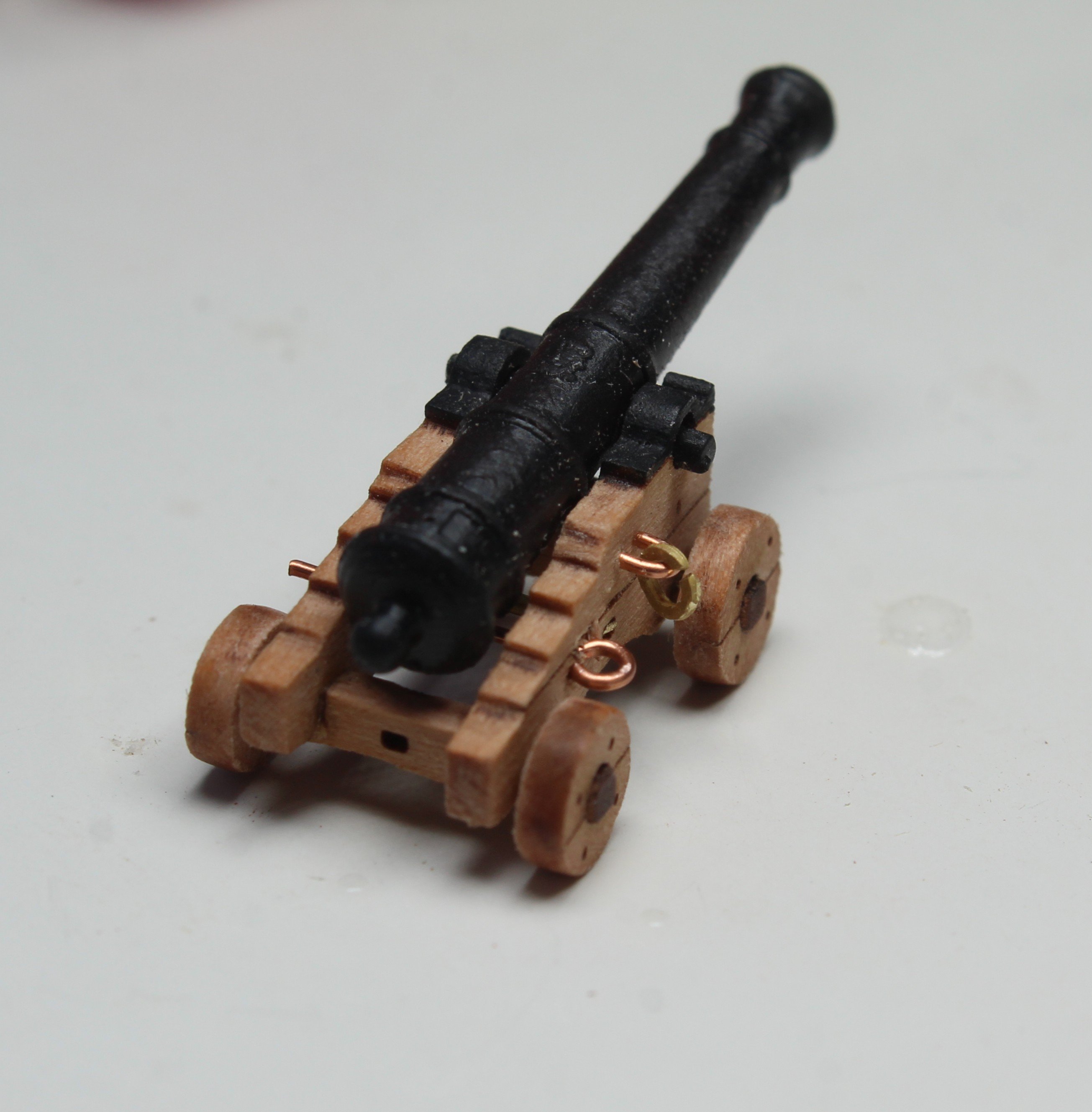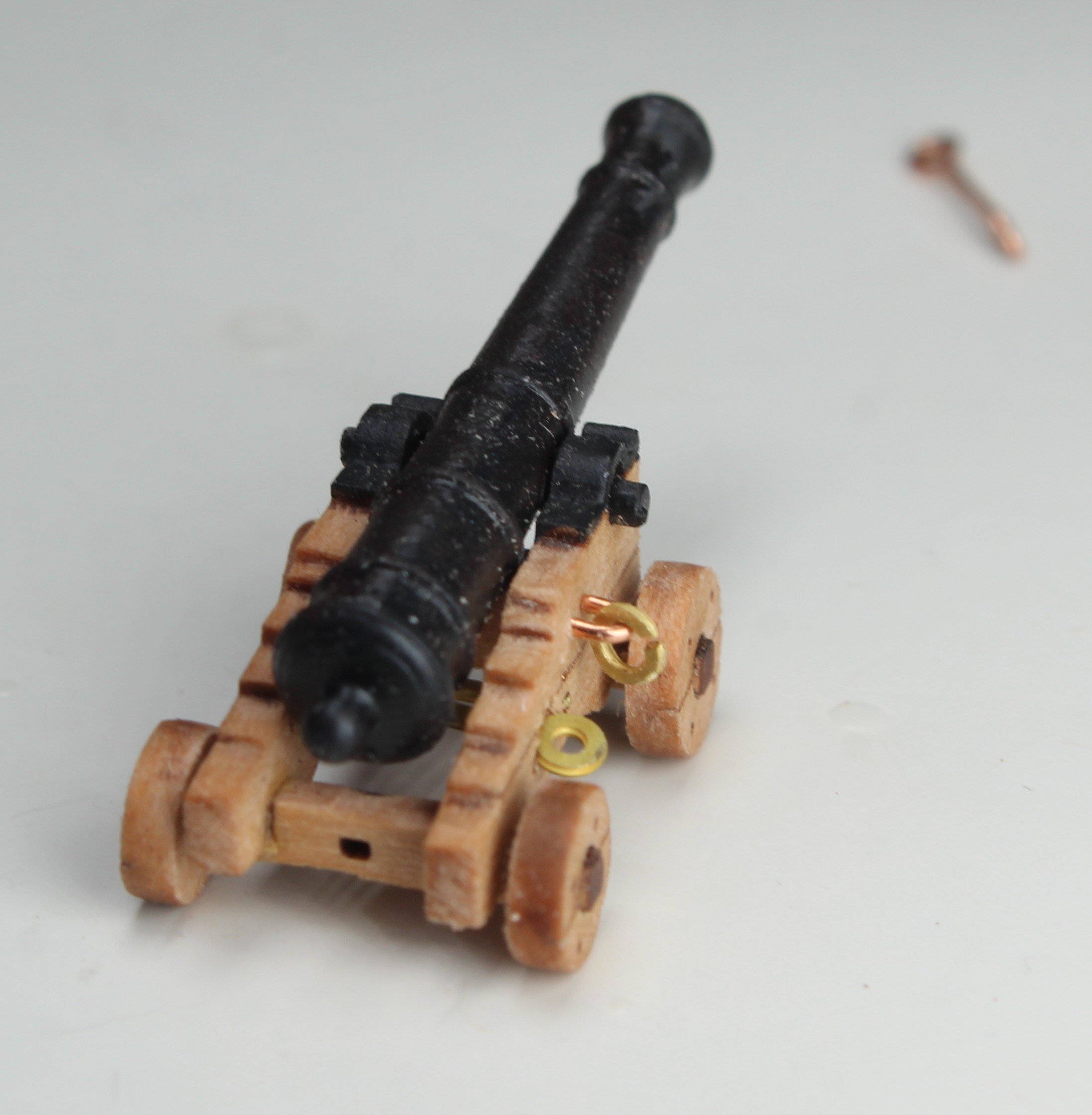 After a bit more experimentation with the cannon I have come up with the following. I drilled a small hole in the side panel for the breech line rigging ring. I then made an ring attachment hook and attached the kit supplied ring to it. The hook for the ring maybe needs to be a tad smaller. I have also added a smaller eyebolt for the outhaul rigging. I think this cannon looks much better now and I know what is required when I assembly the 6 off production cannons.