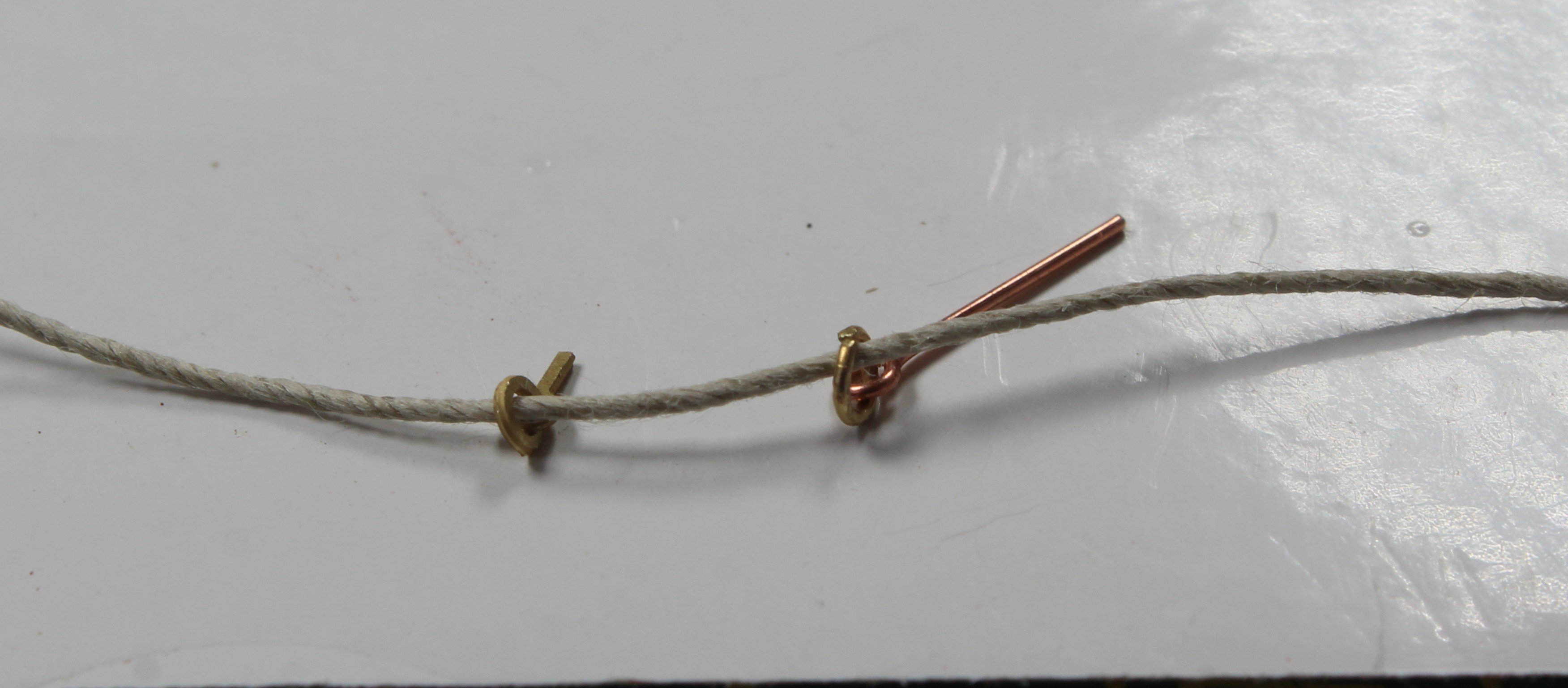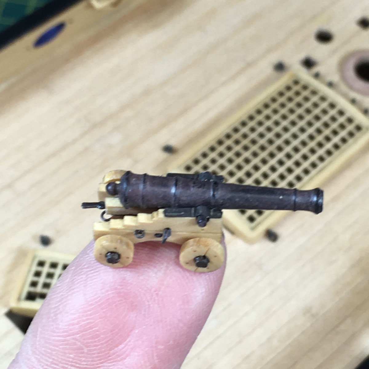 I am planning to use 0.75mm natural thread for the breech line. so I thought I would test the two different rings with the breech line thread. Based on this test I will use the smaller ring. To allow for the right amount of cannon recoil the breech line should be 3 x barrel length. I will use this as a guide when I get ready to add the rigging.