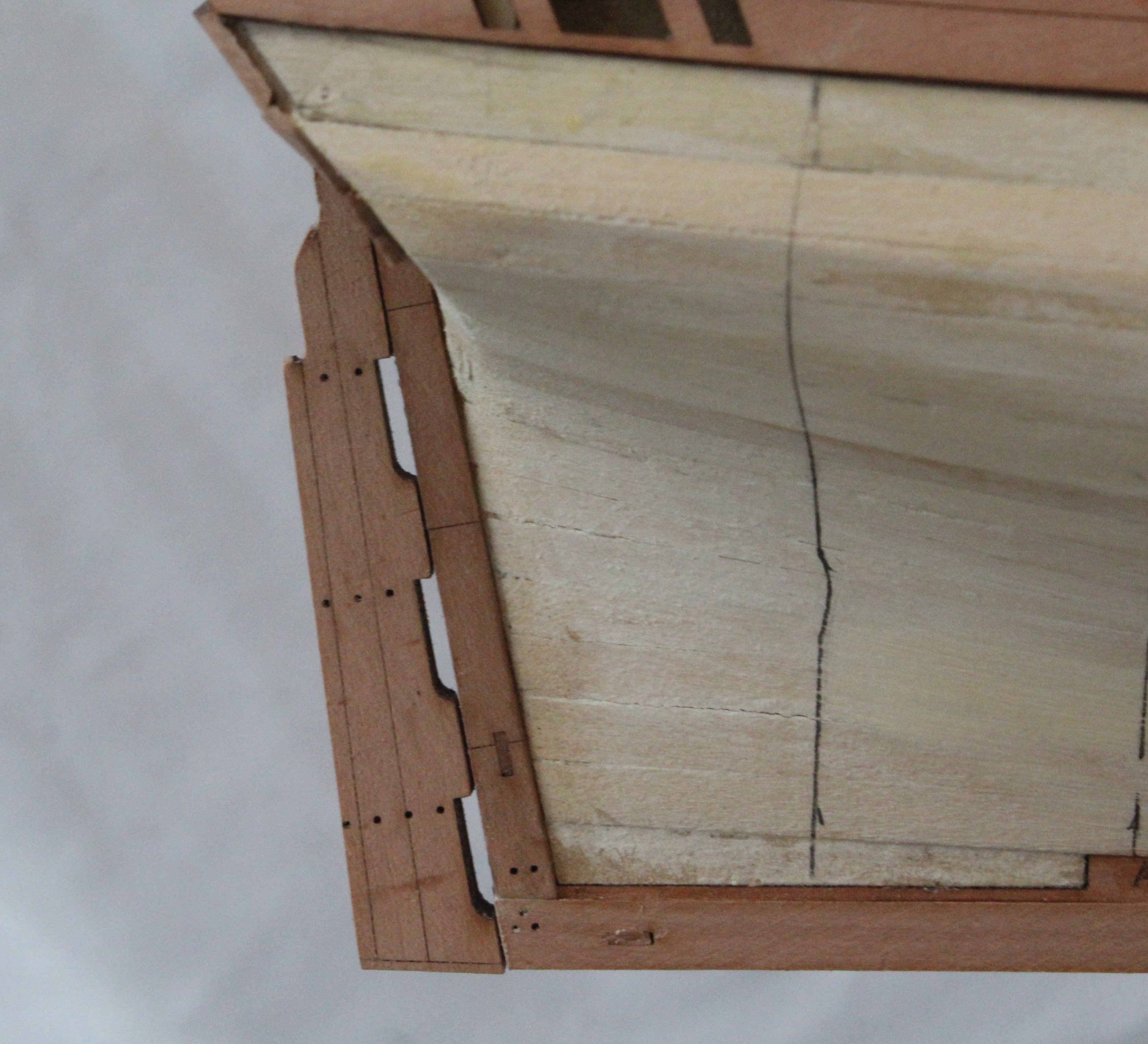 There are two stern filler patterns per side. With the patterns in place, I marked the pre fair lines. After the chamfering the patterns (using a sanding stick) they were glued in place.