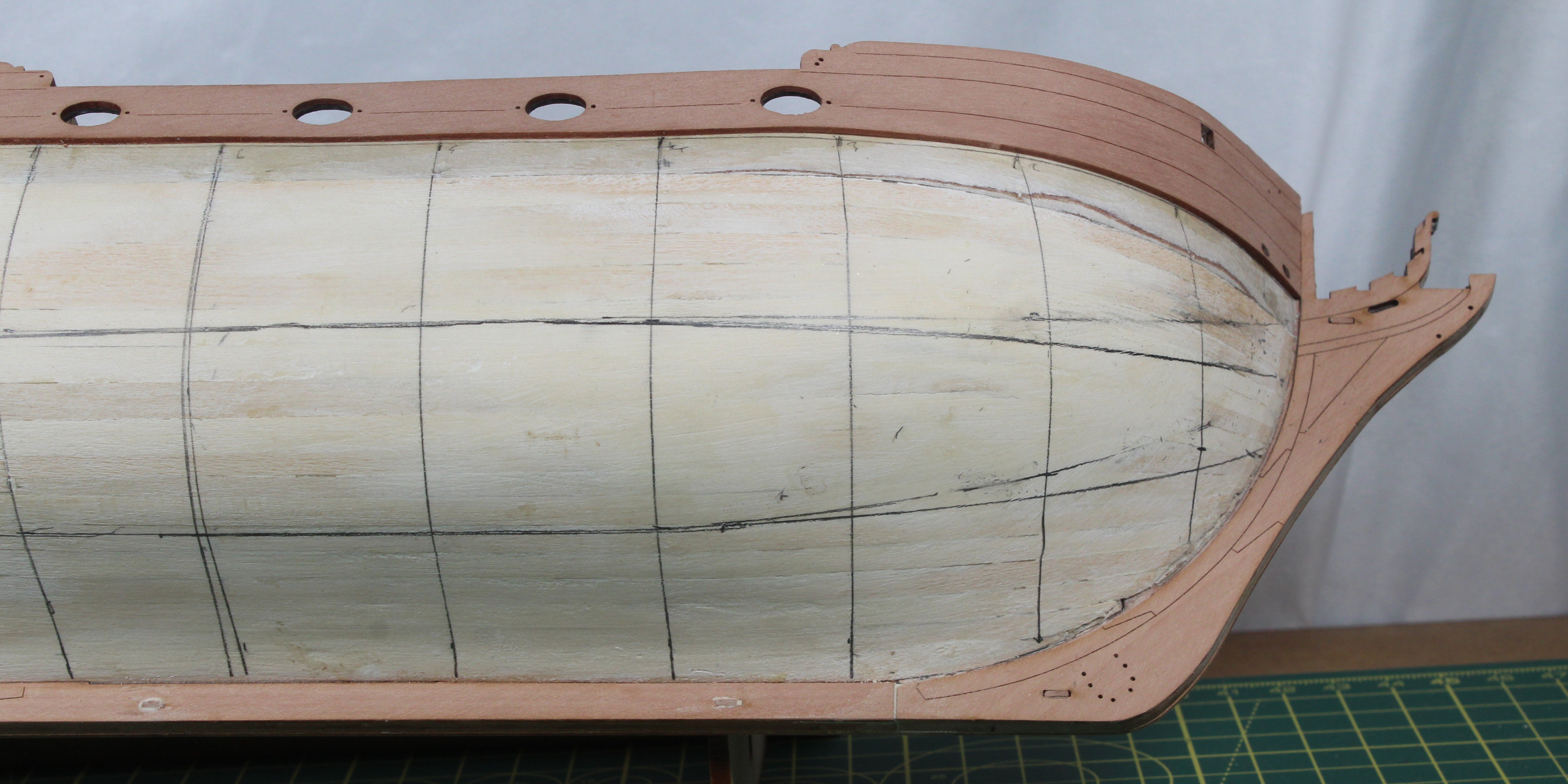 I have also marked the hull in readiness for the second planking. I am planning to install the hull planks, using a 4 butt shift pattern. The hull has been split into 3 bands, with 8 planks per band required at the midships. I have ordered some proportional dividers which I will use to taper the planks from midship to bow.