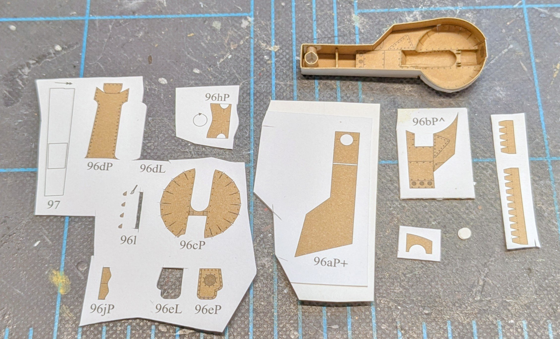 One more fuselage section added. The fit between the two sections was extremely tight -- too tight, in fact -- the result of not adequately beveling the aft-most cockpit frame. While wracking my brain about how to fix this, a 'new' idea popped into my head, except it's probably not new, since our Polish friends have likely thought of this already. It occurred to me that the frames are made of pulp board (duh), and pulp board can easily be deformed. So, using the flat end of a pair of tweezers, I simply burnished the offending parts of the cockpit section until the aft fuselage section fit properly. We're talking about only a tiny amount of deformation needed to do the job, and it worked a treat.